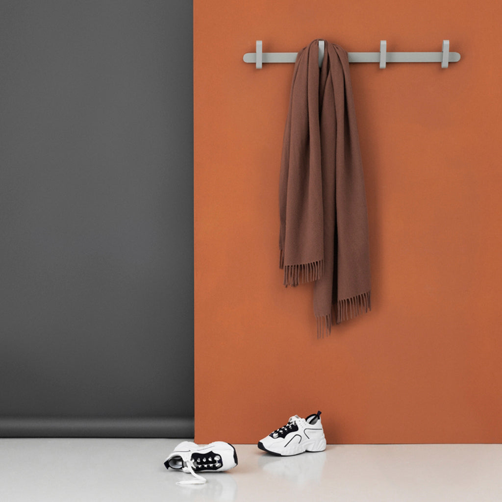 Hoop is a coat rack that elegantly adds color and practicality to your walls. The hoops allow you to hang scarves, umbrellas or hangers more easily in the hallway, and the combination of wood and steel gives the coat rack a soft and inviting design. With pegs shaped as hoops rather than hooks, the coat rack’s hollow spaces offer an additional place to hang accessories.