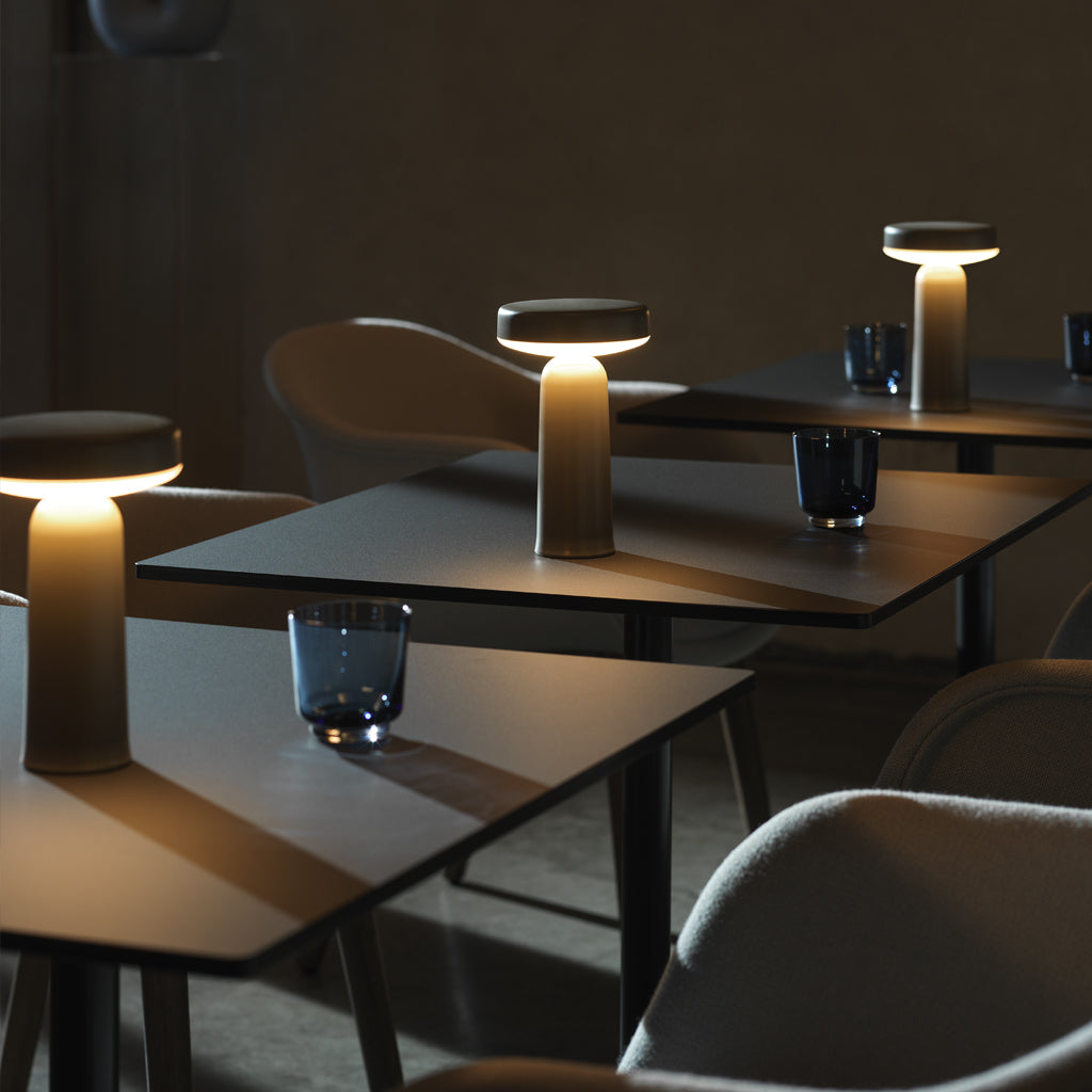 Inspired by shapes of traditional table lamps, the Ease Portable Lamp transforms this typology into a transportable size suitable to take wherever. Ease offers a high-quality dimmable, no-glare light with 3 levels, striking a balance between atmospheric and functional light. The design has a distinct lightness to it, with the top and bottom gently touching. A slightly flared bottom mimics the lip of a vase in a grounding gesture that allows the base to be slimmer and easier to grab. Ease Portable Lamp is a humble friend with a strong character that works alone or in repetition in any setting; from the bedside, reading nook and home office to the café table, co-working space or library.