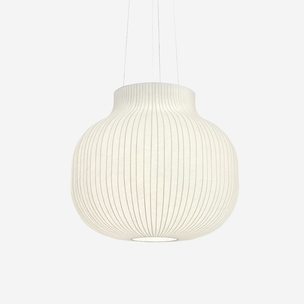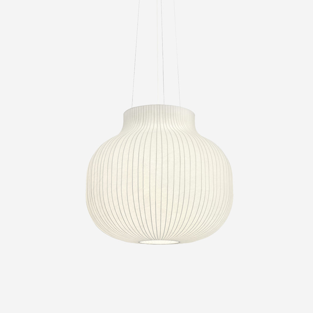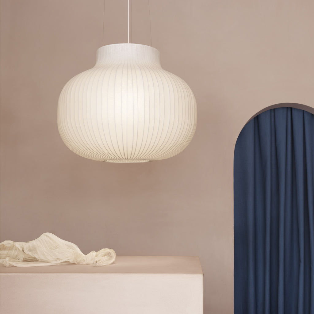 The Strand Pendant Lamp is designed with soft, playful forms for a modern expression. The design provides both diffused lighting and direct lighting, the latter through its top and bottom opening. The design is made in a sprayed cocoon material that consists of tiny strands for a complex, intriguing structure that, paired with its modern form, gives the Strand Pendant Lamp an almost cloud-like appearance. With its cocoon material filtering light through for a warm, comfortable glow, the Strand Pendant Lamp hovers lightly in space, bringing comfort, harmony and a refined sensitivity to any room.