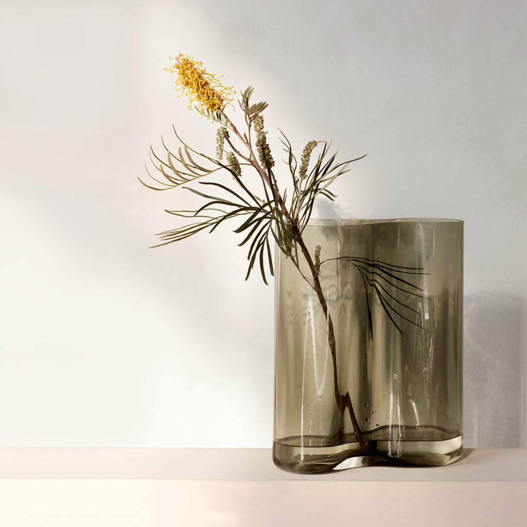 Inspired by the spiralling movement of air, often seen through smoke or mist, the new Aer vase by Gabriel Tan for MENU brings sculptural appeal to surfaces. Taking its name from the Latin word for air or vapour, the vase’s asymmetrical silhouette undulates in liquid-like waves to bring a tactile, almost ethereal quality to the glass. Offered in two sizes, high or low, the sculptural design is ideal paired in twos to display flowers or branches, yet looks equally beautiful as a standalone sculpture.