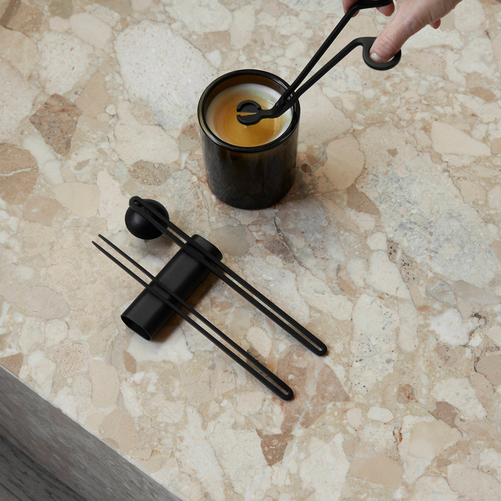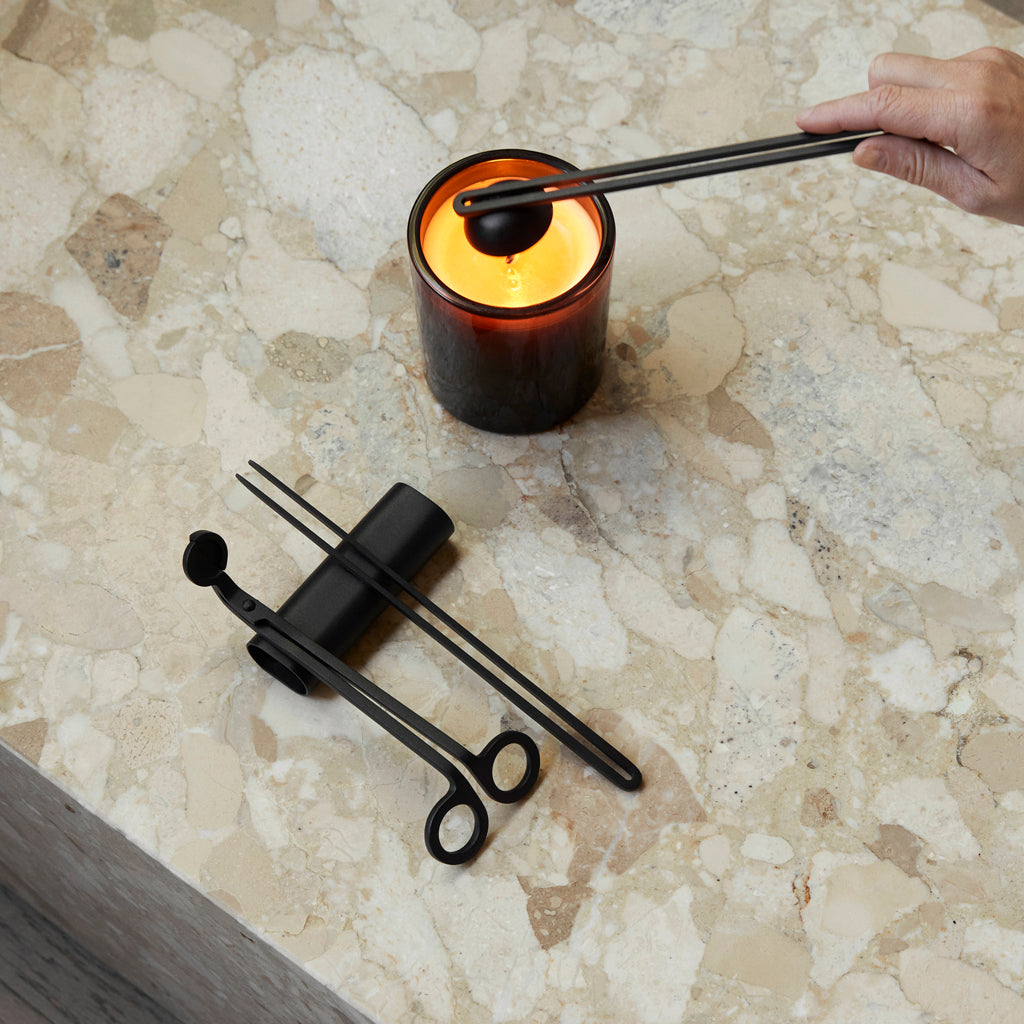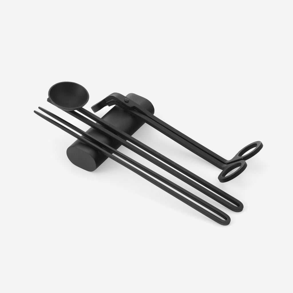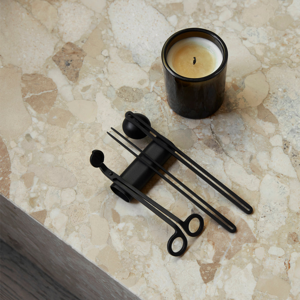 Designed for optimal candle care and performance, the four-piece Candle Care Kit includes elegant tools in powder-coated metal. A candle snuffer, wick trimmer and pick ensure less smoke and sooting, better burning and the cleaner extinguishing of flames, while the accompanying tray stores the items when not in use.