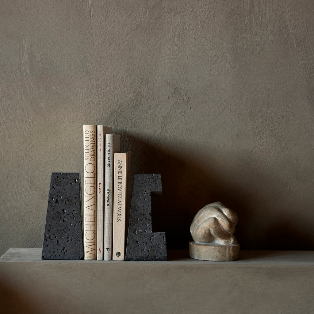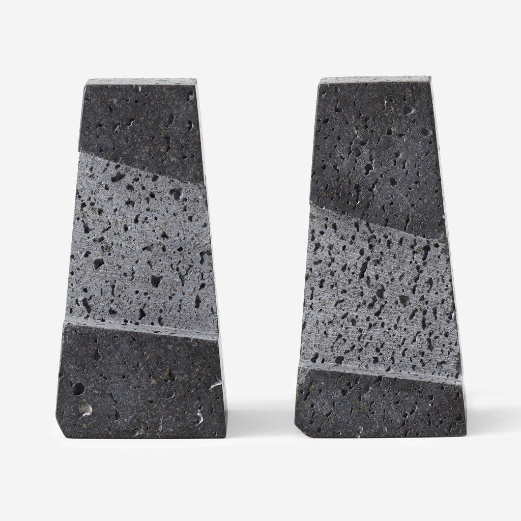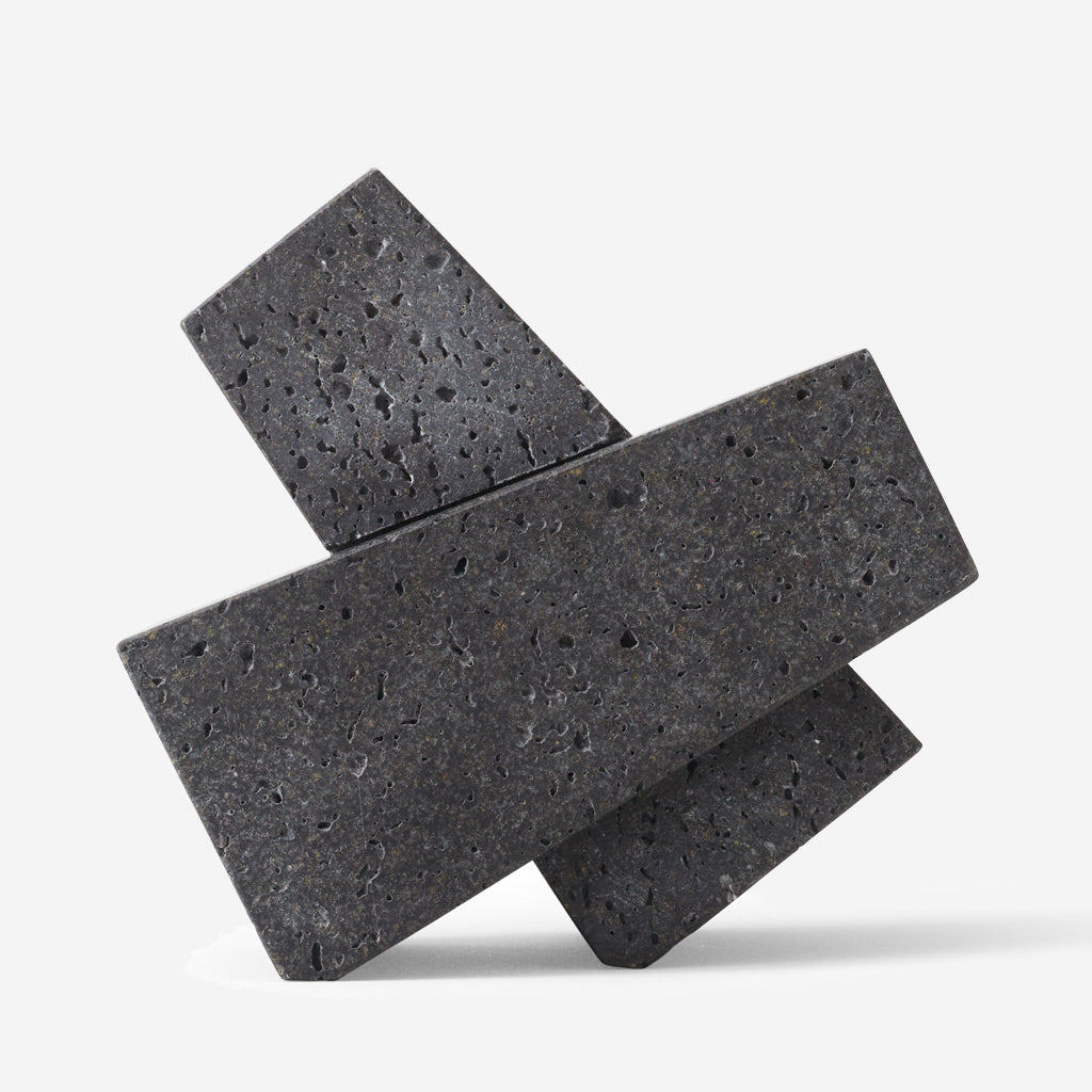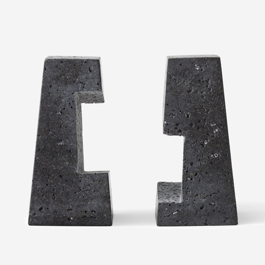 Designed to neatly hold books in place, the abstract forms of the Converge Bookends are shaped from lava stone – a dark and porous material with a textured surface. Use as intended, one at either side of a line of books, or interlock together to create a sculpture that delights with its intriguing shape and touch.