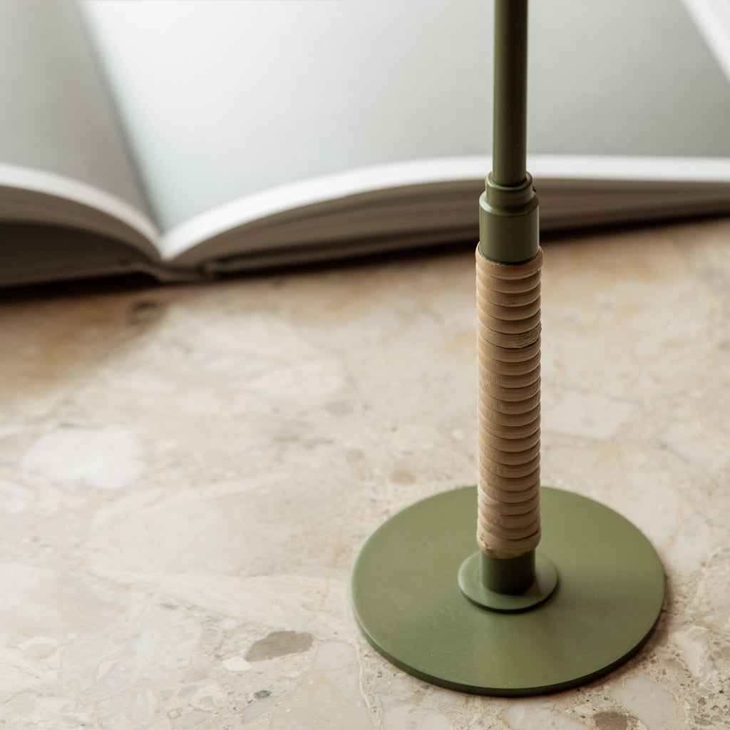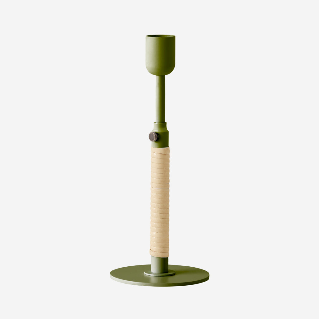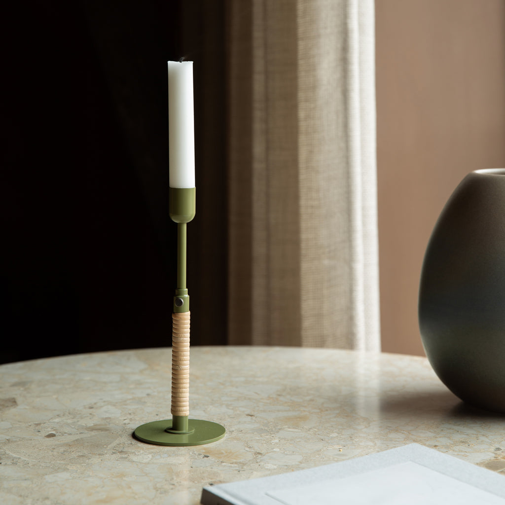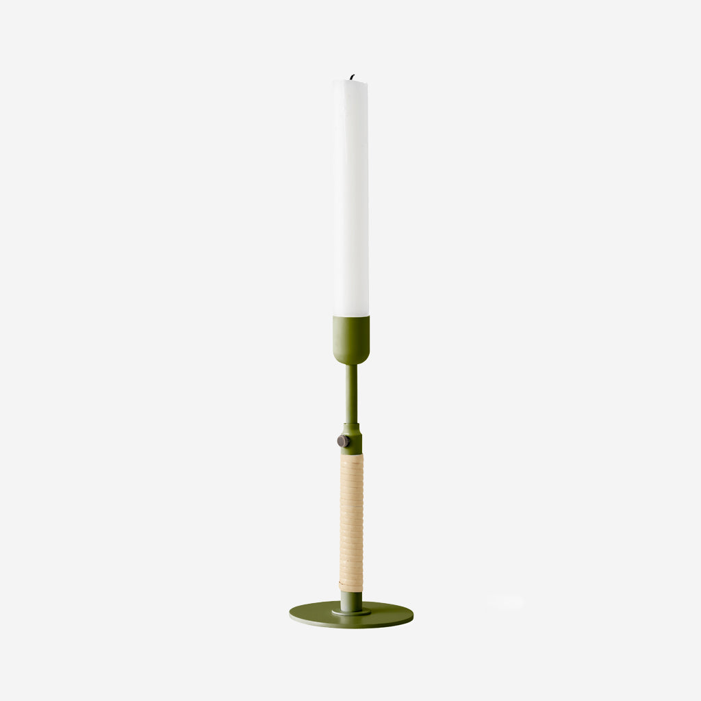 Taking its name from the latin word for “extend,” the Duca candle holder does exactly that: by loosening the screw on its slender stem, the height of the design can be adjusted as the candle burns. Cast in polished or bronzed brass and detailed with rattan enfolded around its lower half, the simple yet impactful design brings a sense of intimacy and warmth to its surroundings. Set on a circular base and stem in polished or bronzed solid brass, the Duca candle holder is detailed with rattan around its stem.