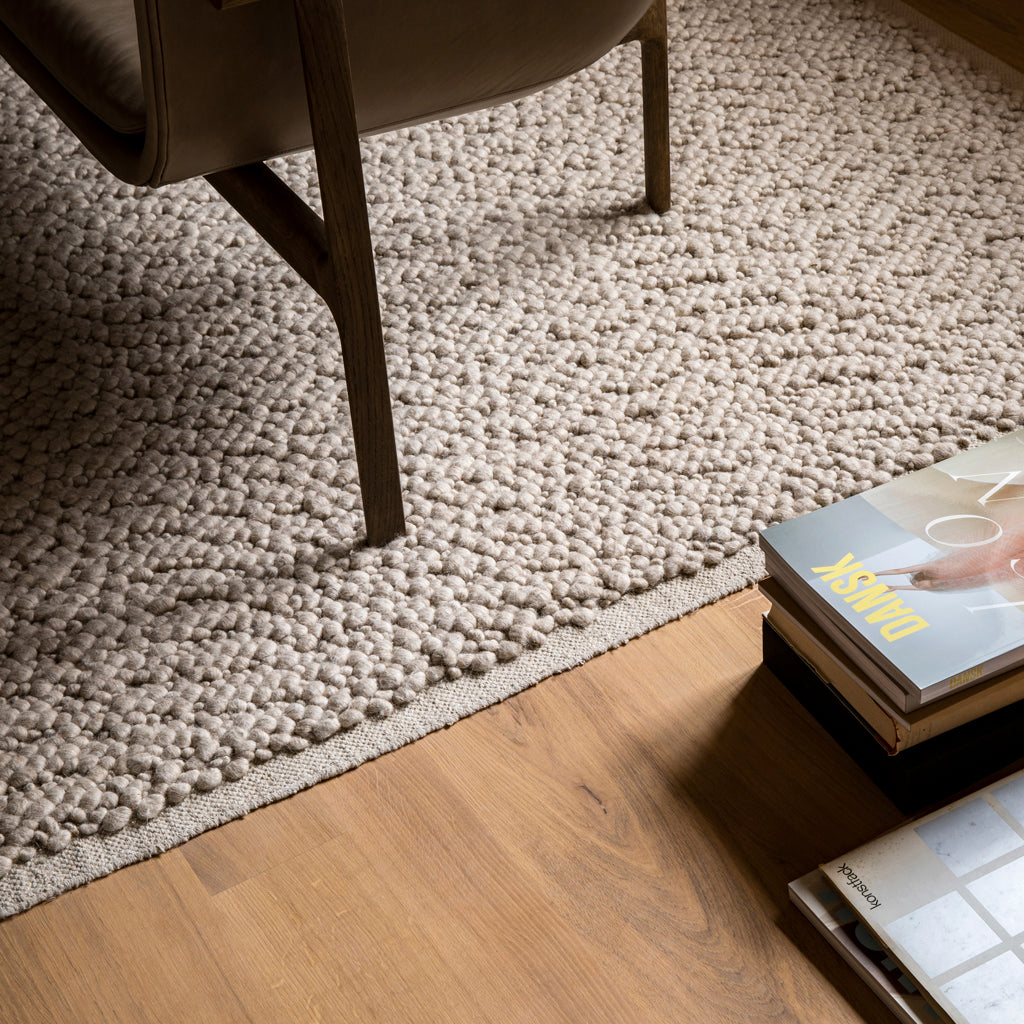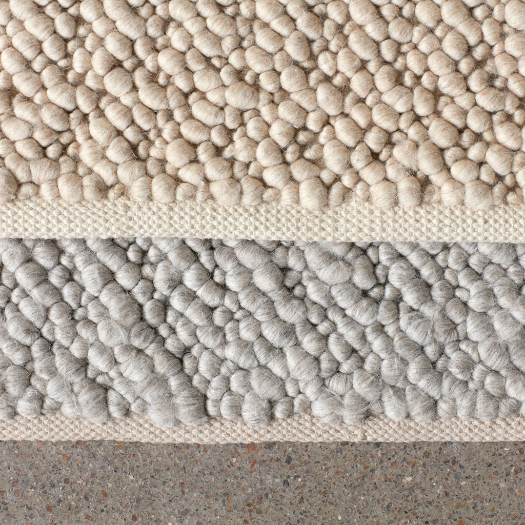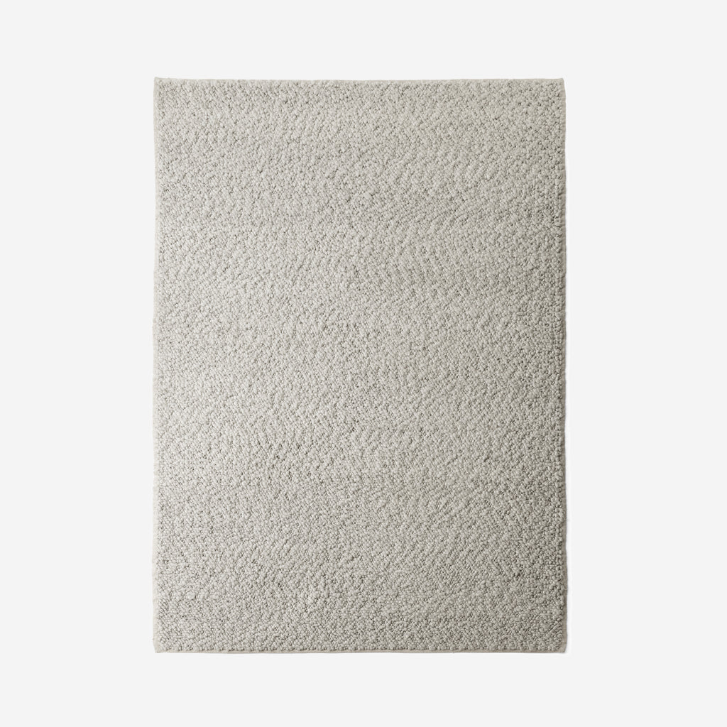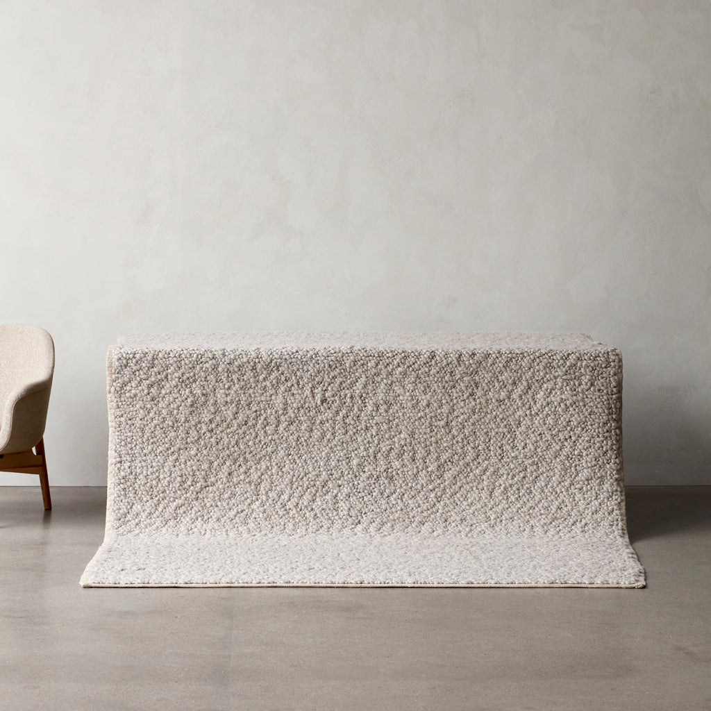 Conveying a sense of nature and celebrating natural materials, the gravel rug combines undyed wool fibers with an unexpected weaving technique that brings depth and complexity to the design.