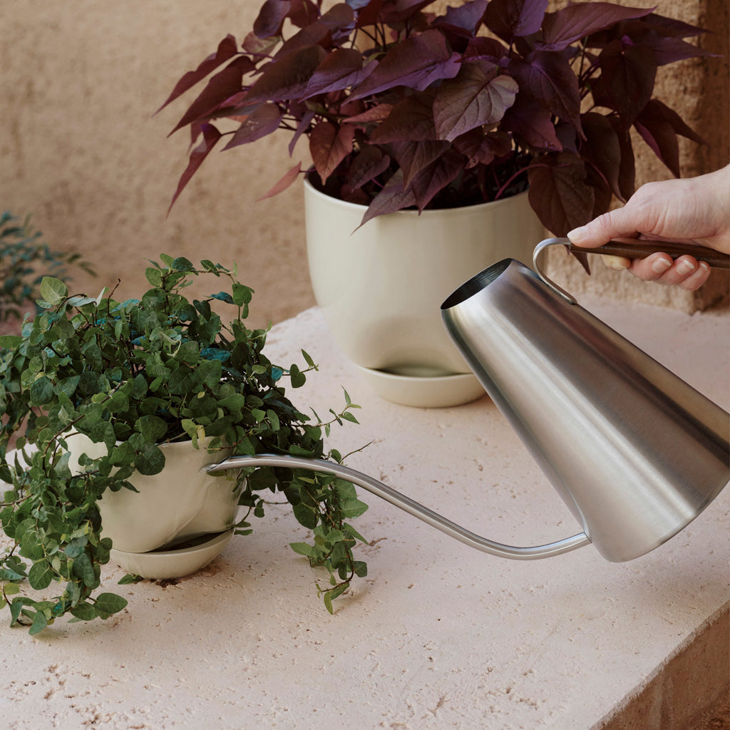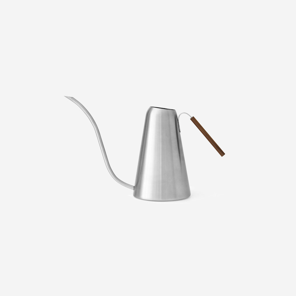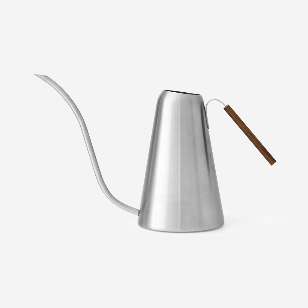 Sleek and elegant, the Hydrous Watering Can features a long pouring spout designed to reach small potted plants or through thick foliage. The brushed stainless steel design has a wooden handle, offsetting the curved lines of the container while ensuring a good grip.
