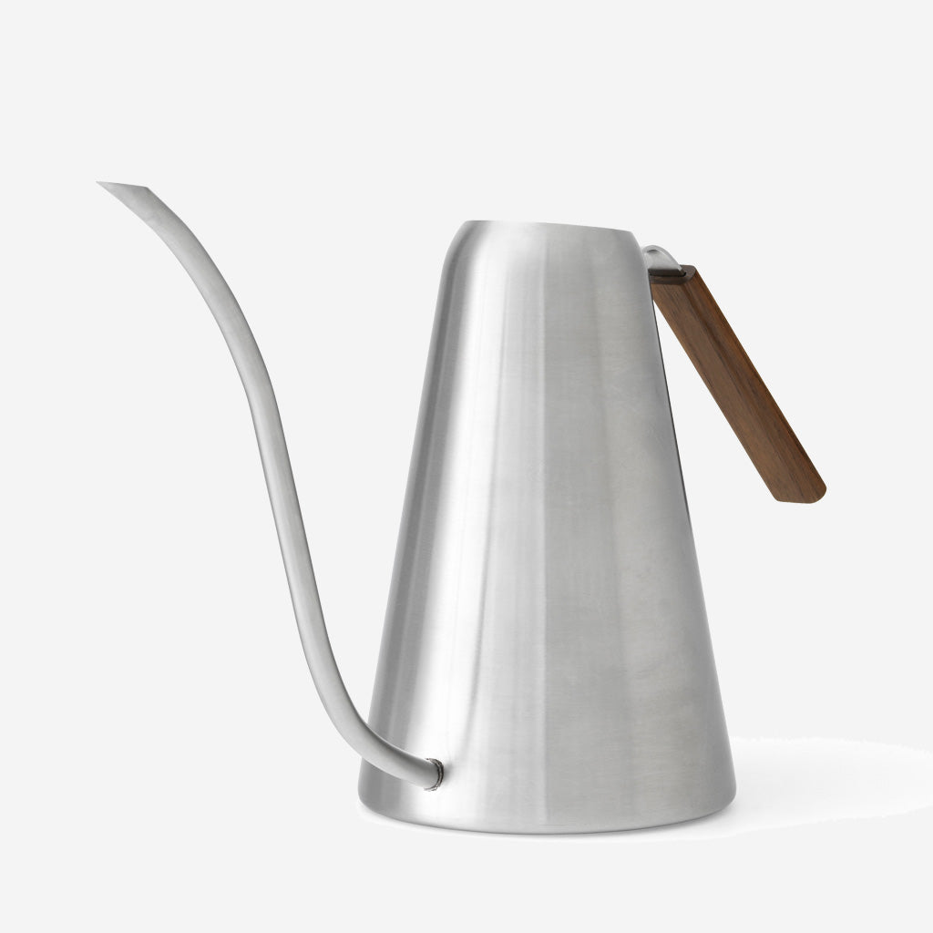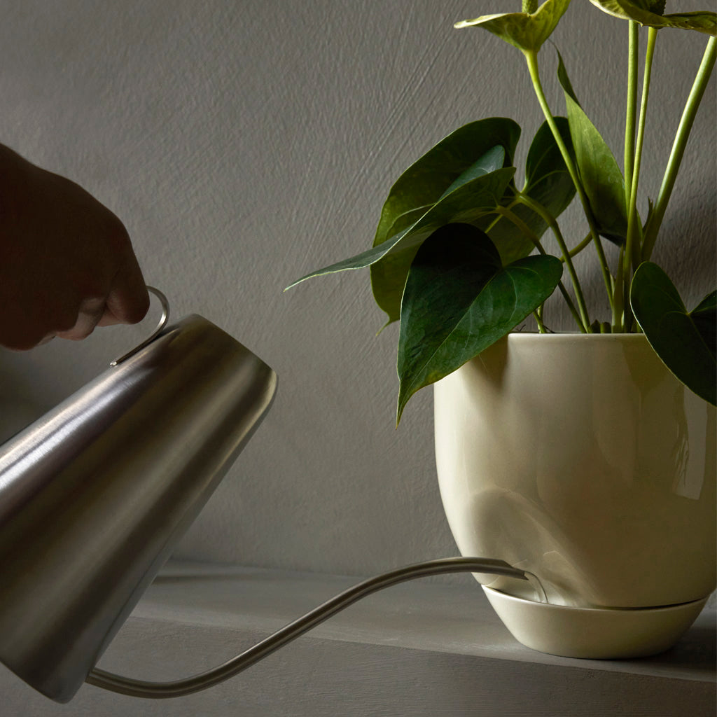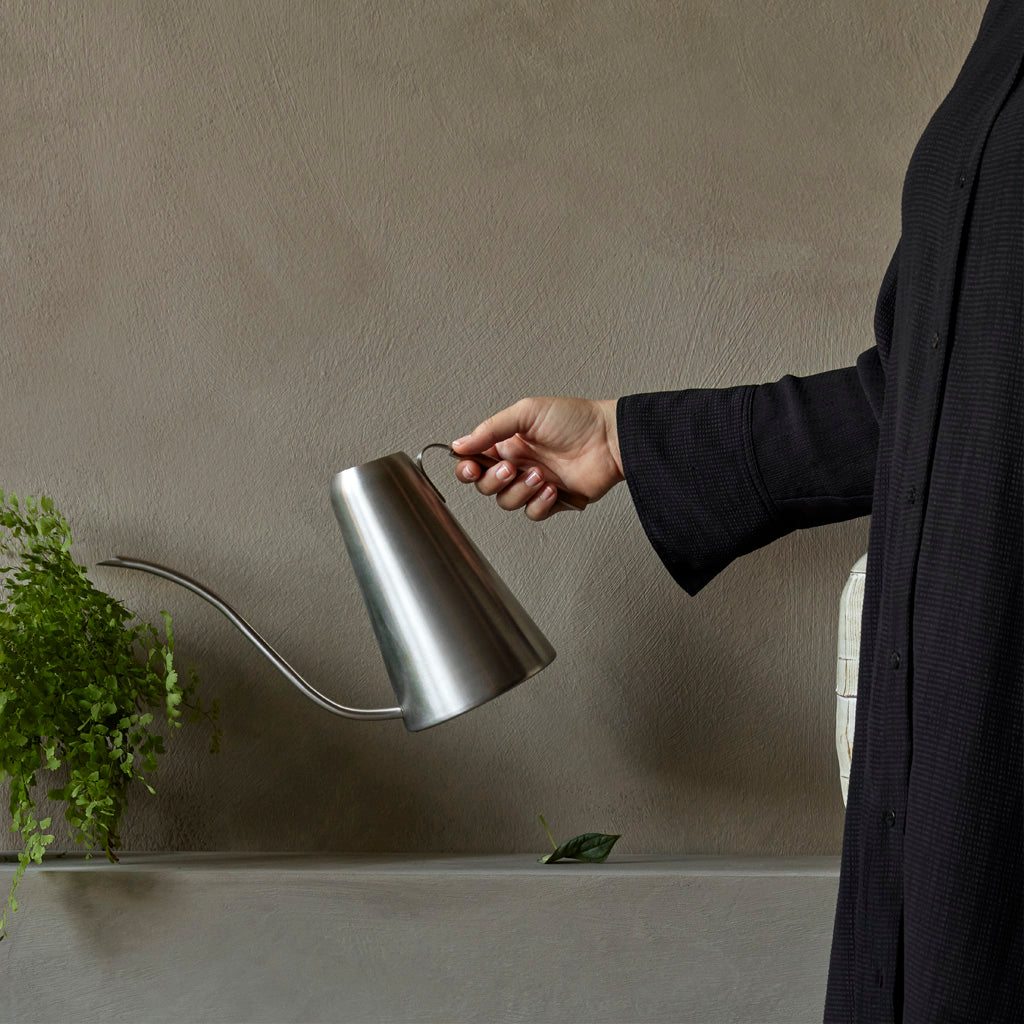 Sleek and elegant, the Hydrous Watering Can features a long pouring spout designed to reach small potted plants or through thick foliage. The brushed stainless steel design has a wooden handle, offsetting the curved lines of the container while ensuring a good grip.