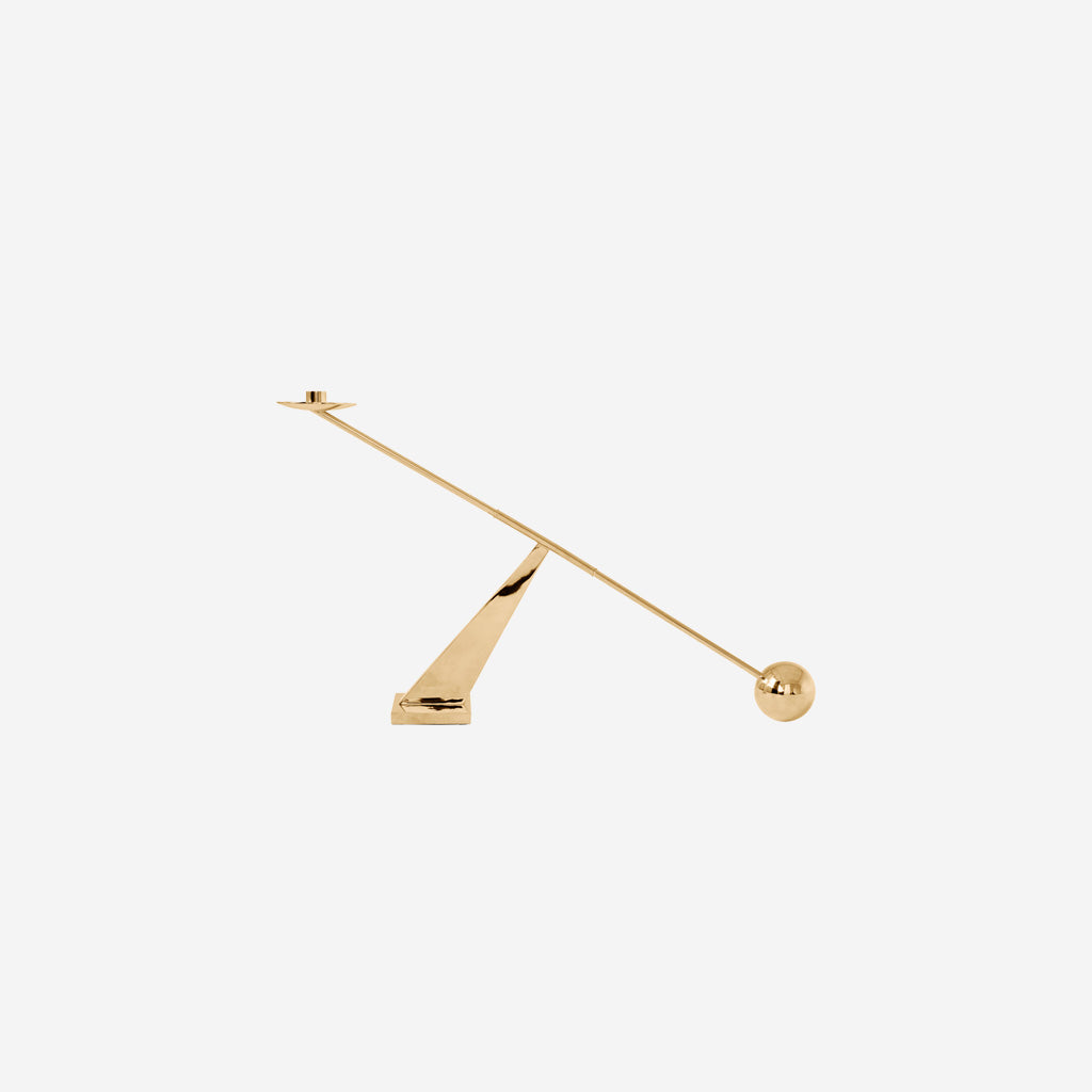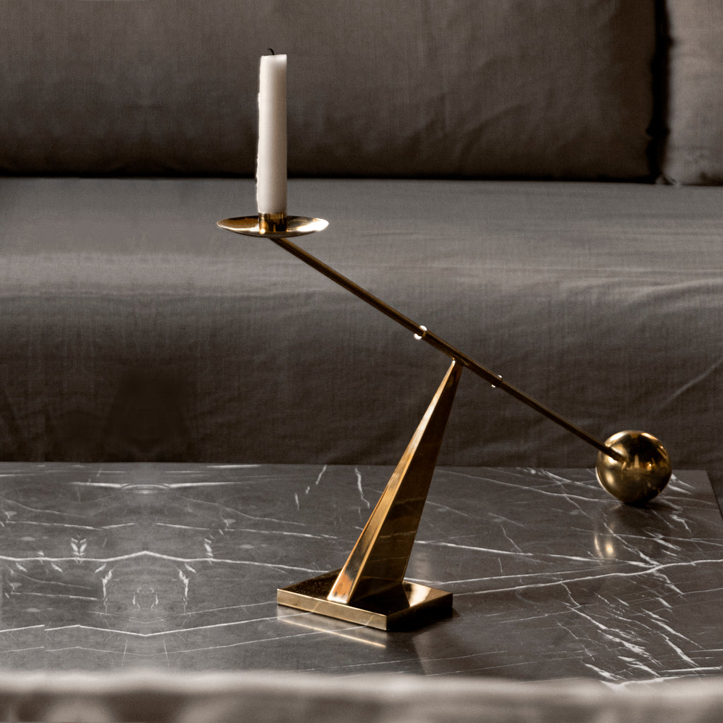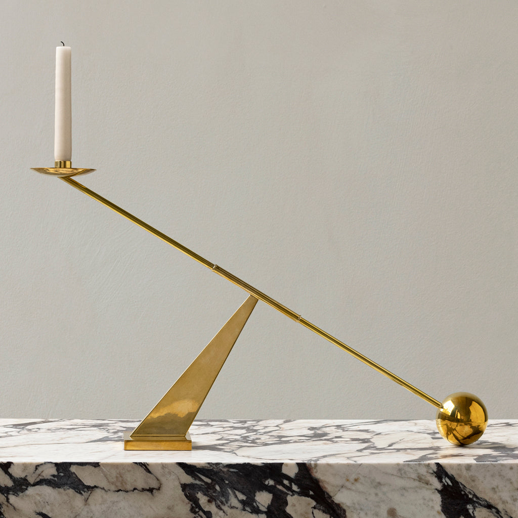 Interconnect Candle Holder is a bold and illuminating centrepiece of exaggerated proportions, designed for Audo by Colin King. As a source of cosy candlelight, it is characterised by its deceptively simple geometric form: a sphere, an angle and a line, which unite to create a unique design. Available in polished brass or painted steel, it goes beyond its intended use to function as a sculpture.