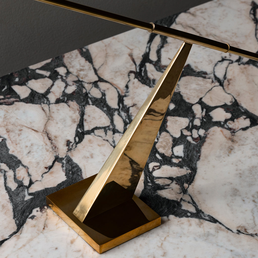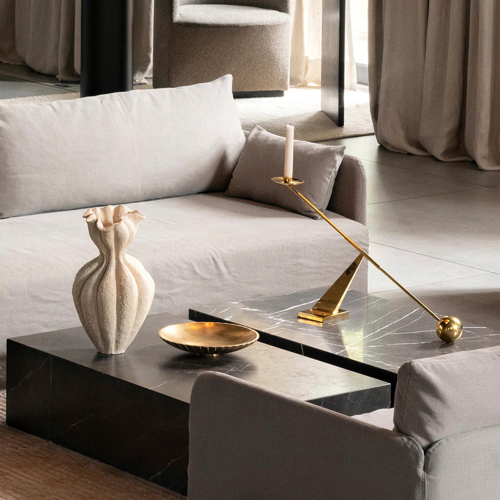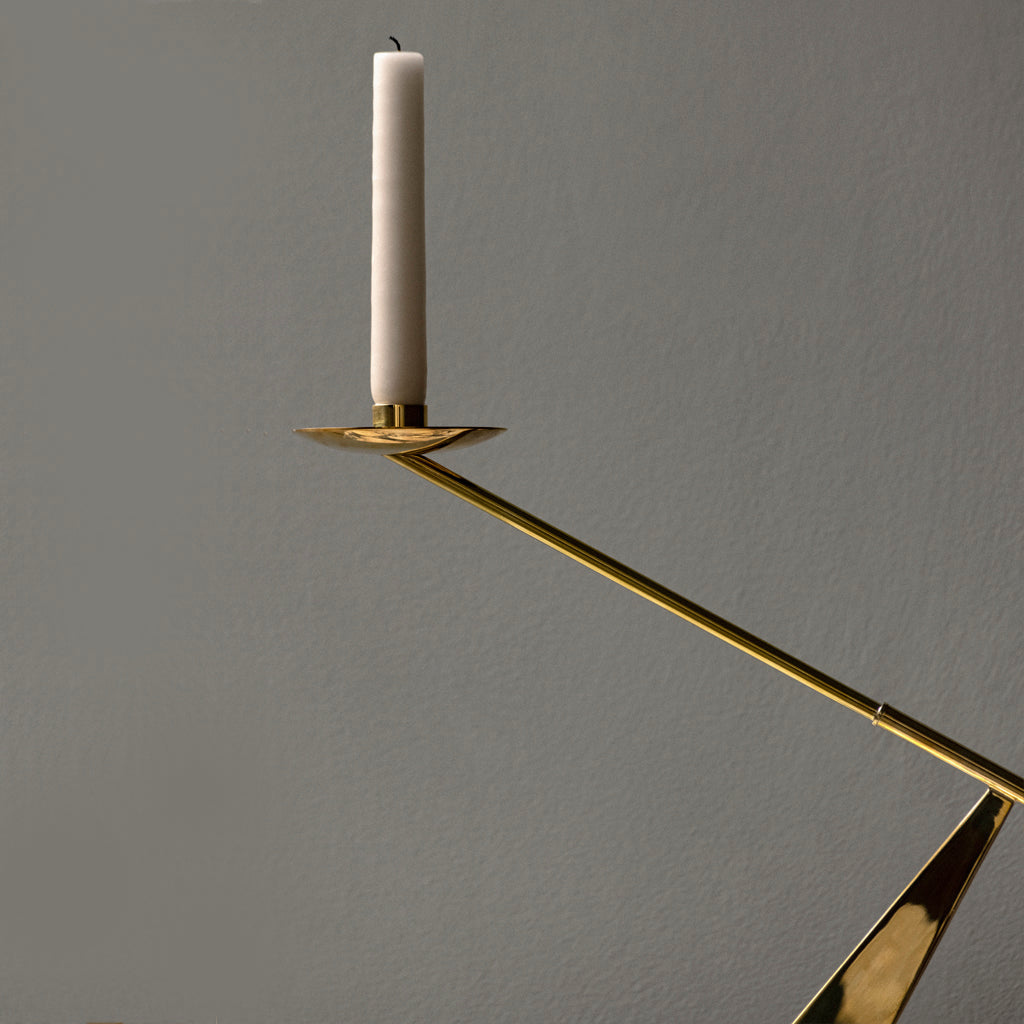 Interconnect Candle Holder is a bold and illuminating centrepiece of exaggerated proportions, designed for Audo by Colin King. As a source of cosy candlelight, it is characterised by its deceptively simple geometric form: a sphere, an angle and a line, which unite to create a unique design. Available in polished brass or painted steel, it goes beyond its intended use to function as a sculpture.