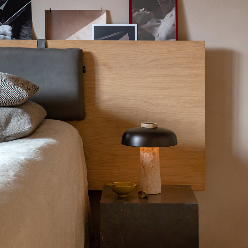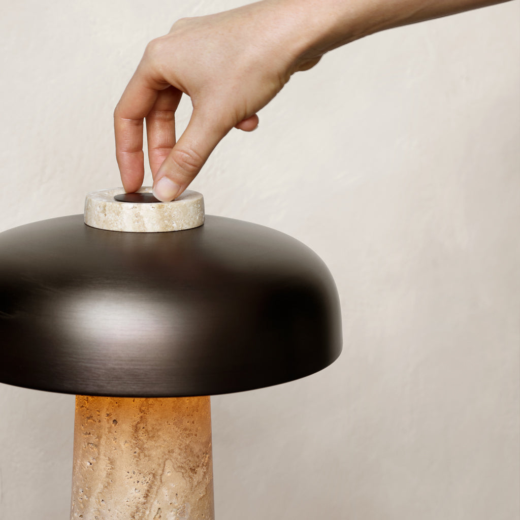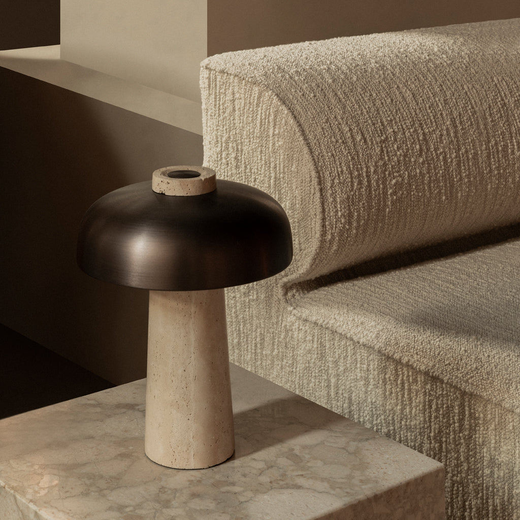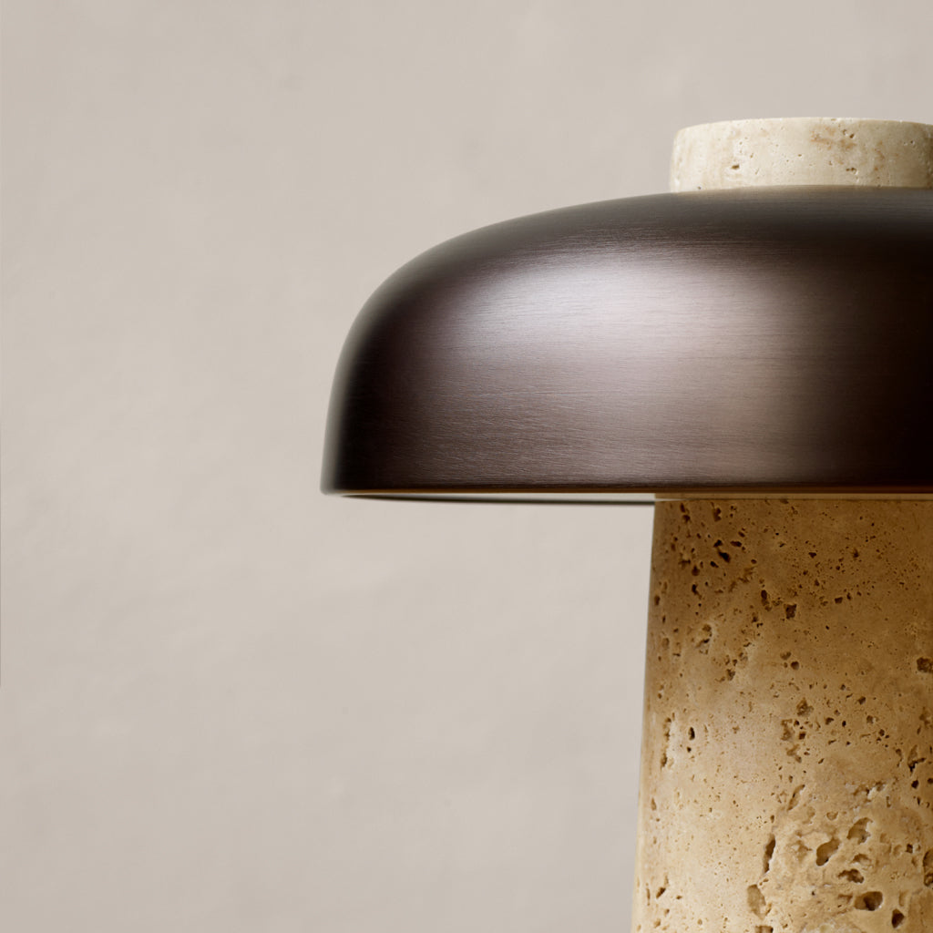 In his search for simple and clever solutions in any given space, Danish designer Aleksandar Lazic looked to Italian marble tables from the 1970s when creating the Reverse Lamp. Inspired by the play on structure created by geometric constraints, the conical travertine base and curved, bronzed aluminium shade define the lamp’s perfectly balanced expression. The light diffuses evenly across the unworked stone, left raw to allow the light to highlight its natural imperfections, revealing shadows and an intriguing colour play that seems to stem from the base itself.