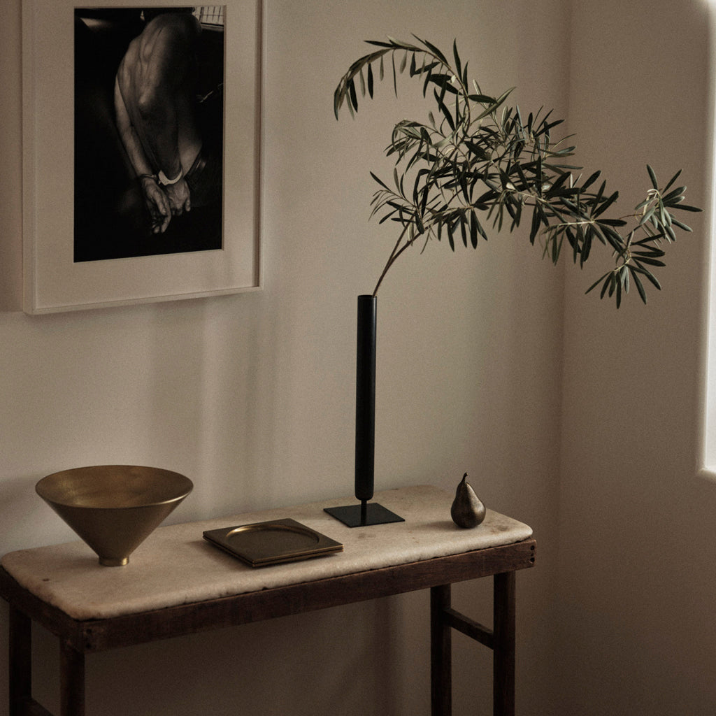Simple. Sophisticated. Sculptural. The Stance Vase is inspired by traditional display stands to provide support for branches or long-stemmed flowers. The bronzed brass vase patinates beautifully over time and the understated design lends itself to any setting. Available in two sizes.