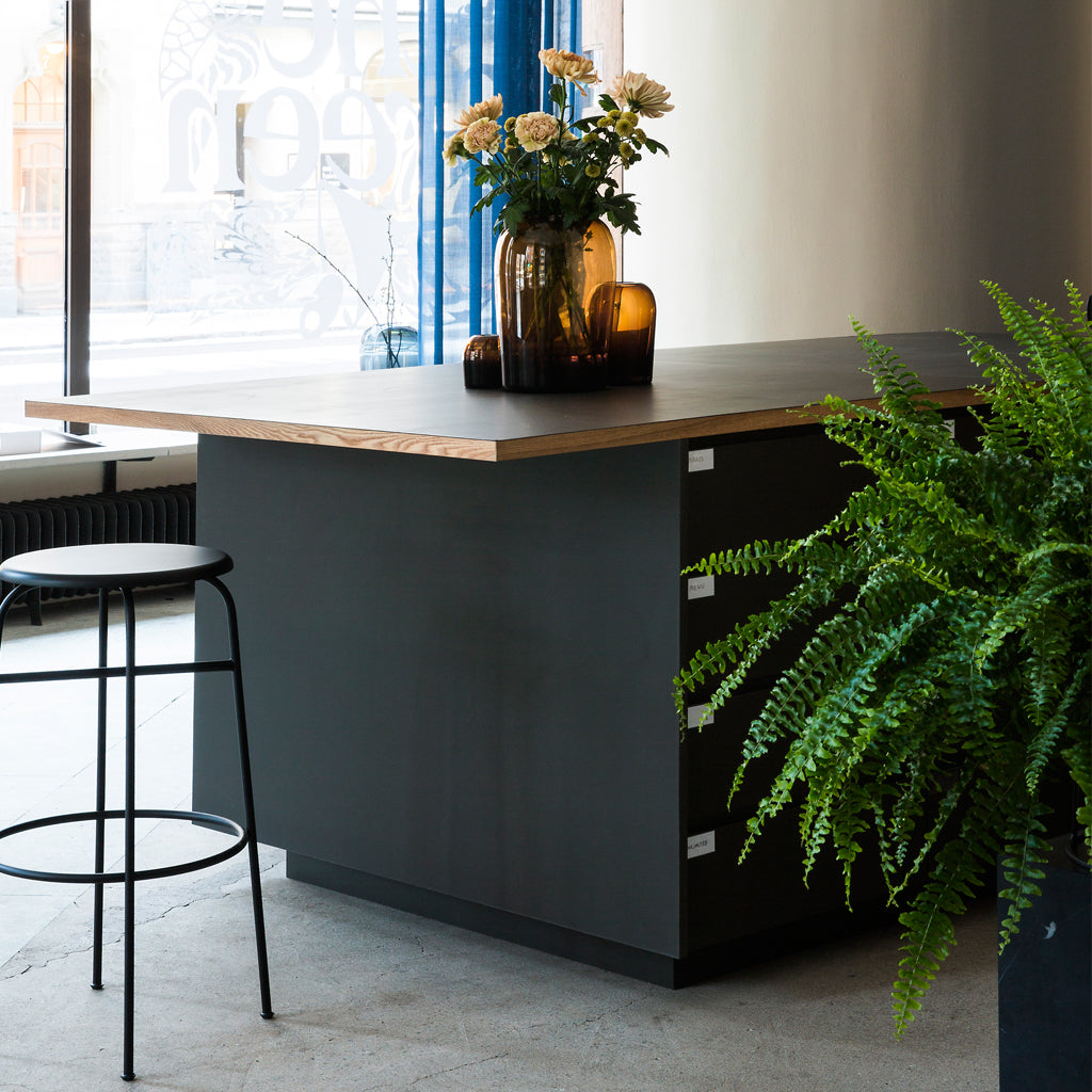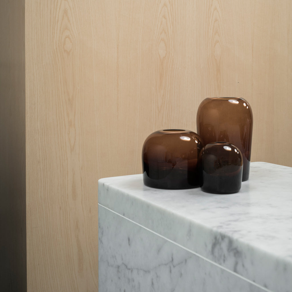 The idea behind the Troll Vase started as a study of the properties of glass – examining how the intensity of colour changes depending on the thickness of the material. The result is a vase featuring a dynamic change of thickness throughout, from solid coloured base to thin trans- parent bubble-like top. Troll takes its name from a painting by the famed Norwegian artist Theodor Kittelsen, depicting a mythological water spirit, Nøkken, rising from the dark waters of a forest pond. This is a wonderfully rounded vessel with a unique expression. Available in three sizes.