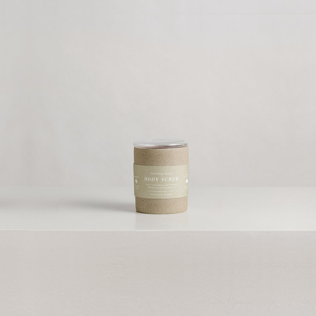 Native Ground Wattleseed & Pink Ochre, with Blue Cypress & Macadamia Oil. An invigorating and energizing body scrub experience. For a deeply relaxing and remedial experience, simply pour the mixture into your hands. Rub your hands together and then apply to your body – moving in a circular motion. Rinse off the mixture from your skin, by showering or submerging in a bath. Wash lightly with soap to remove excess particles and oil. Alternatively, use as a bath soak. Simply pour the mixture into a running bath, and soak in the solution.