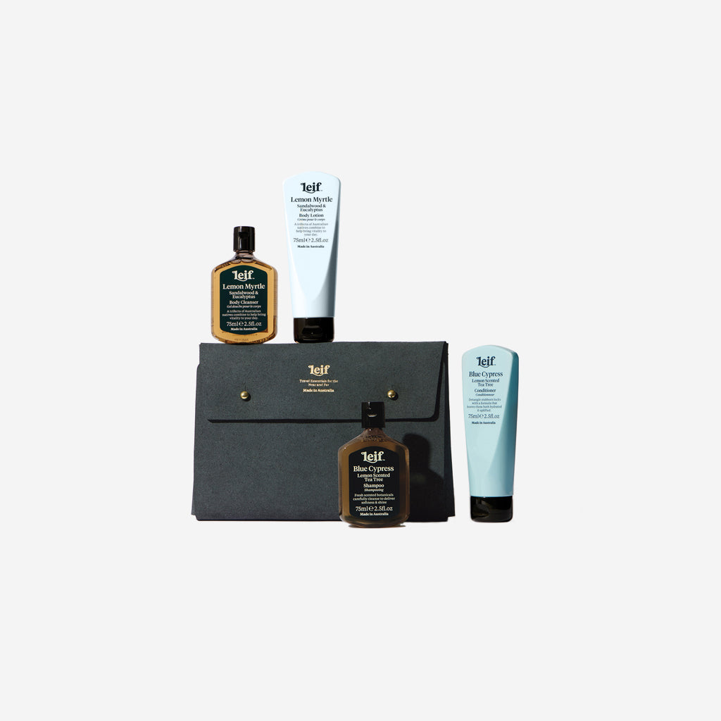 A quartet of travel-sized products for use on-the-go. Find a Lemon Myrtle body cleanser and lotion duo to revive and energise. Follow with the Blue Cypress shampoo and conditioner to nourish the scalp and smooth the hair. Perfect for both long haul journeys or short weekends away, each kit comes in a sustainable pouch crafted from 80% regenerated leather