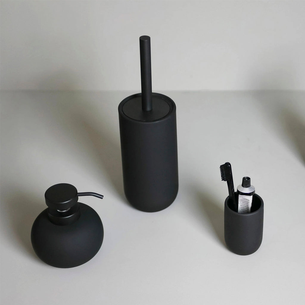 Elevate your bathroom with Mette Ditmer's Lotus low soap pump in black. The matte rubber coated ceramic and soft curved design will add a touch of elegance to any bathroom aesthetic. Complete the look with the matching dispensers in the same series.