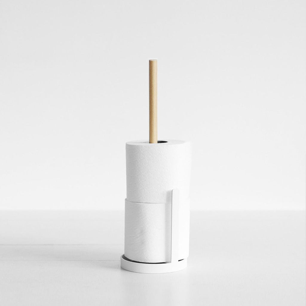 This stand by Yamazaki is small enough to barely take up any space in a bathroom. It has an elegant design, and holds up to 3 rolls. It really brightens up the bathroom, and is easy to move and restock.