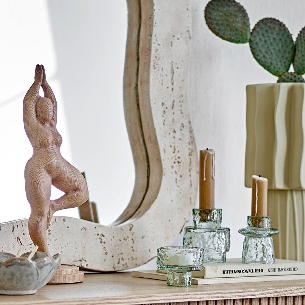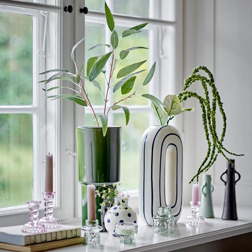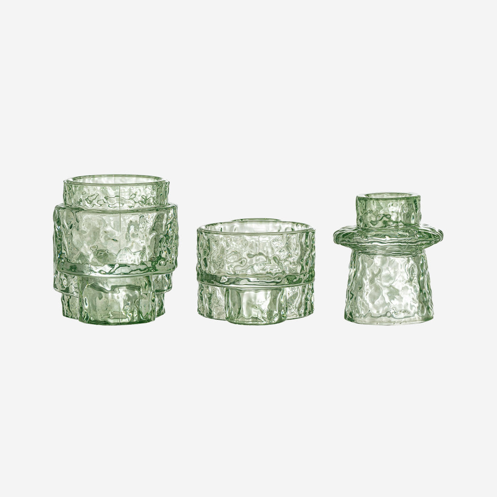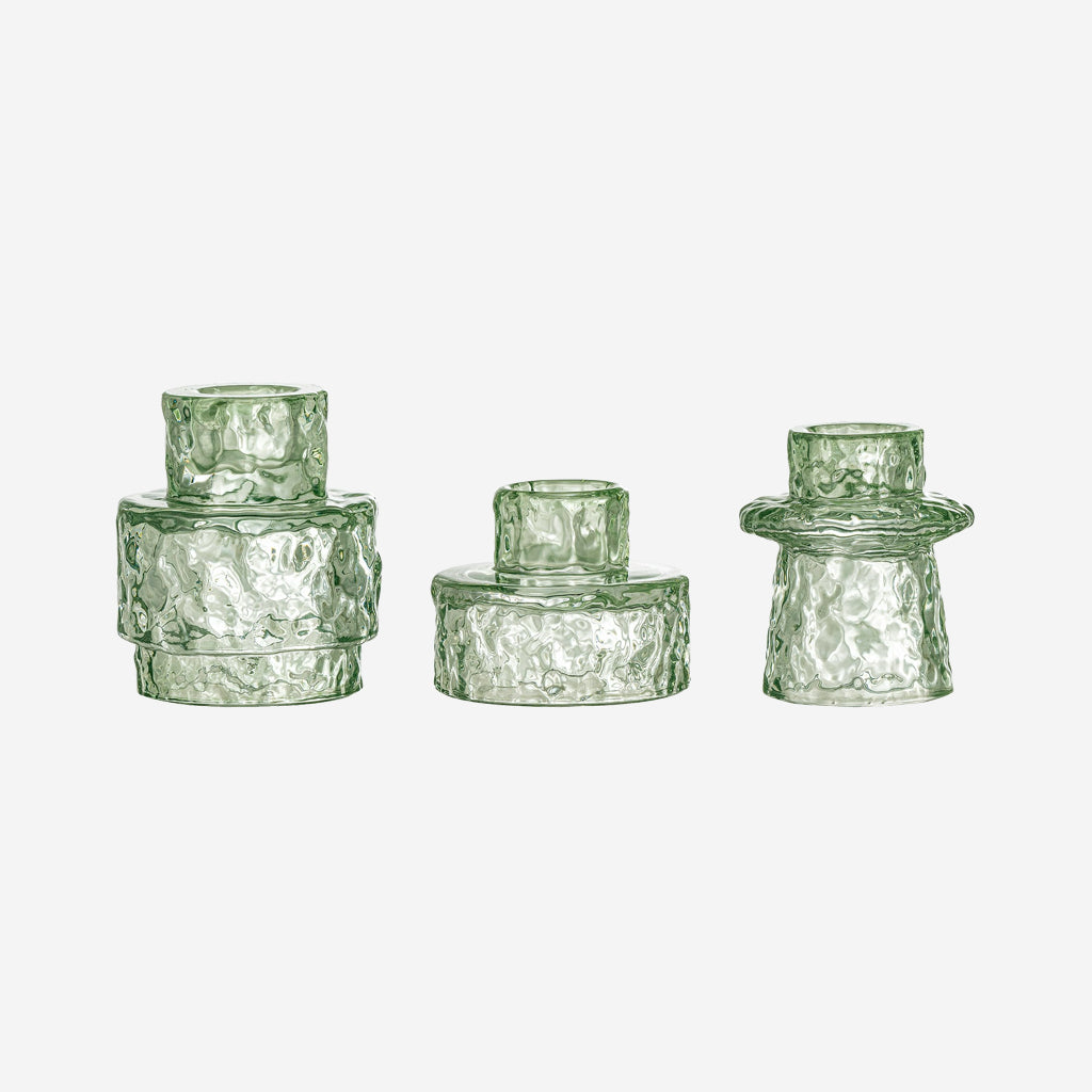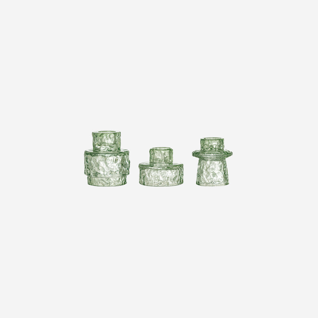 The Delphia Candle Holder by Bloomingville is a set consisting of three glass candle holders in a beautiful green color. The set includes three different sizes, one of which can be turned upside down and used as a tealight holder. The bubbled design and soft color make these candle holders ideal for creating a cozy atmosphere in your home, whether placed together or separately.