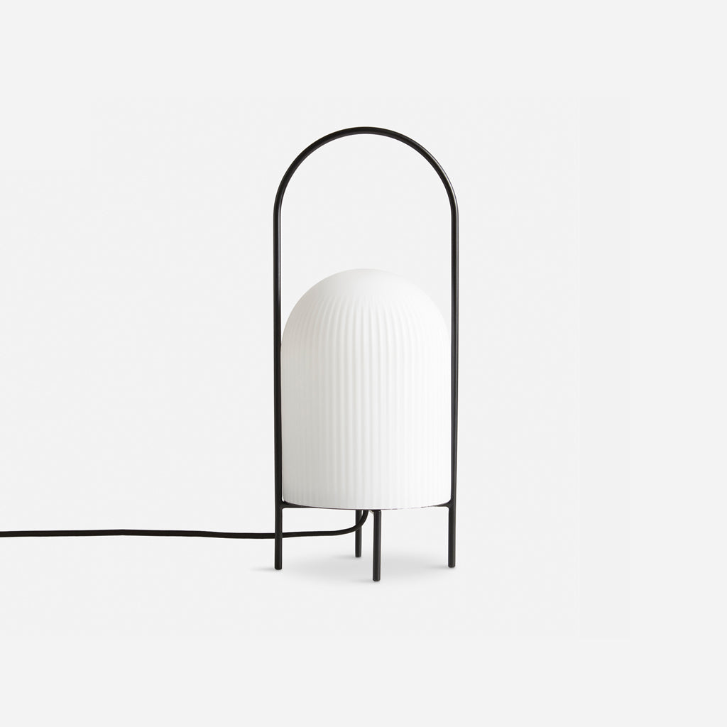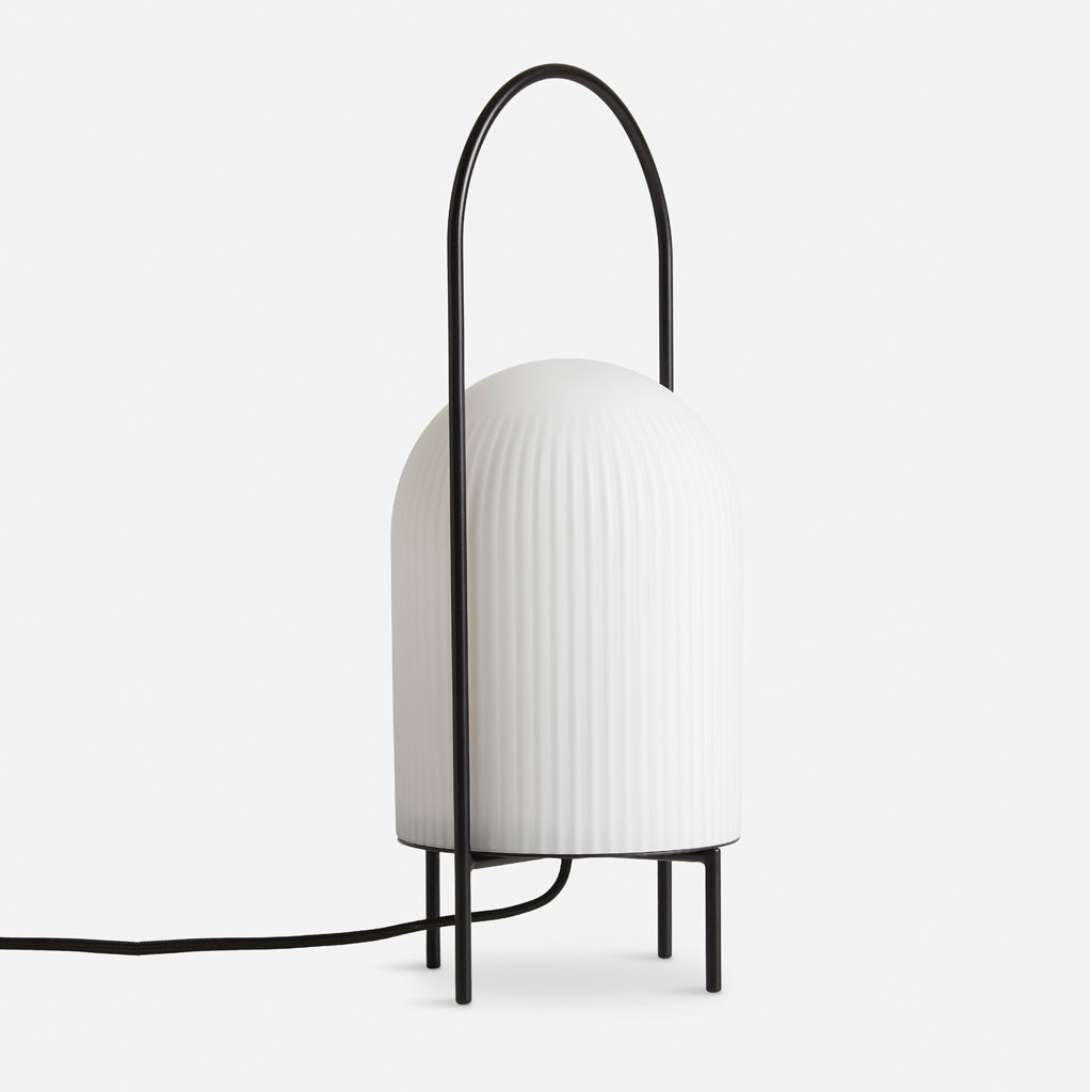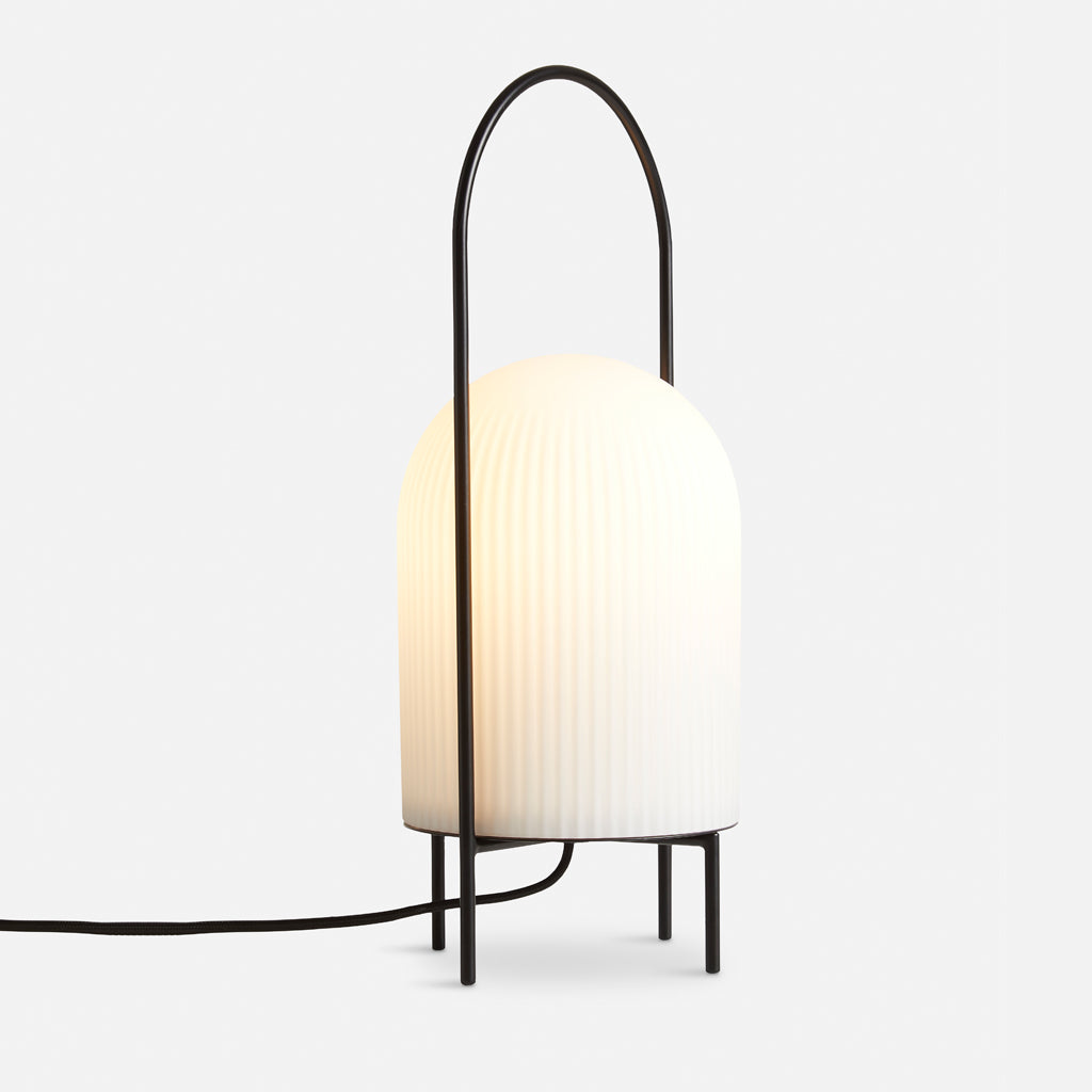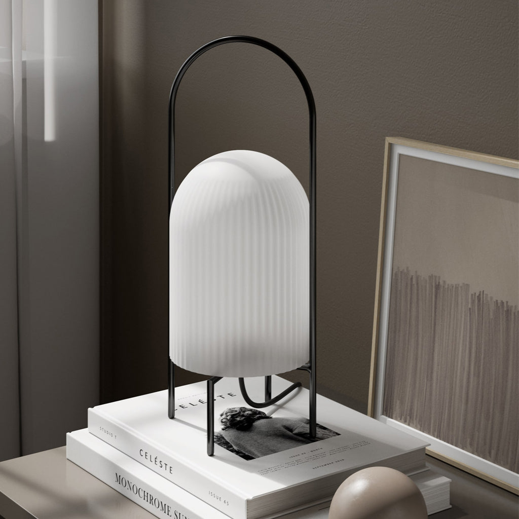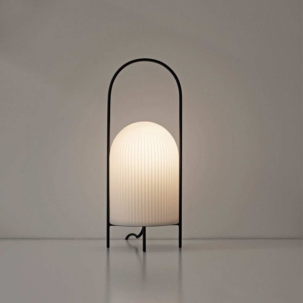 The Ghost Table Lamp is a modern interpretation of antique portable oil lanterns. The slim metal rod surrounds the lampshade protectively while the overarching bail functions as a handle for carrying the lamp around. Made of translucent opal glass, the shade gives an illusion of a white cloth thrown over the light source, resembling the appearance of a friendly ghost in the air. The subtle vertical groove rippling pattern on the surface fades out gradually upwards, emphasizing the lamp’s refined sculptural character.