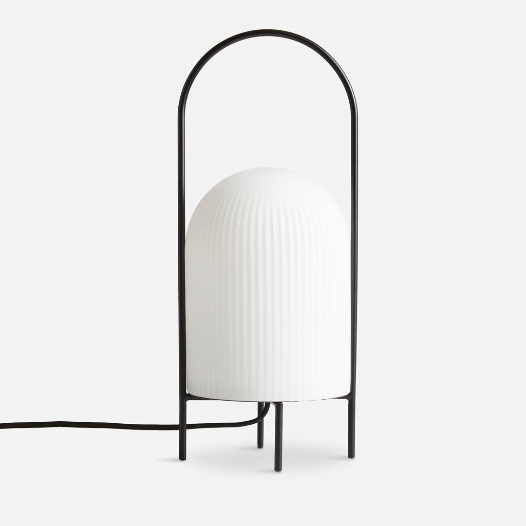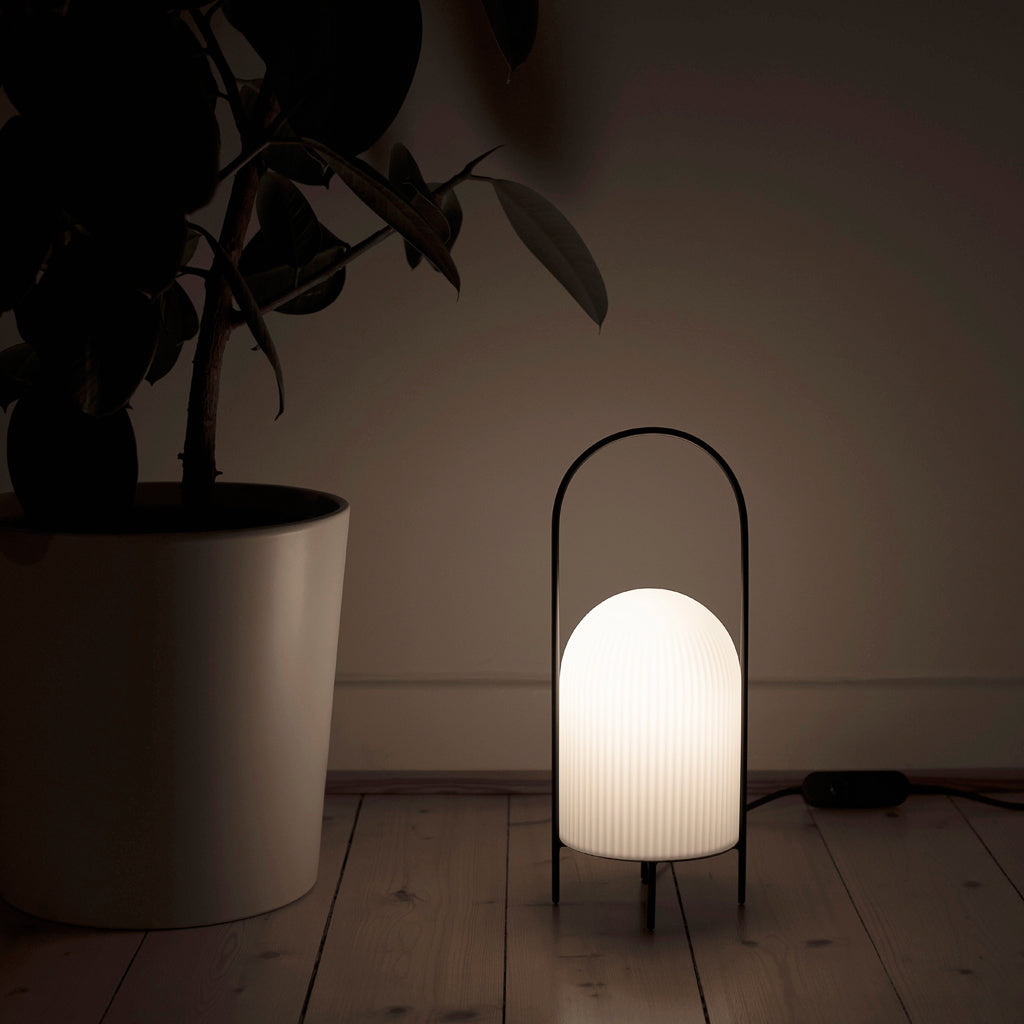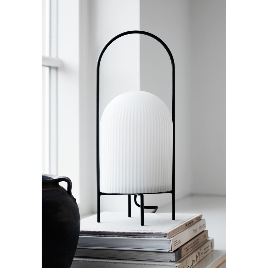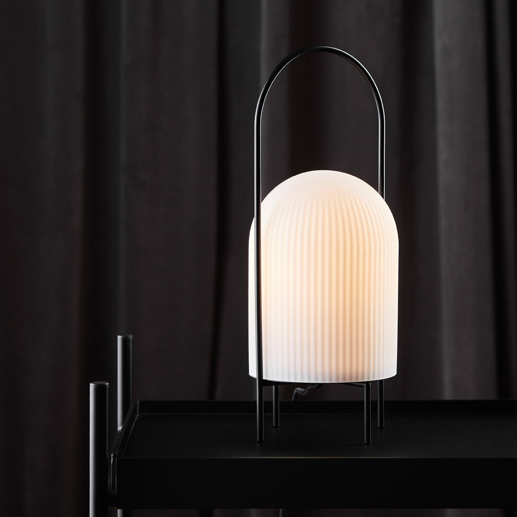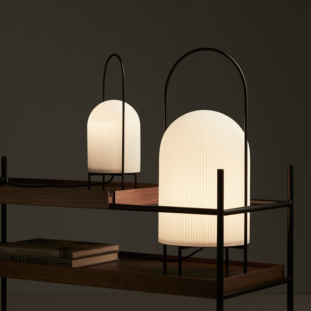 The Ghost Table Lamp is a modern interpretation of antique portable oil lanterns. The slim metal rod surrounds the lampshade protectively while the overarching bail functions as a handle for carrying the lamp around. Made of translucent opal glass, the shade gives an illusion of a white cloth thrown over the light source, resembling the appearance of a friendly ghost in the air. The subtle vertical groove rippling pattern on the surface fades out gradually upwards, emphasizing the lamp’s refined sculptural character.