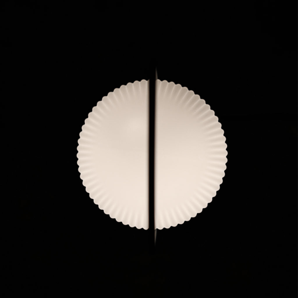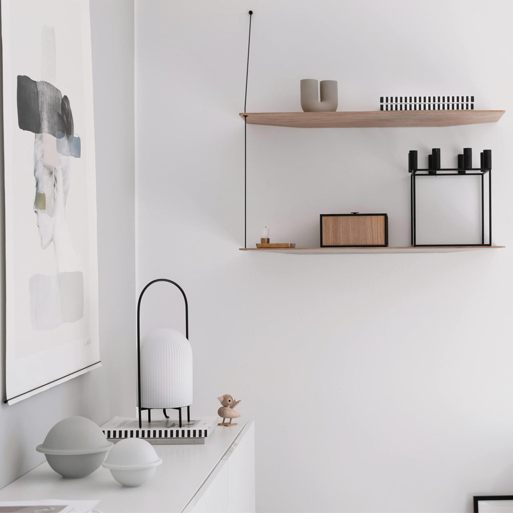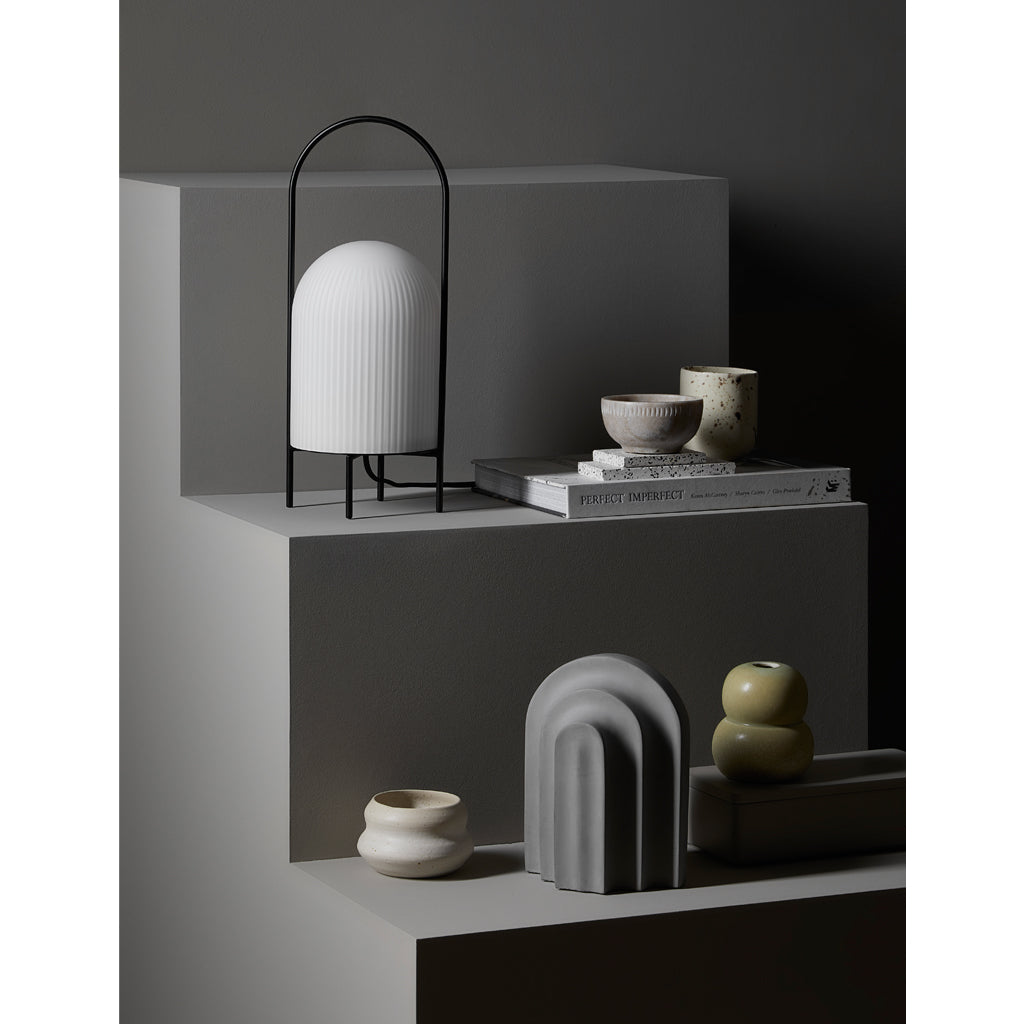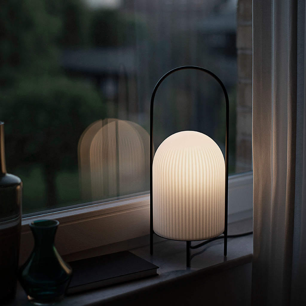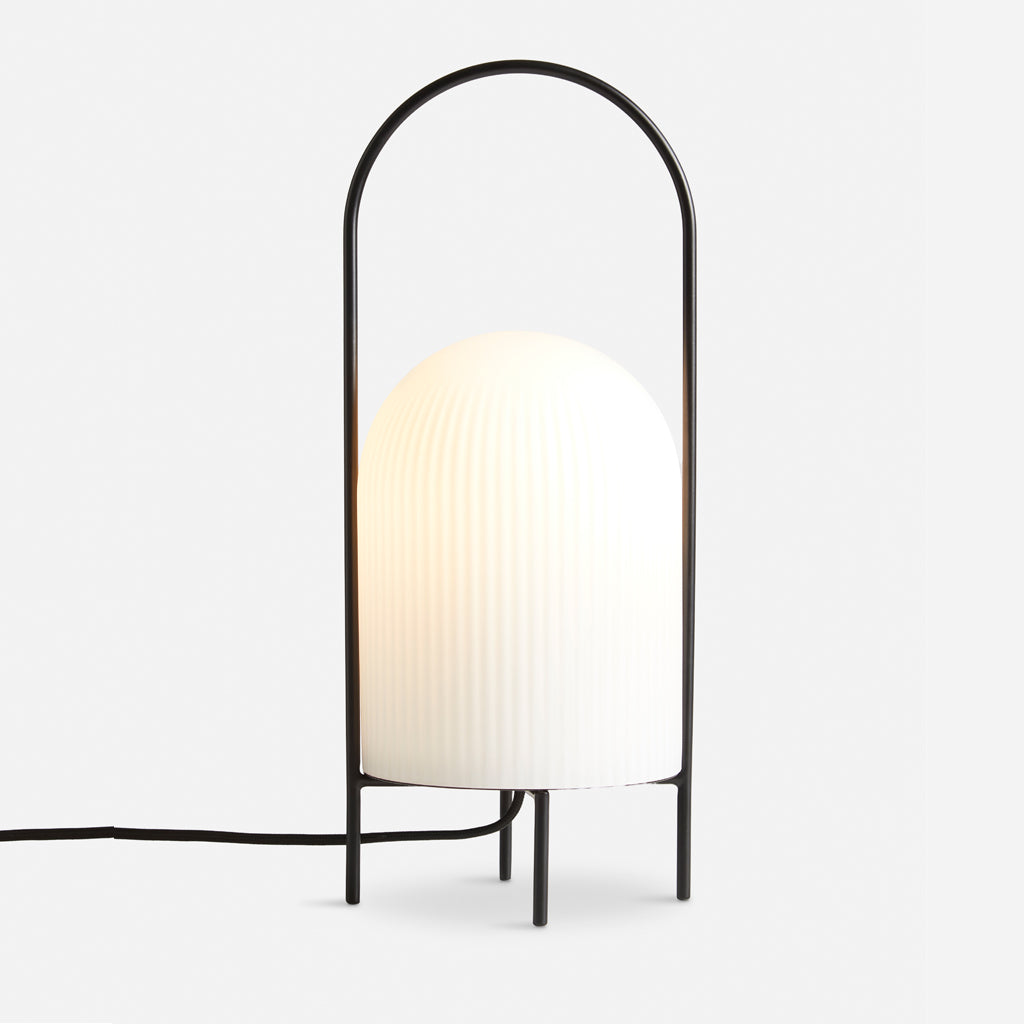 The Ghost Table Lamp is a modern interpretation of antique portable oil lanterns. The slim metal rod surrounds the lampshade protectively while the overarching bail functions as a handle for carrying the lamp around. Made of translucent opal glass, the shade gives an illusion of a white cloth thrown over the light source, resembling the appearance of a friendly ghost in the air. The subtle vertical groove rippling pattern on the surface fades out gradually upwards, emphasizing the lamp’s refined sculptural character.