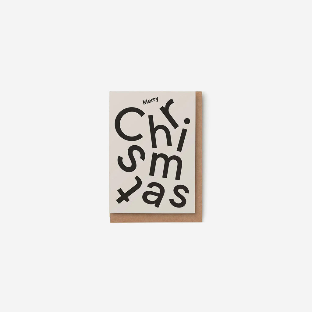 A Christmas card for the type lovers you know, part of our Type card and gift wrap range. Printed on sustainable textured stock and accompanied by a luxury GF Smith Kraft envelope. Comes in a compostable cello unless specified at the checkout. Front reads 'Happy Christmas'.