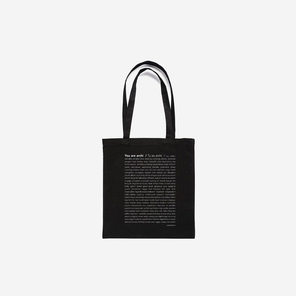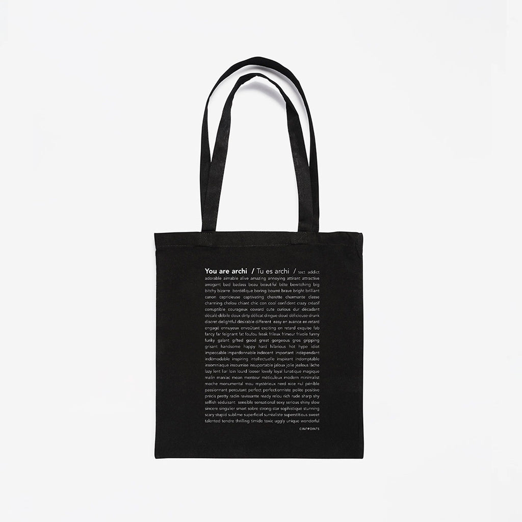 You are super cool, brilliant, creative, competent, courageous, gifted, independent, unforgivable, intellectual, meticulous, stingy, sensitive, sincere, tender, shy, unique and so many other things! Tote bag screen-printed in white on black cotton canvas. Lightweight, practical, and super cool, it can be taken anywhere. A tote bag for creative minds of all kinds, the one you can give as a gift or keep for yourself.