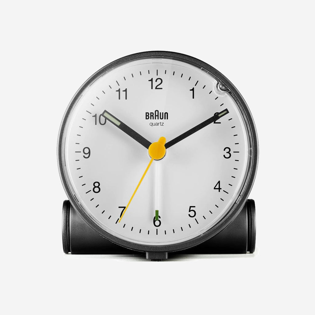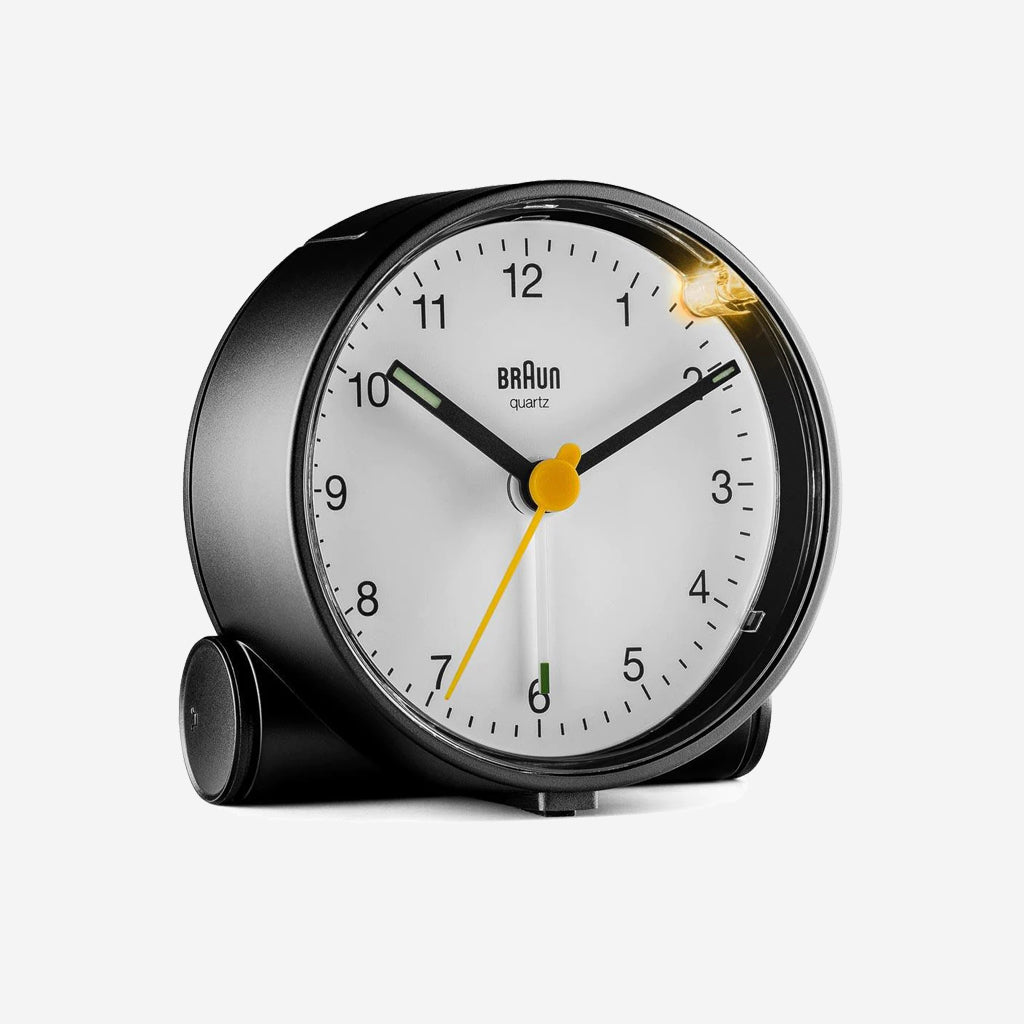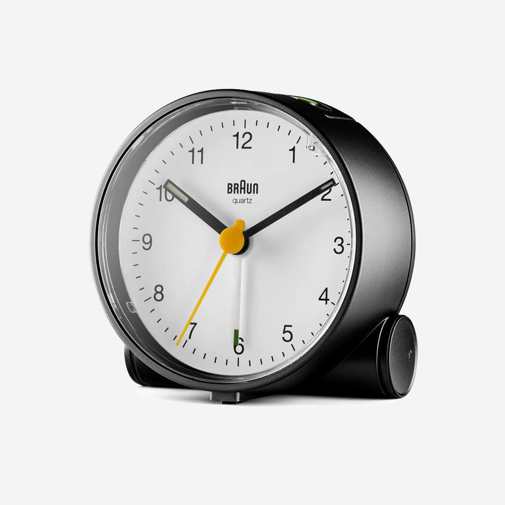 The BC01BW classic analogue alarm clock is closely inspired by the unique form of the AB 5 clock, designed by Dietrich Lubs in the late 80s. Featuring an easy to read dial layout and the iconic yellow second hand that has become synonymous with Braun’s award winning design history. The BC01BW has been updated to include an integrated foot snooze/light feature, improved movement and luminous tipped hour and minute hands.
