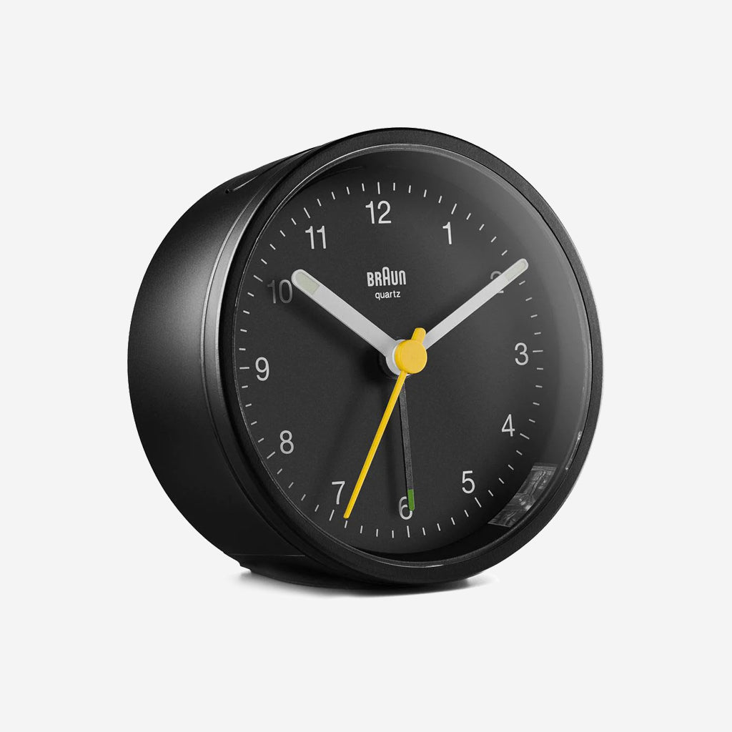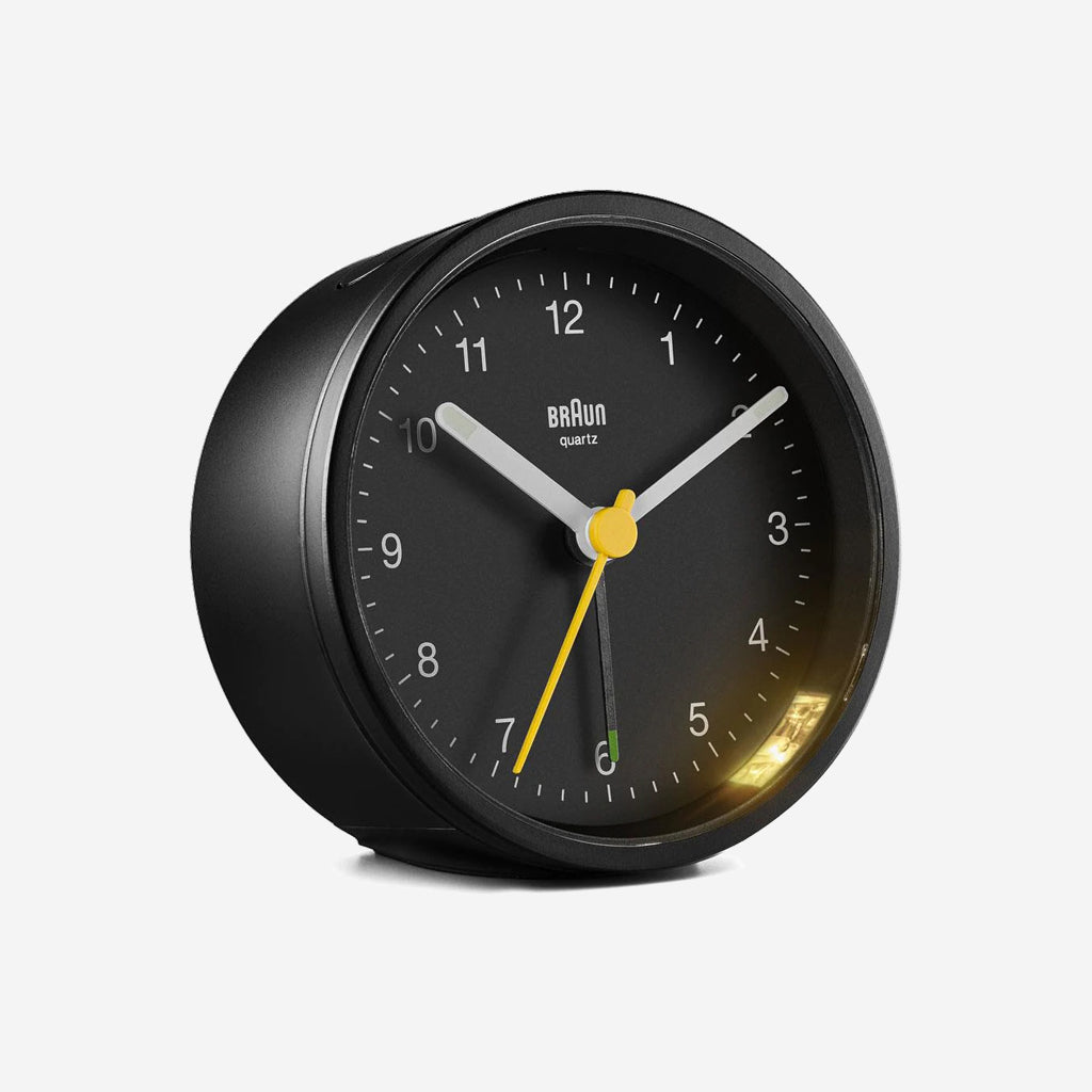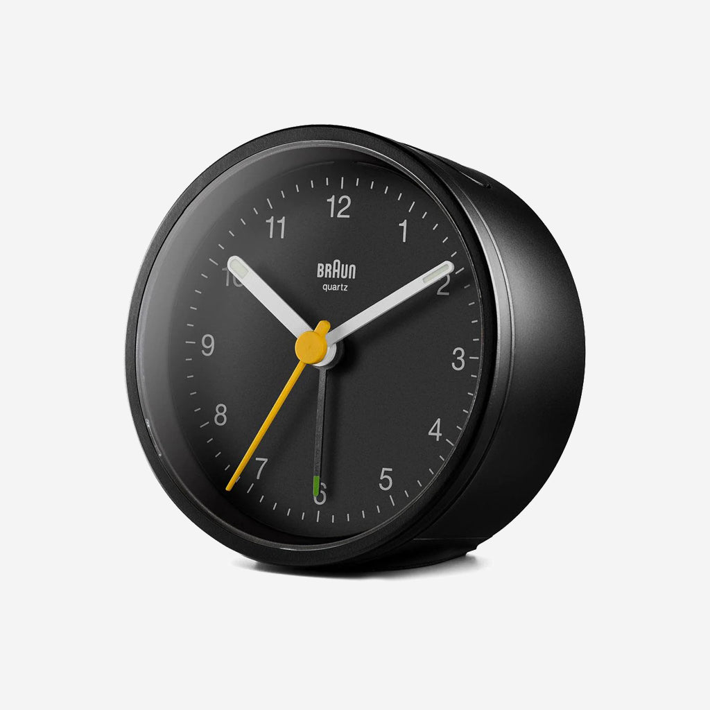 The BC12B classic alarm clock features an easy to read dial with the iconic yellow second hand that has become synonymous with Braun’s award winning design. The clean simplistic look and ease of use makes this an outstanding Braun clock. This clock has been updated to include an integrated foot snooze / light feature, improved movement and luminous tipped hour and minute hands. The clean simplistic dial and contrasting hands with luminous tips offers great legibility, and the quartz tick movement is quiet and precise.