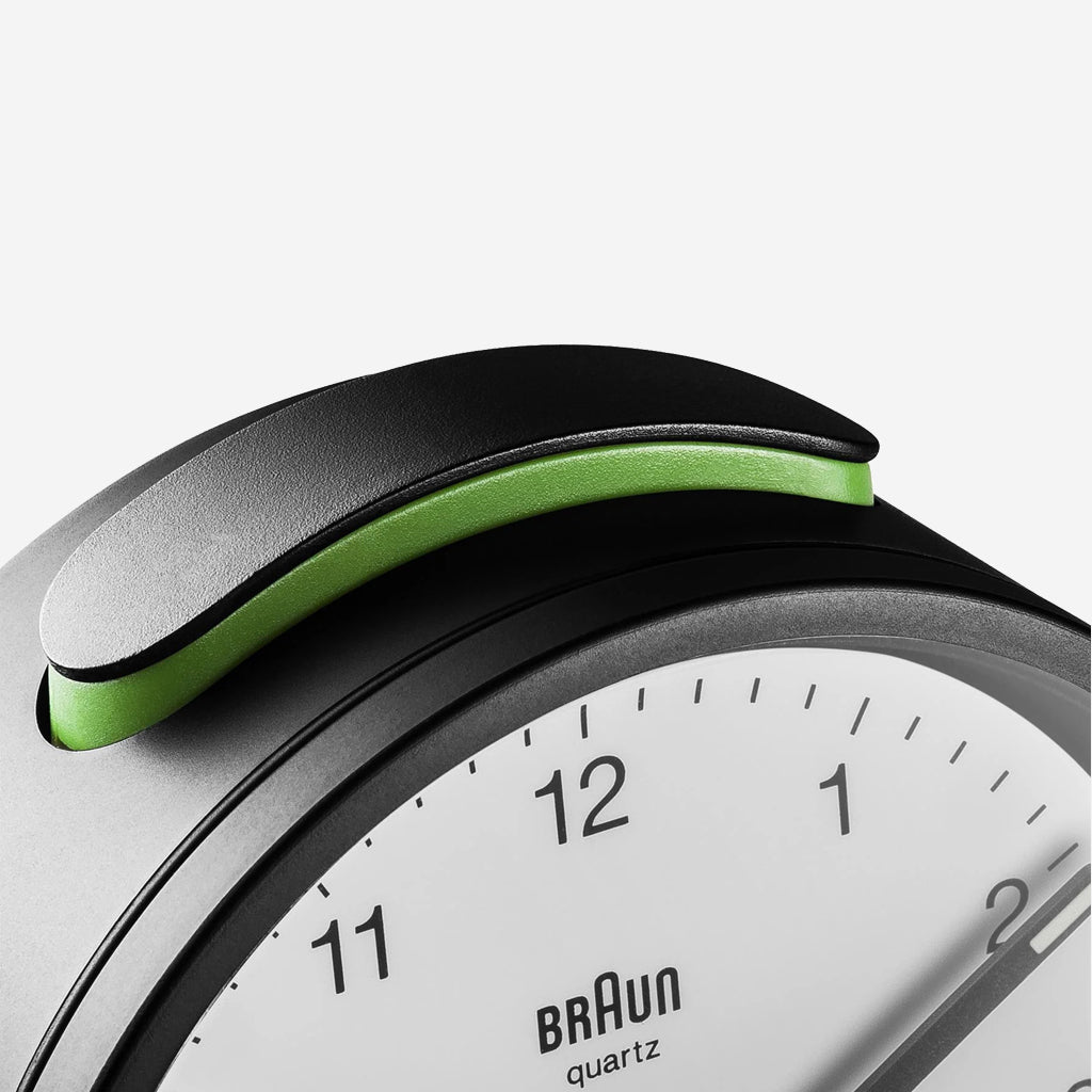 The BC12BW classic alarm clock features an easy to read dial with the iconic yellow second hand that has become synonymous with Braun’s award winning design. The clean simplistic look and ease of use makes this an outstanding Braun clock. This clock has been updated to include an integrated foot snooze / light feature, improved movement and luminous tipped hour and minute hands. The clean simplistic dial and contrasting hands with luminous tips offers great legibility, and the quartz tick movement is quiet and precise.