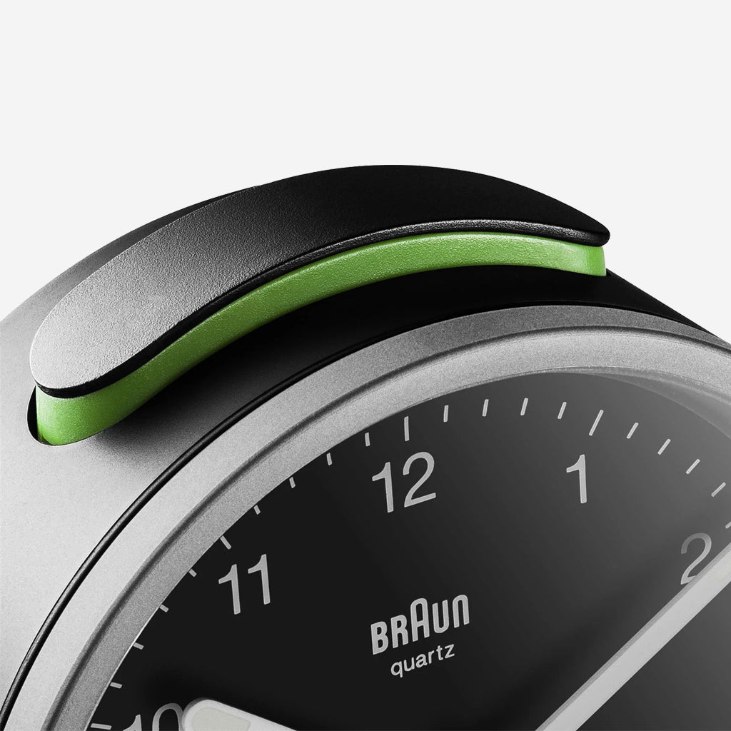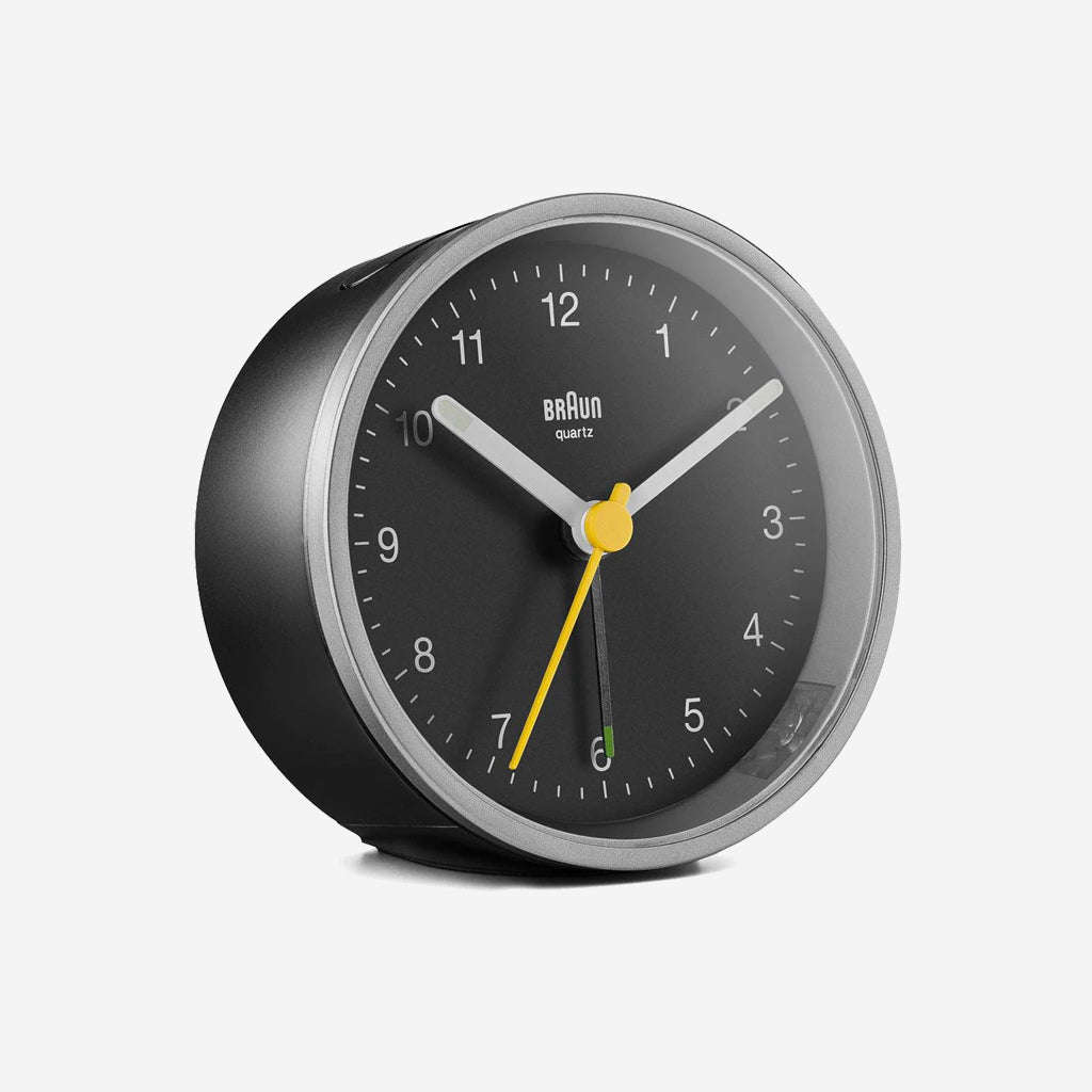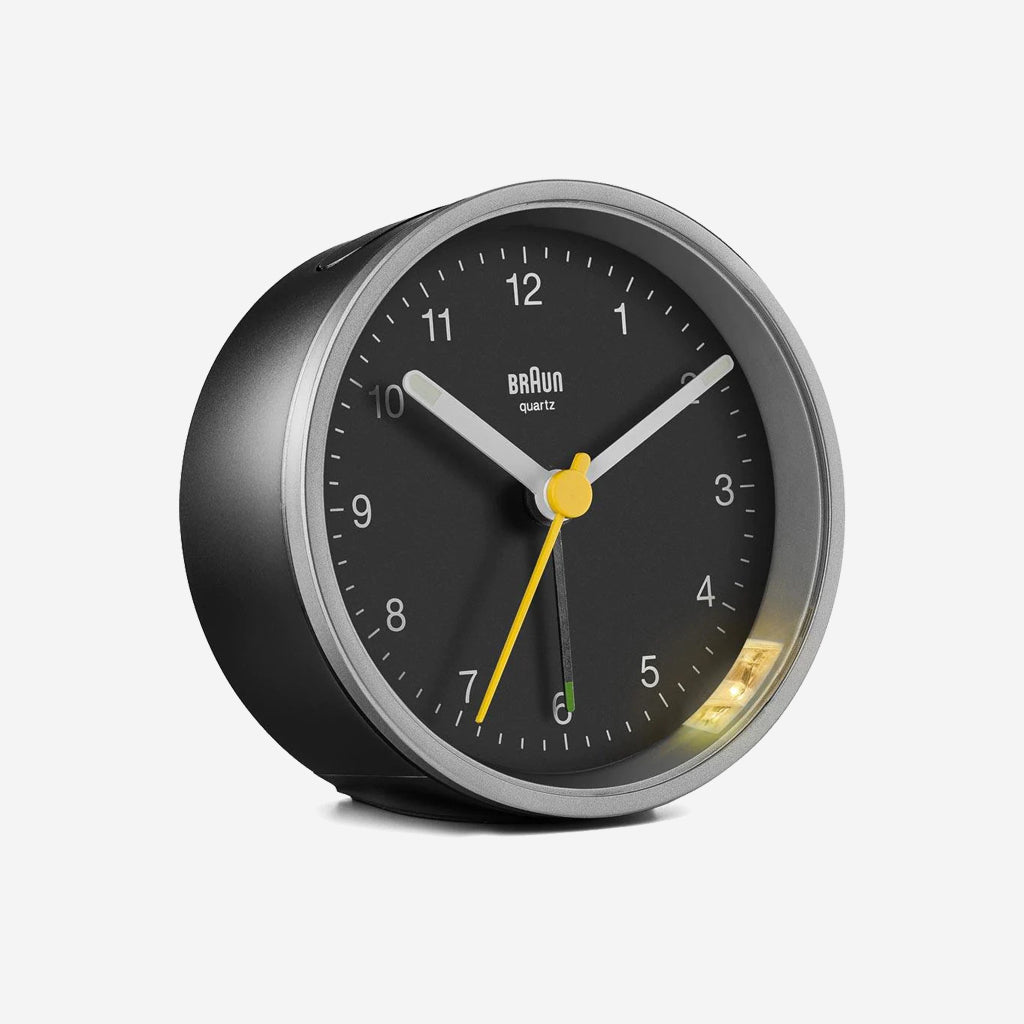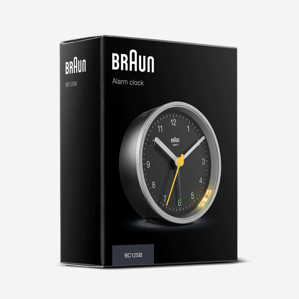 The BC12SB classic alarm clock features an easy to read dial with the iconic yellow second hand that has become synonymous with Braun’s award winning design. The clean simplistic look and ease of use makes this an outstanding Braun clock. This clock has been updated to include an integrated foot snooze / light feature, improved movement and luminous tipped hour and minute hands. The clean simplistic dial and contrasting hands with luminous tips offers great legibility, and the quartz tick movement is quiet and precise.