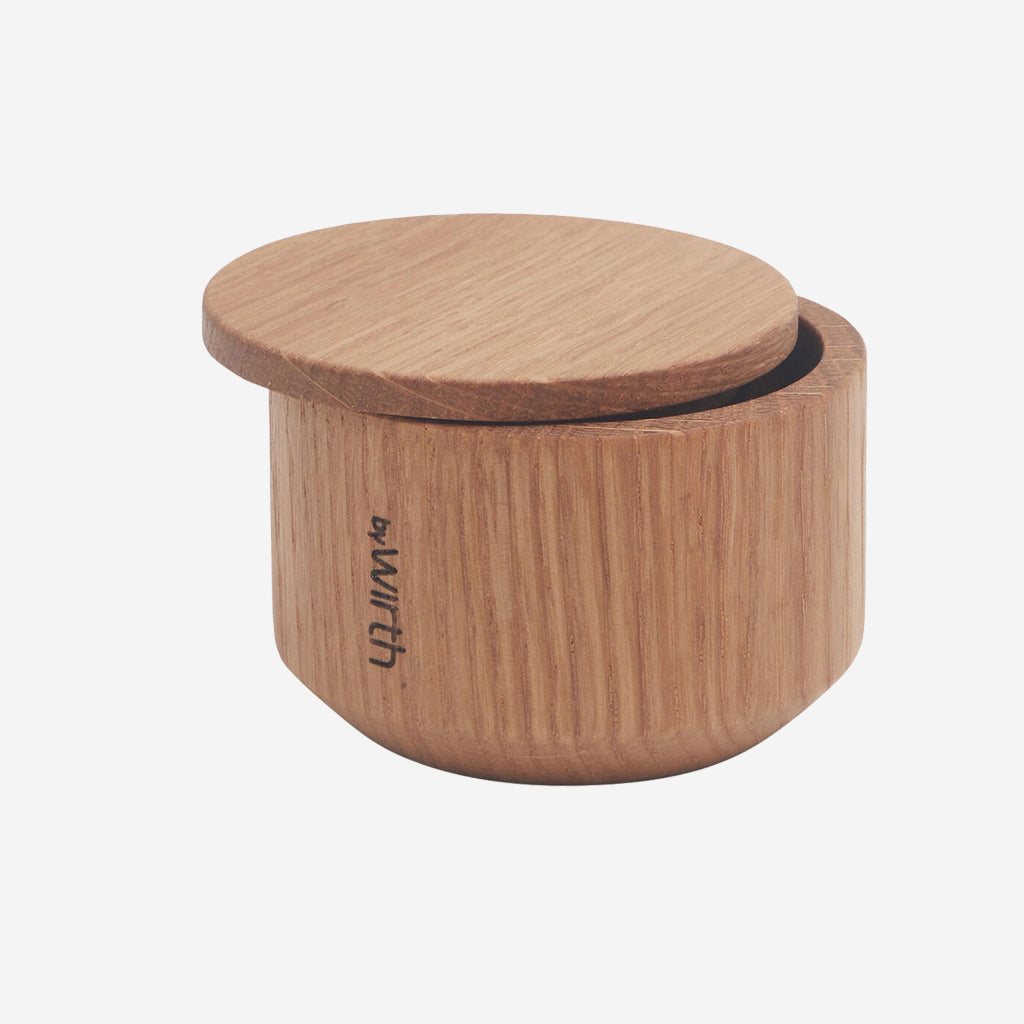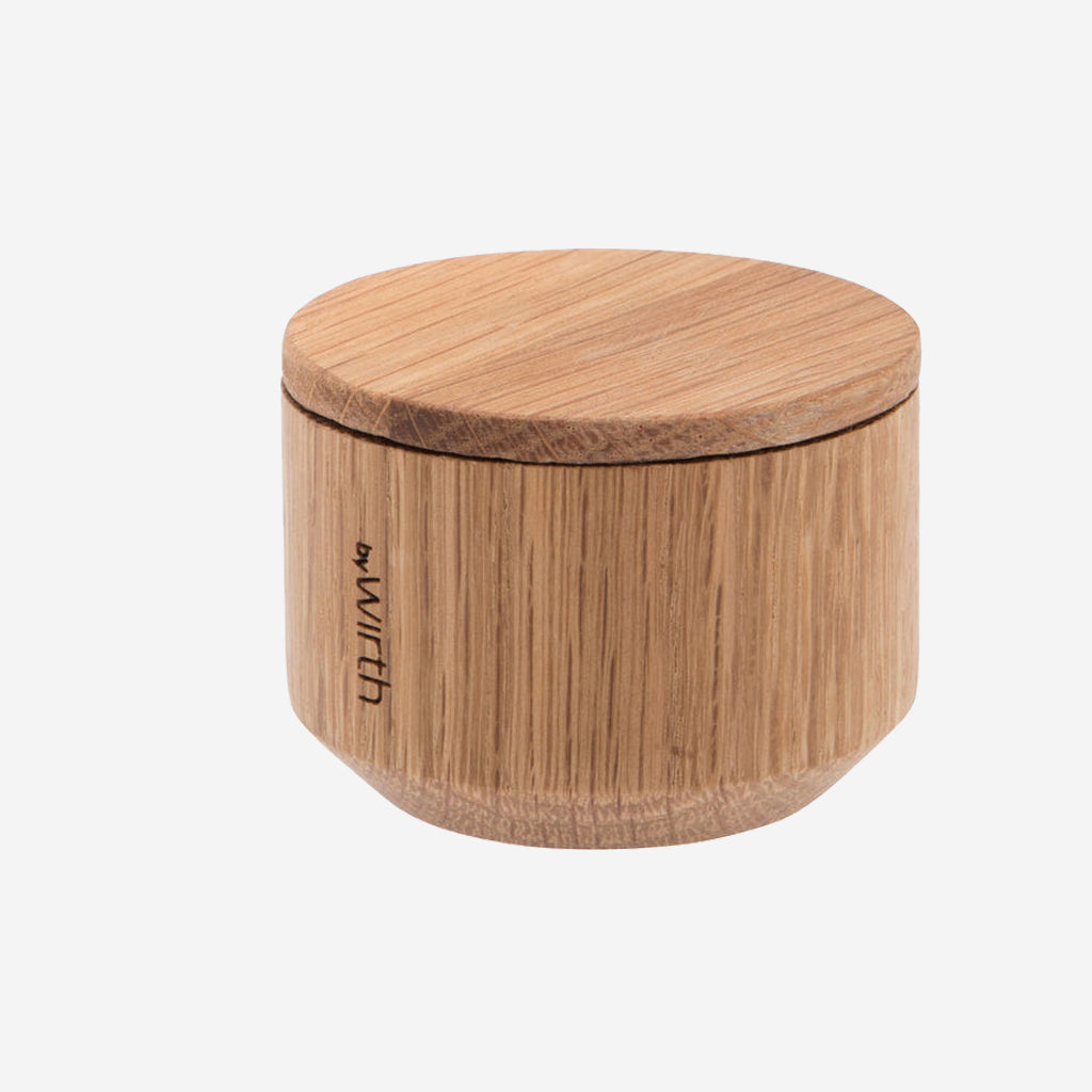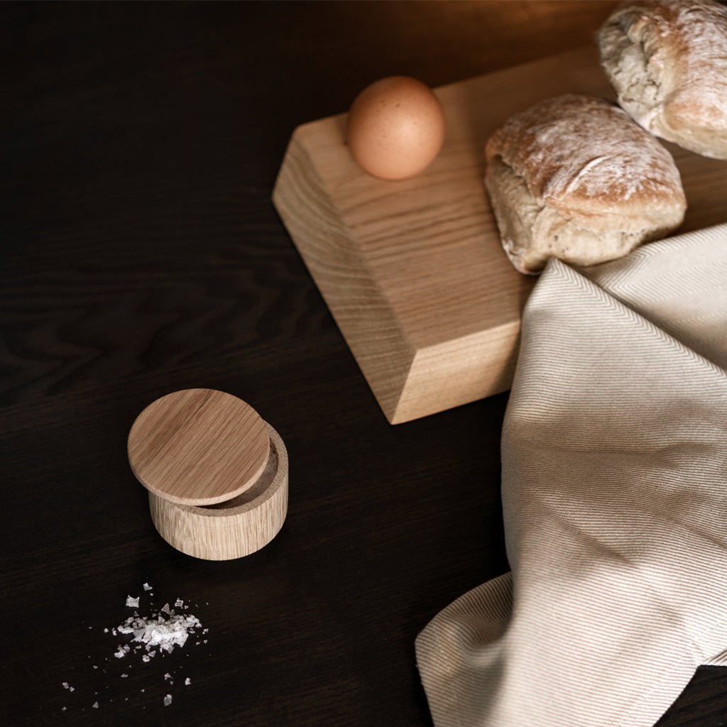 Salt Me is a small salt jar with lid in the same simple timeless design as the grinder Crush Me. Salt Me is made of oak, in the versions oil-treated oak and black painted oak. The lid on Salt Me protects the contents, and it can be pushed aside. This allows you to pour the salt out, and avoid dropping your fingers into the salt.