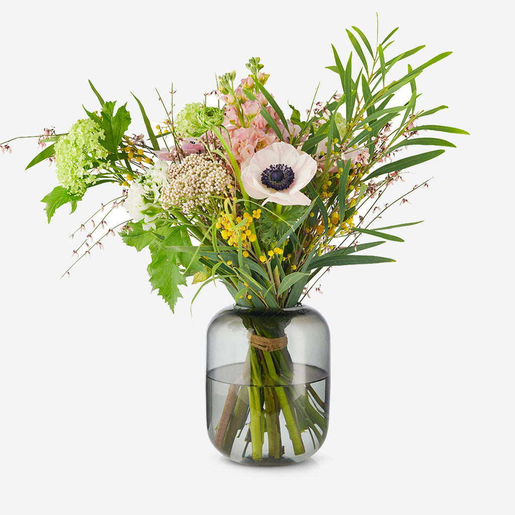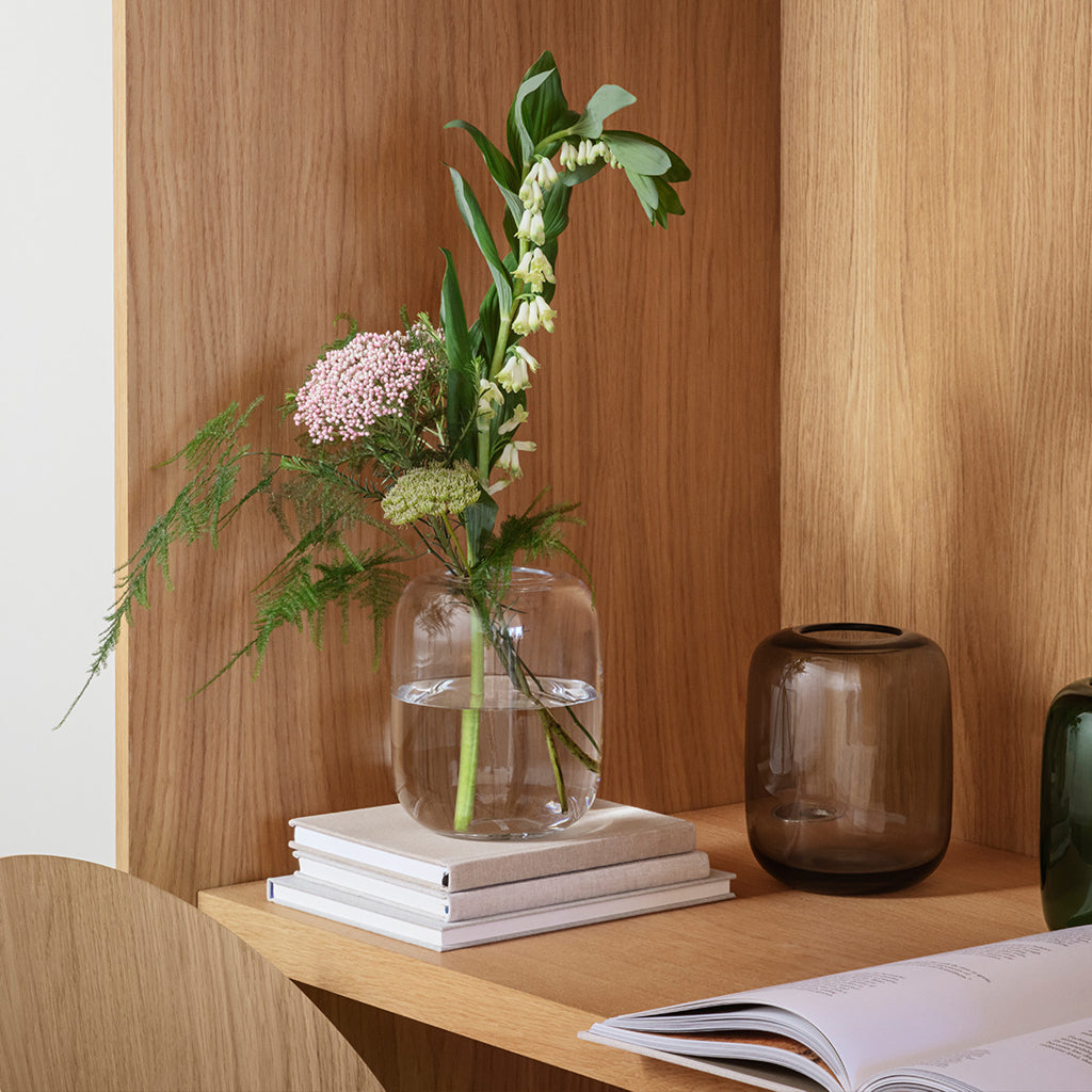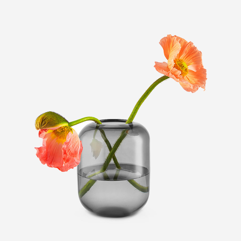 The Eva Solo Acorn vase in smoke is a decorative glass vase with a minimalist, organic design. The practical fluting at the top of the vase keeps stems upright with exquisite reflection of light in the glass. With its organic, sleek style, this vase comes into its own in every home.