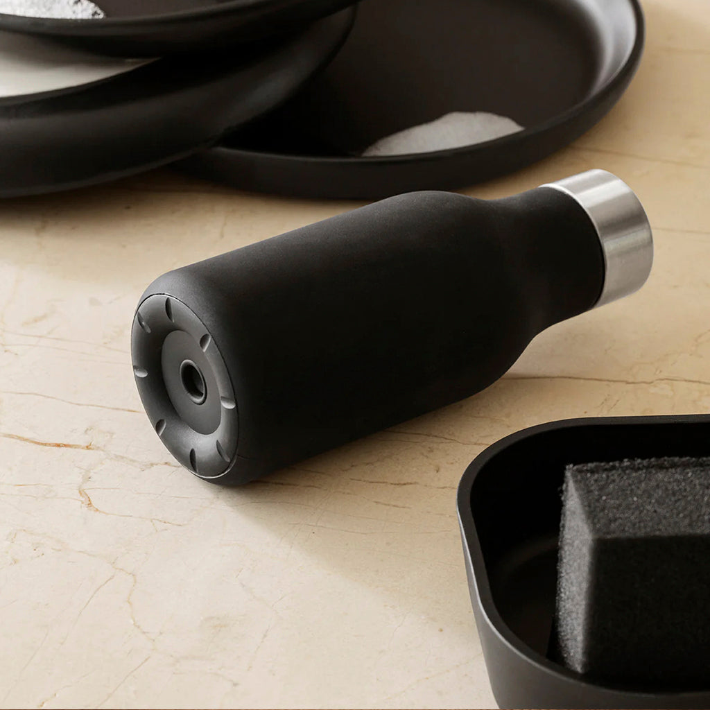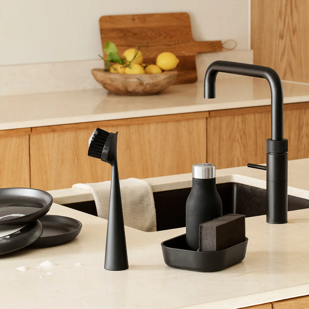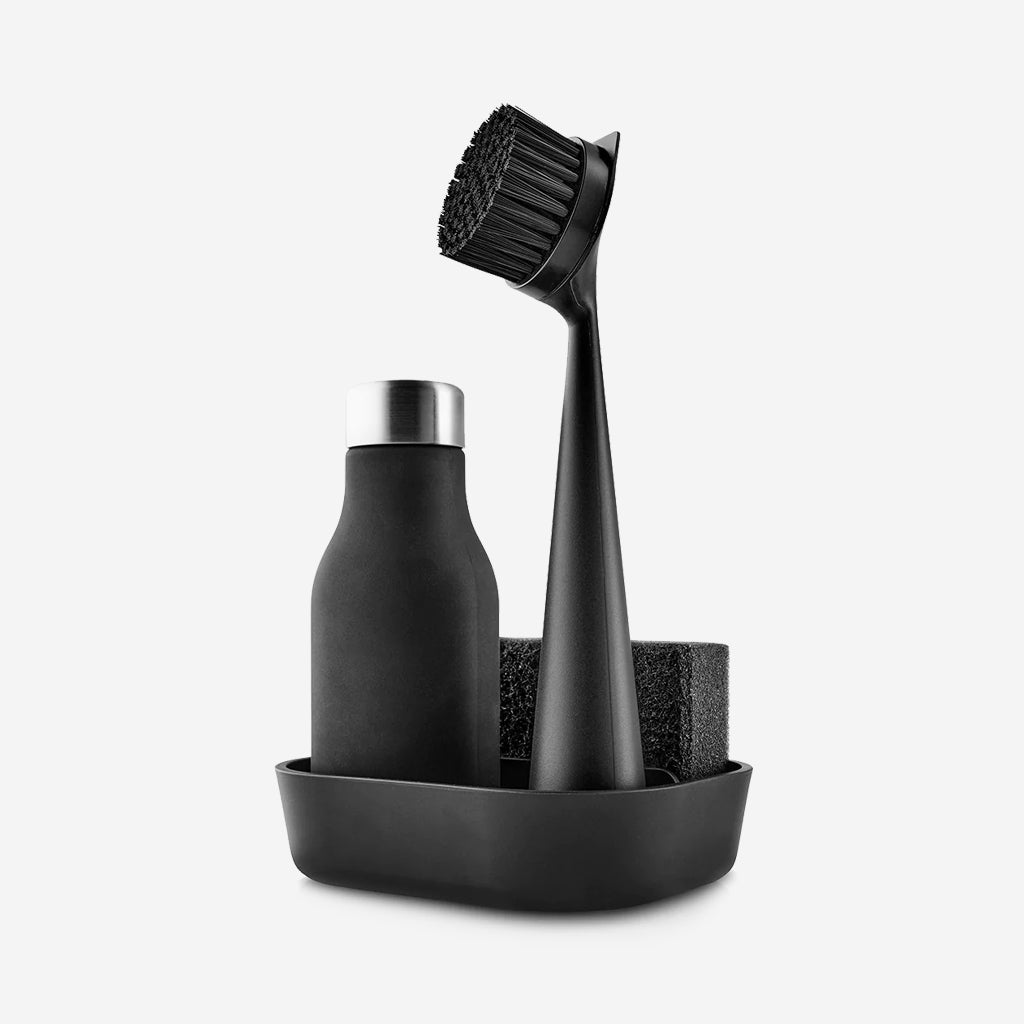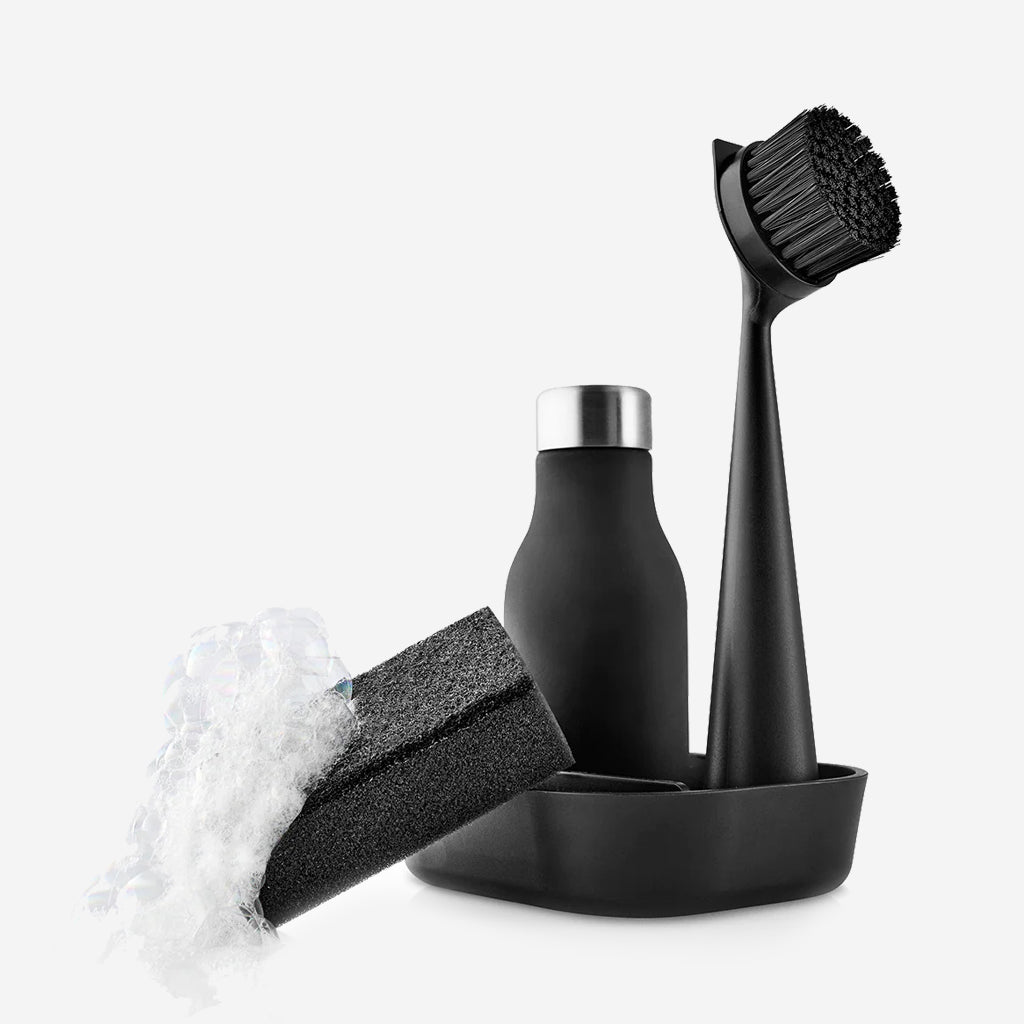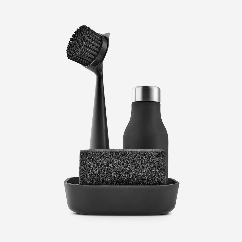 Decorative and practical dishwashing set with washing up brush, soap dispenser and sponge scourer in tray. No more garish detergent bottles and unsightly sponge scourers! The washing up brush has a practical and effective edge to help scrape away stubborn debris, plus fast-drying bristles, weighted base and replaceable brush head. The decorative and practical refillable soap dispenser gives you just the right amount of soap with each light squeeze, and a self-sealing valve at the base.