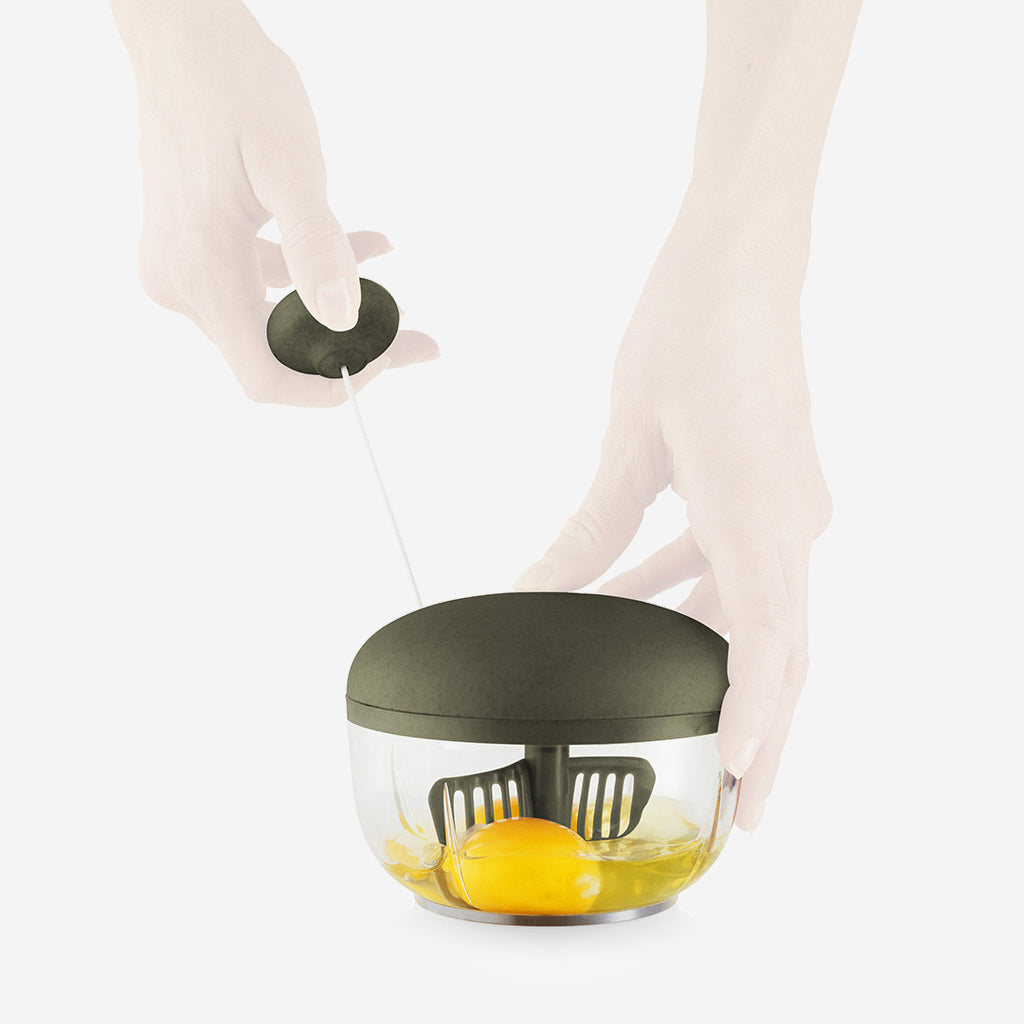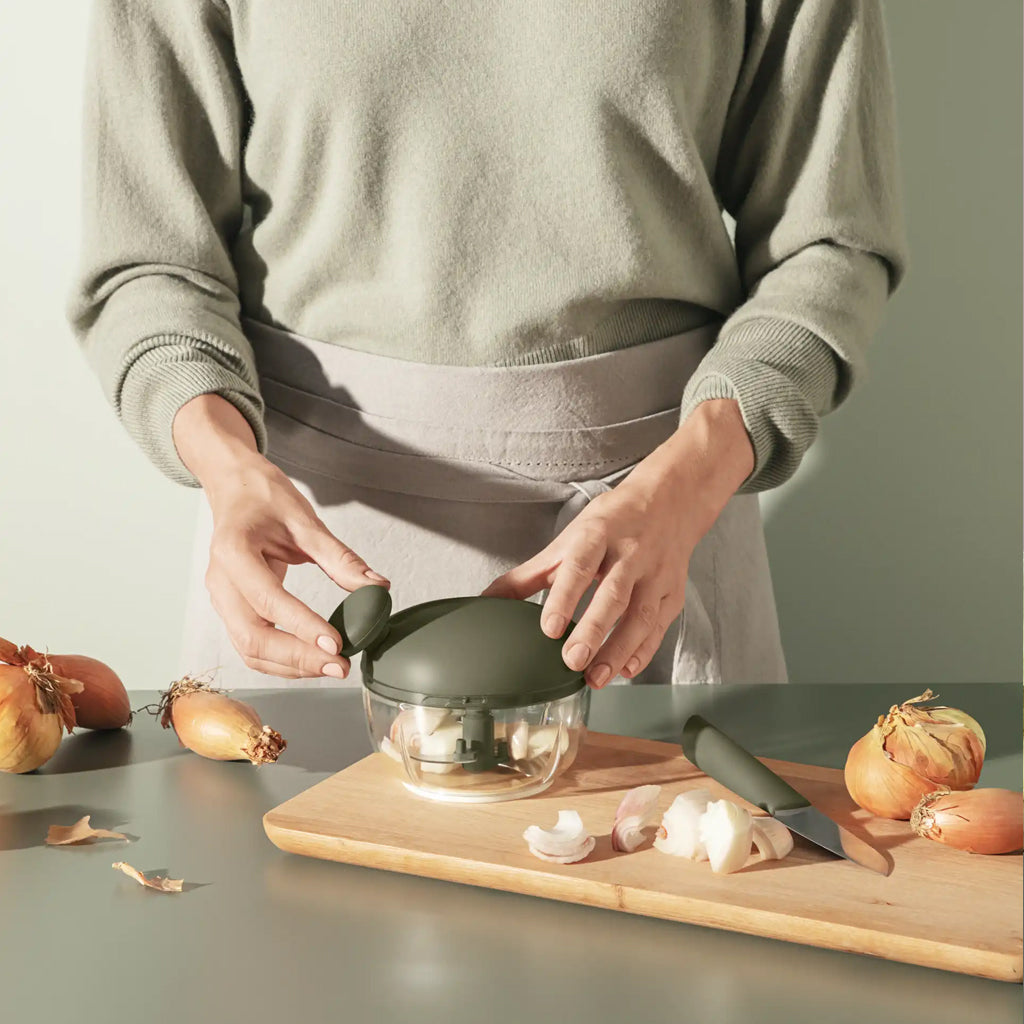 Chop, mix and whisk sustainably without using any electricity! Operated using a practical drawstring, it’s quick, efficient and easy to chop vegetables and whip cream. Place the ingredients in the container, position the lid and pull the string. The mini chopper is manually operated, so it’s easy to keep an eye on progress. The more times you pull the string, the more finely chopped the contents. The mini chopper comes with an extra attachment for whipping e.g. cream, milk or egg whites. The container and attachments are dishwasher-safe, while the lid needs to be washed in hot water and soap.