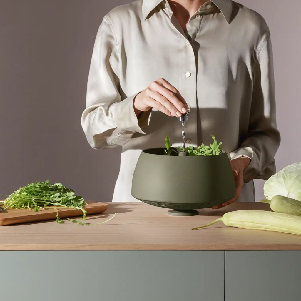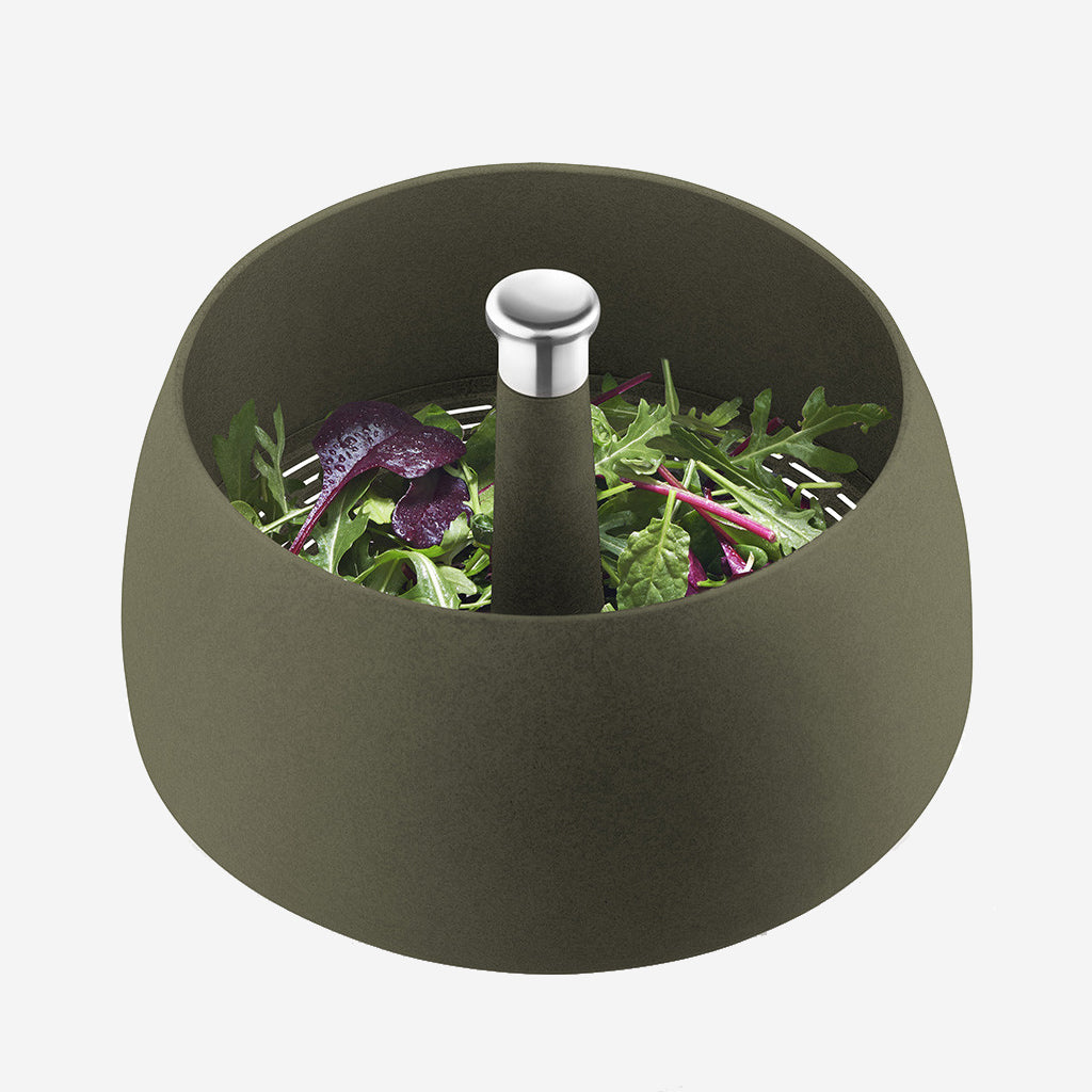 The Eva Solo Spinning Colander is the all-in-one salad server and colander. Use it to dry salad or as a colander for fruit or pasta. To use, rinse the lettuce in the spinner, push down on the axle in the middle until all the water has been spun out.