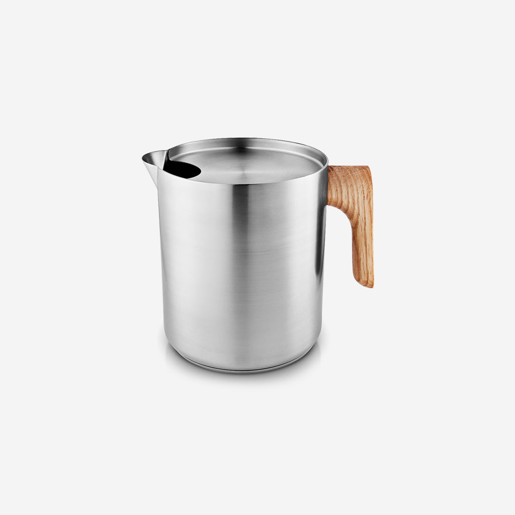 Thanks to the kettle’s steel and aluminium base, you can boil water for coffee, tea and meals in no time on your induction stove top. Simply pour water straight through the lid and heat the kettle on the stove top. The kettle has an elegant oak handle for a comfortable, heatproof grip. Suitable for all heat sources. Wipe clean with a well-wrung, damp cloth and descale like an ordinary electric kettle through the spout on the lid. Body is made of 90% recycled post-consumer stainless steel.