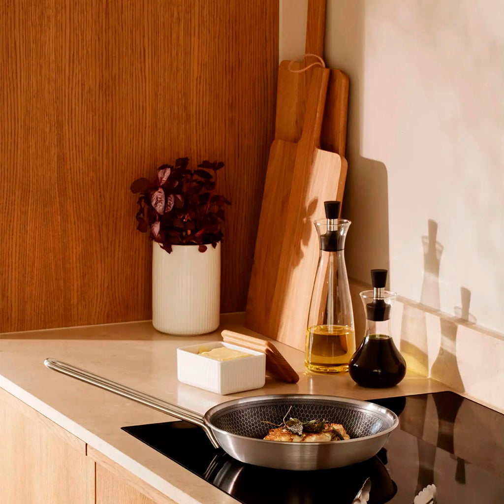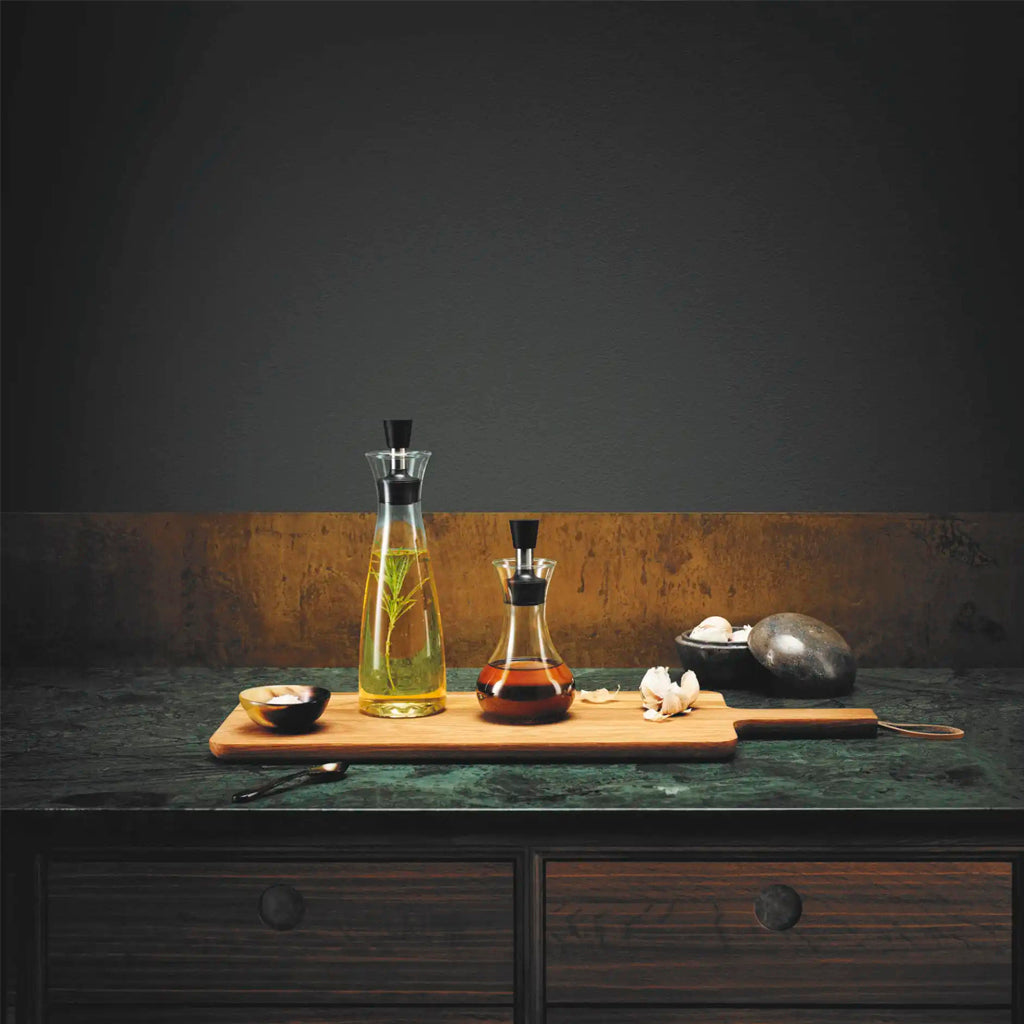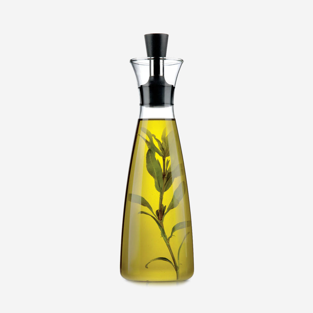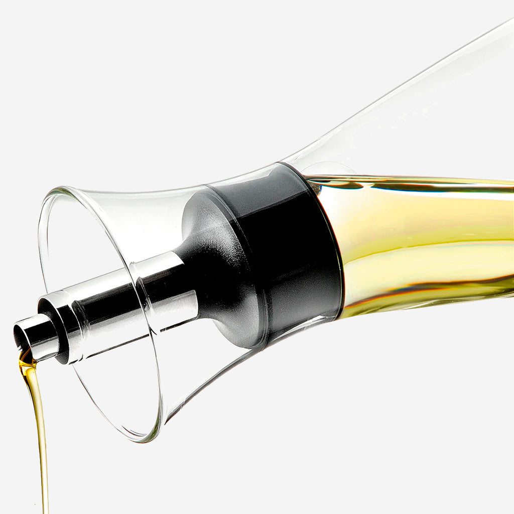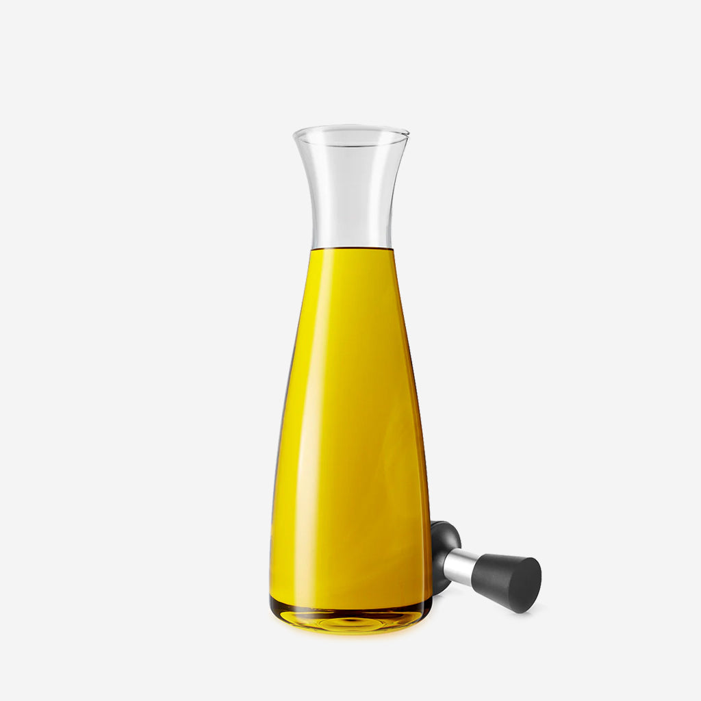 A product with numerous features and functions. Decant your oil into the flask, and store it in your fridge or kitchen cupboard so it is ready when you need it. Moreover, it can be taken directly to the table for serving if you need a dressing for the salad. The drip-free pouring spout pours precisely without leaving any marks on the table or tablecloth. The tightly fitting stopper retains both the aroma and flavour, and also ensures that the dressing is not tainted with strong flavours from other foods in the fridge. The flask is made of borosilicate glass, which can withstand both hot and cold fluids, and is therefore microwave-safe (except for the pouring spout).