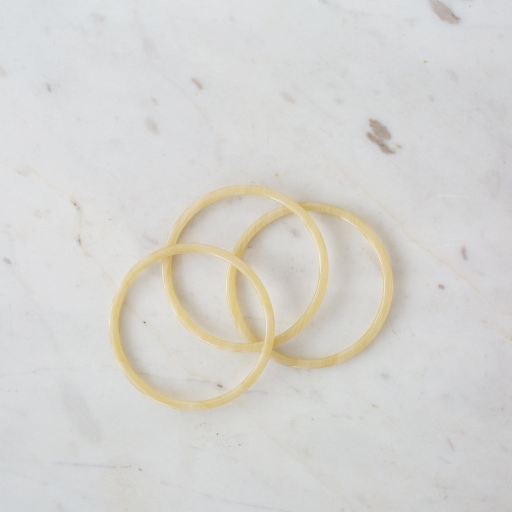 These simple and delicate blonde coloured bangles are perfect for everyday wear. Stacks well with silver or gold & works with black and tan watch straps or more tort bangles too!