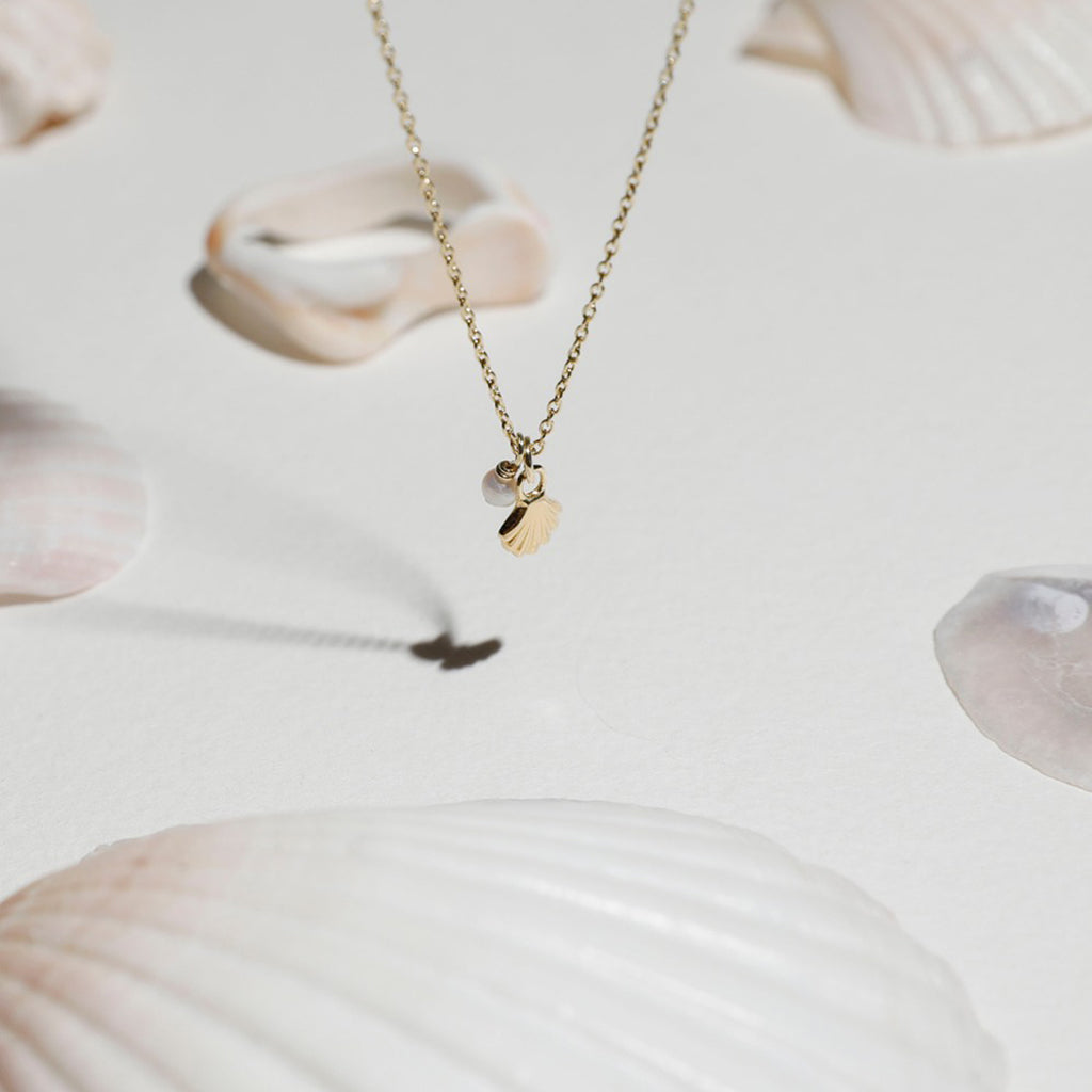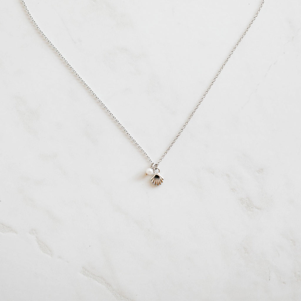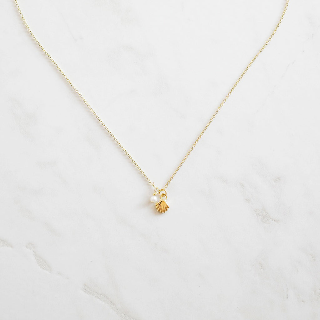 Sweet shell & mini pearl charm together on a chain. Ocean & beach vibes all year 'round.