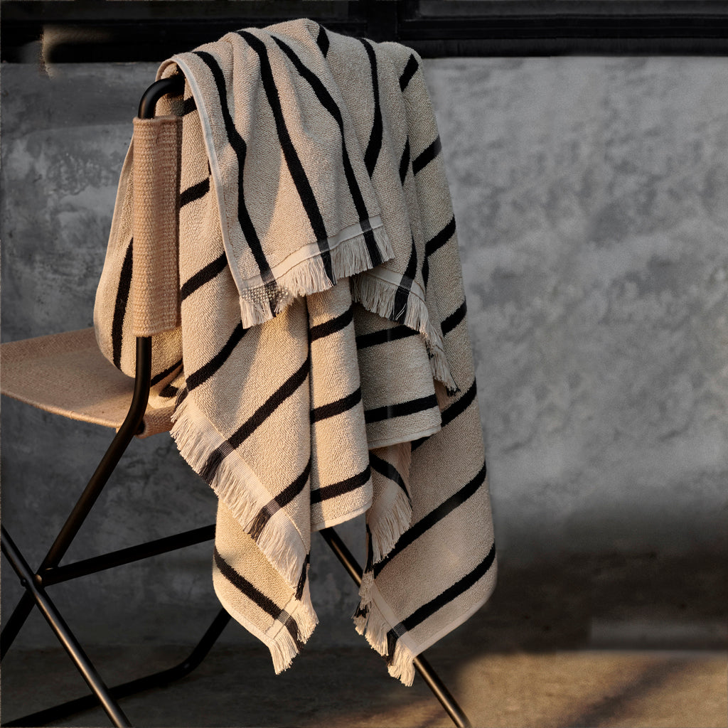 The towel collection comes with decorative fringes at each end, emphasizing its relaxed feel and expression.