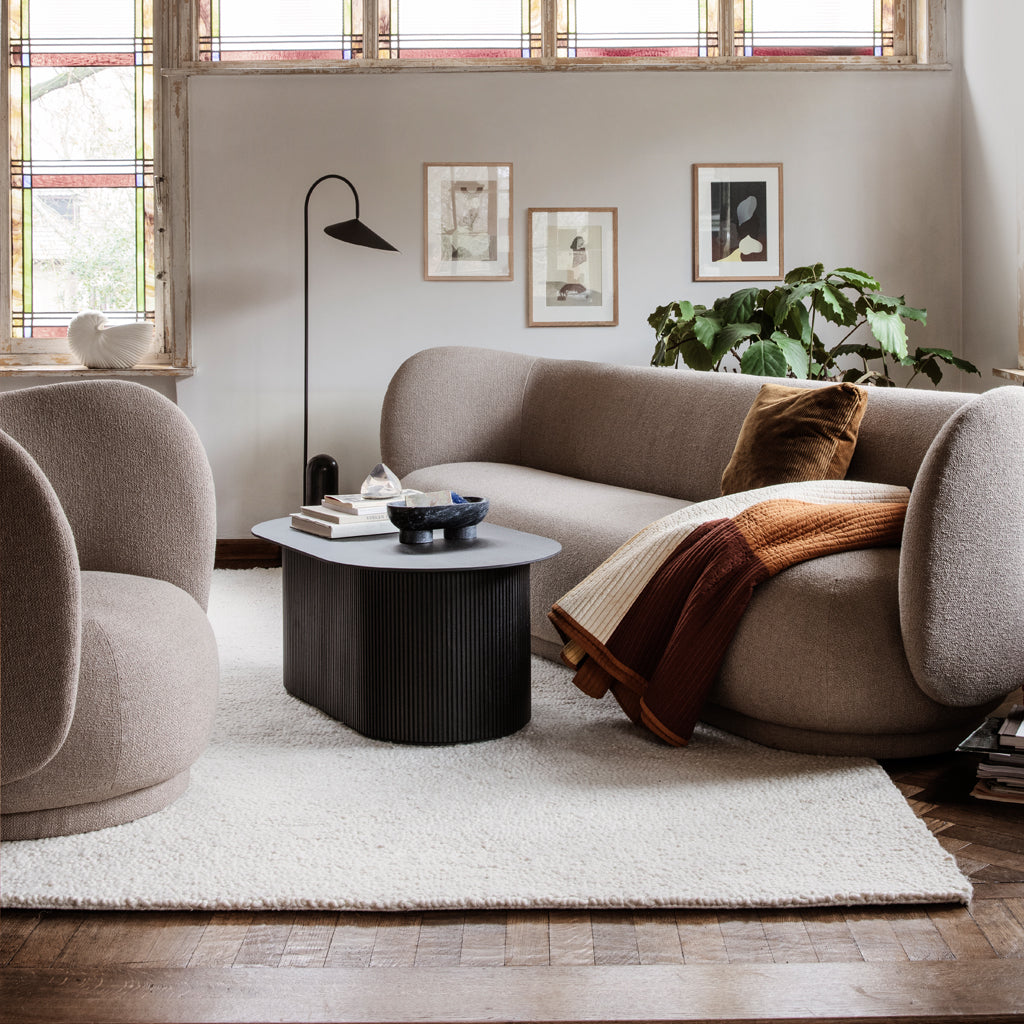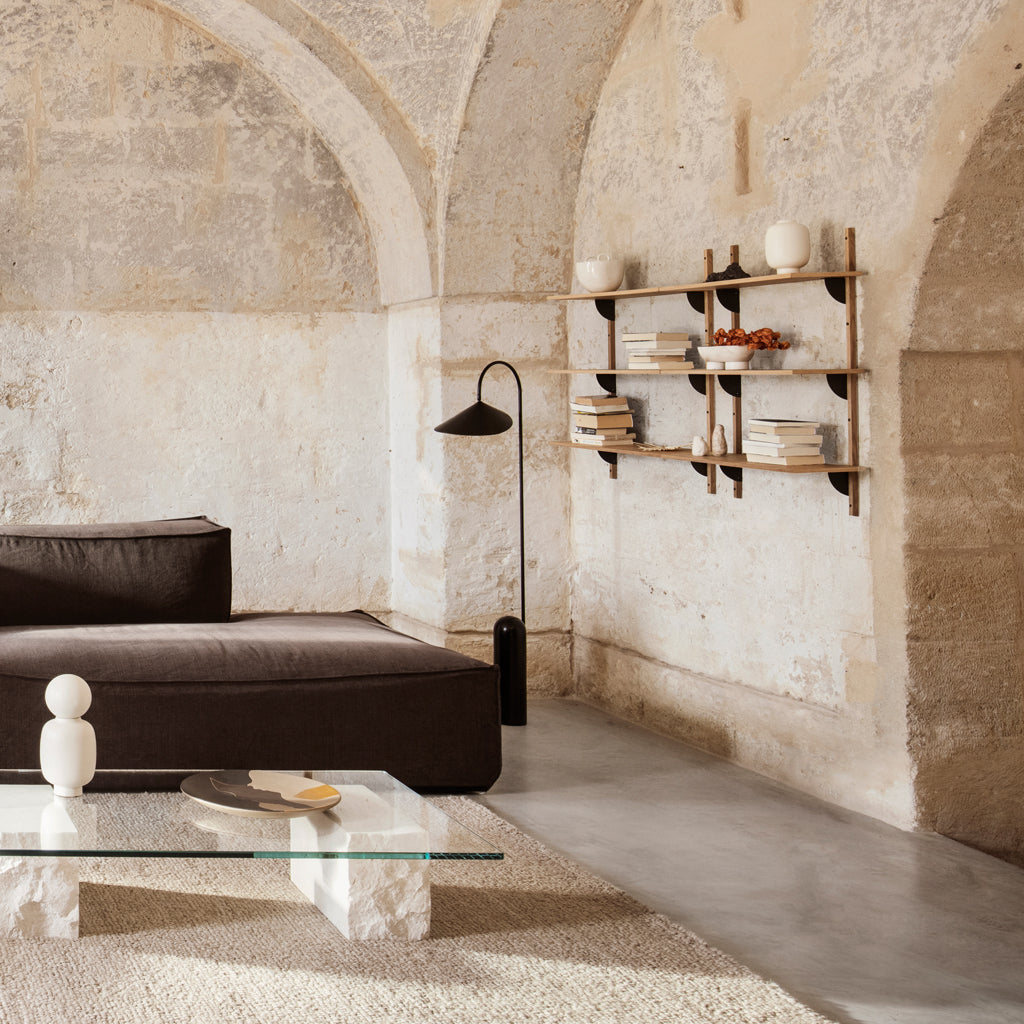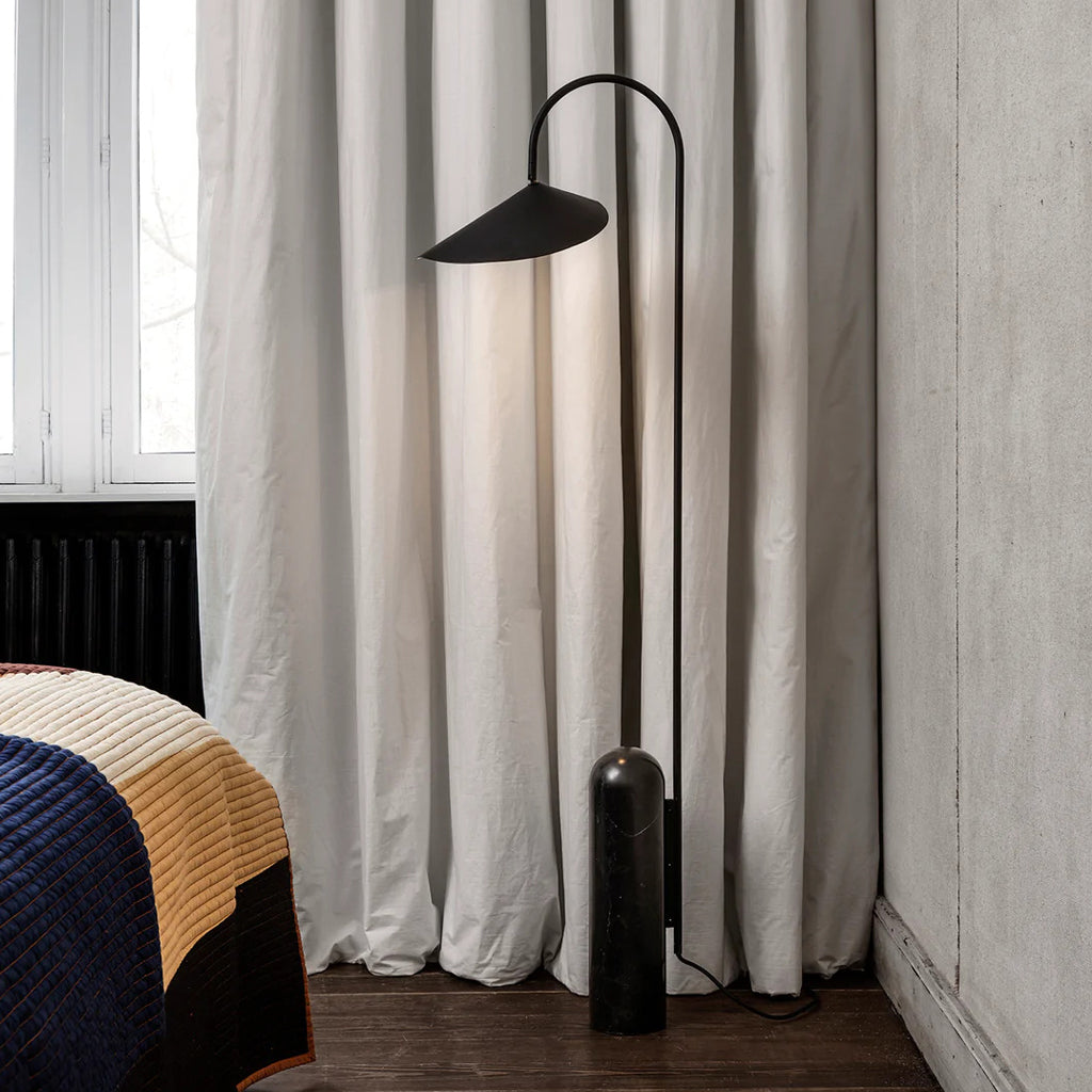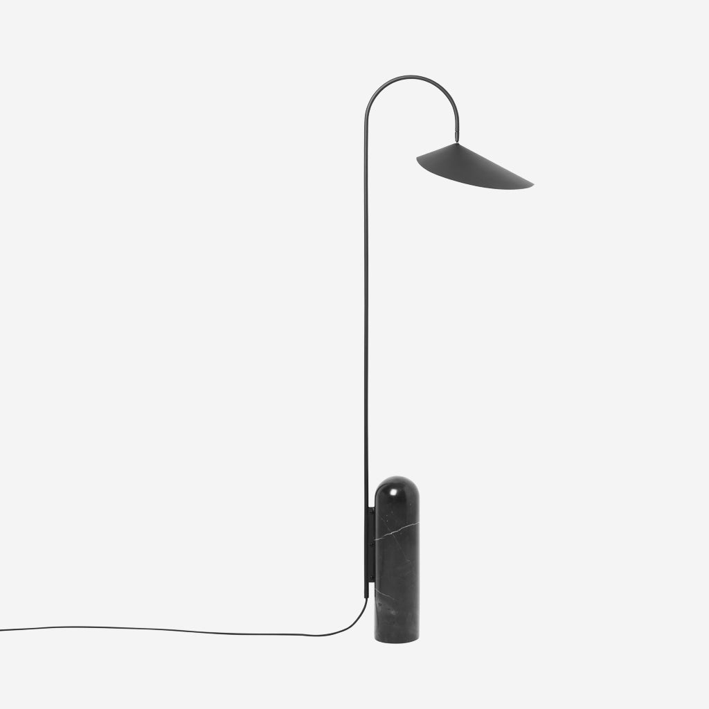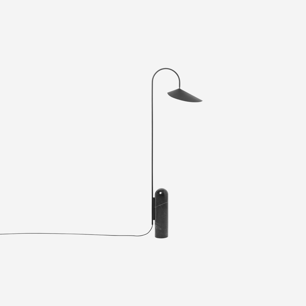 The Arum Floor Lamp is characterised by the black solid marble base combined with the organically shaped lampshade. Achieving the perfect balance in the off-centre structure of the lamp, the black marble foot counterweights the gentle way the lampshade is suspended from the curved metal arch in a leaf-like manner. With the matte, off-white inside of the shade, the lamp provides a soft, evenly distributed light, and the lampshade can be adjusted to ensure optimal light conditions in all situations.