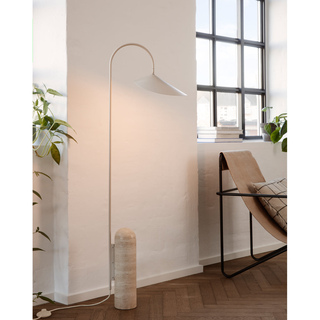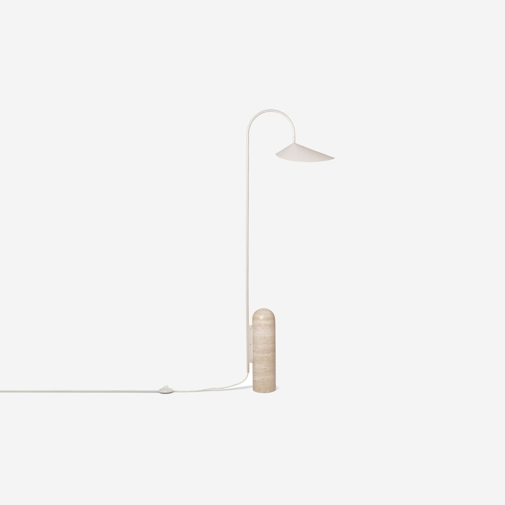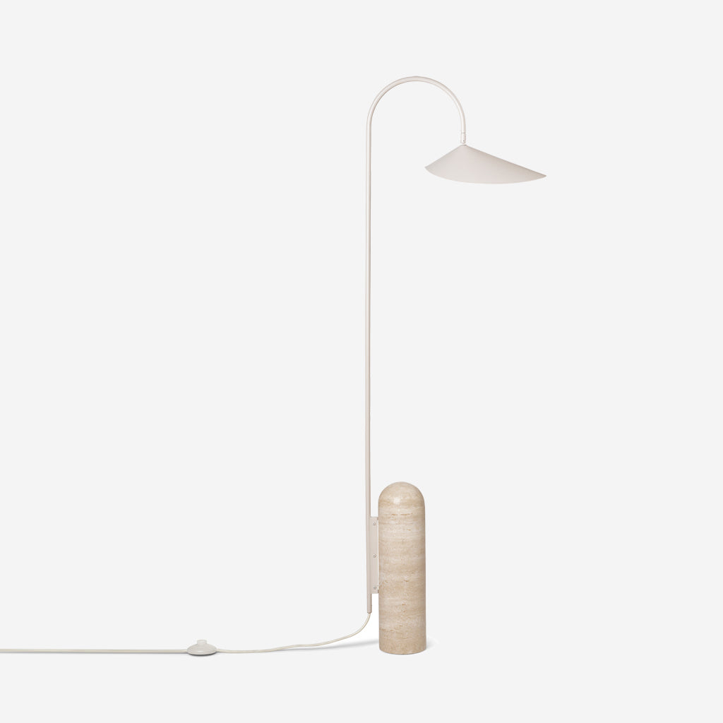 A study in contrasts, our Arum Floor Lamp is distinguished by its asymmetrical shade that rests on a slender metal stem and travertine base. The curved, petal-shaped shade is painted white on the underside to evenly distribute soft, ambient light. Use it to brighten a dark corner or place next to a lounge chair to spotlight a favourite book, adjusting the shade to the perfect angle.