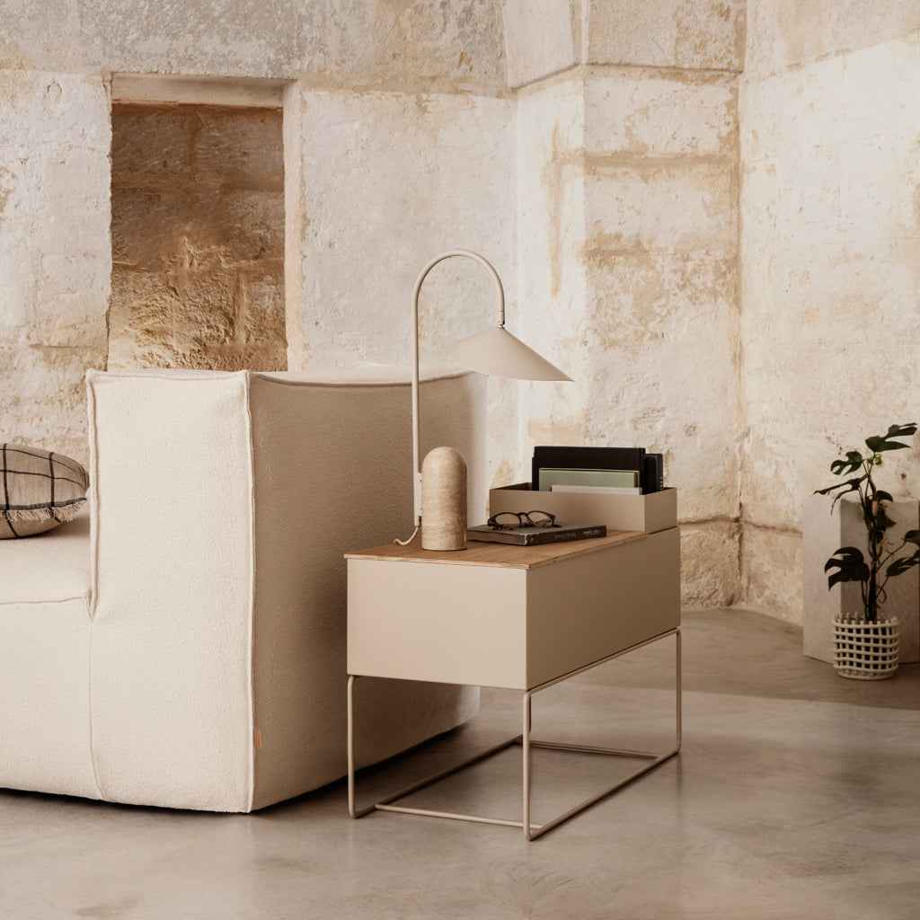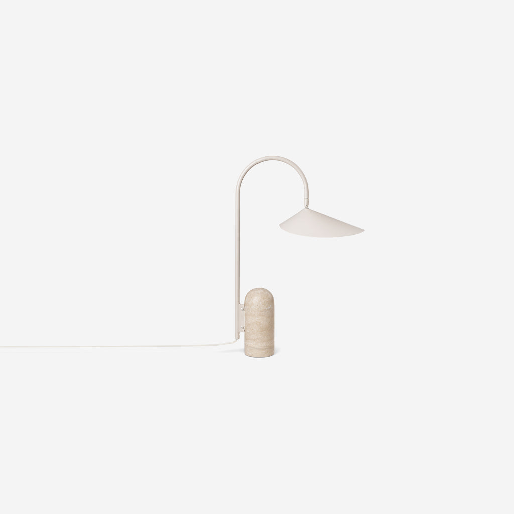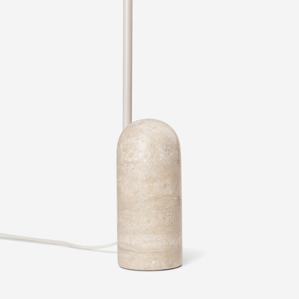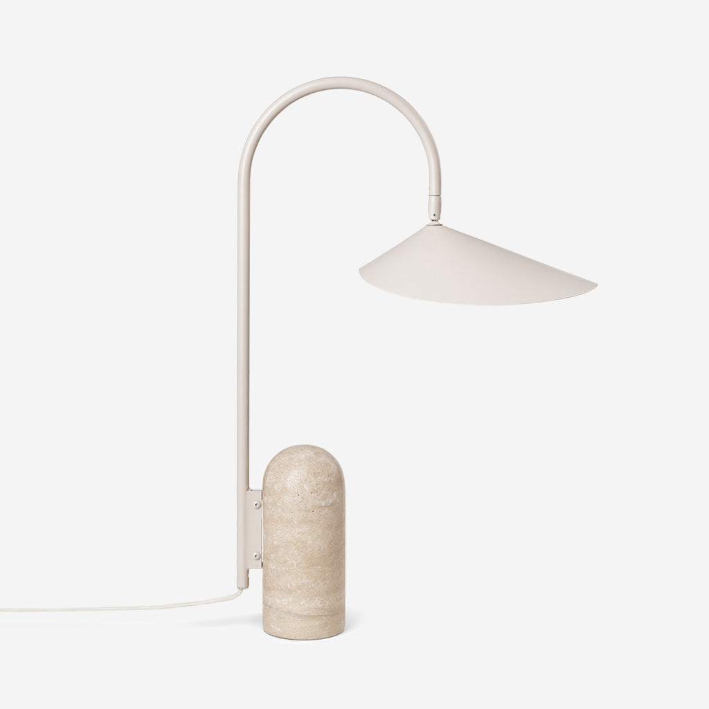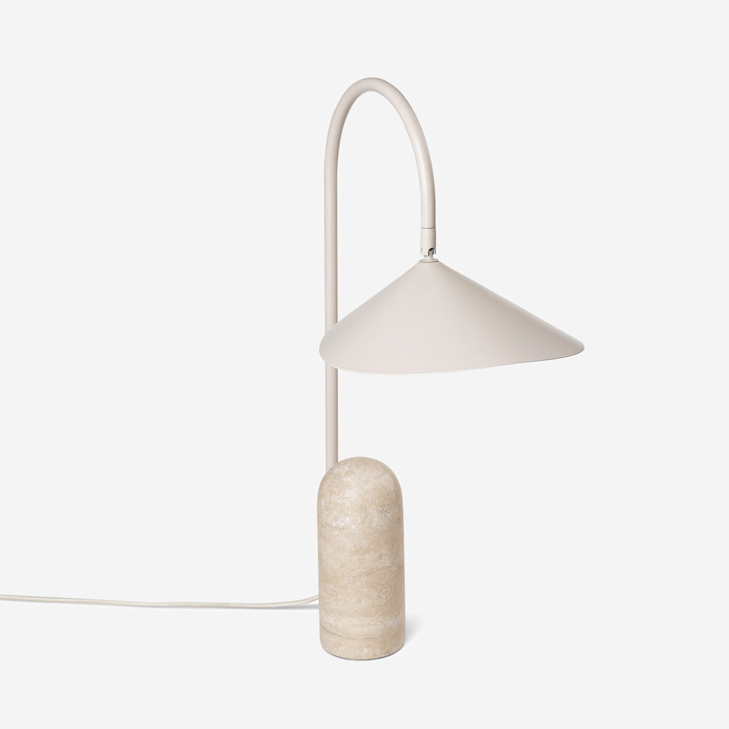 Distinguished by its solid marble base, slender stem and asymmetrical shade, our Arum Table Lamp is a study in contrasts and balance. Crafted in beige powder-coated metal and travertine, the petal-shaped shade appears to float from the stem-like rod. Emitting soft, ambient illumination, it’s ideally placed on a home office desk or sideboard.