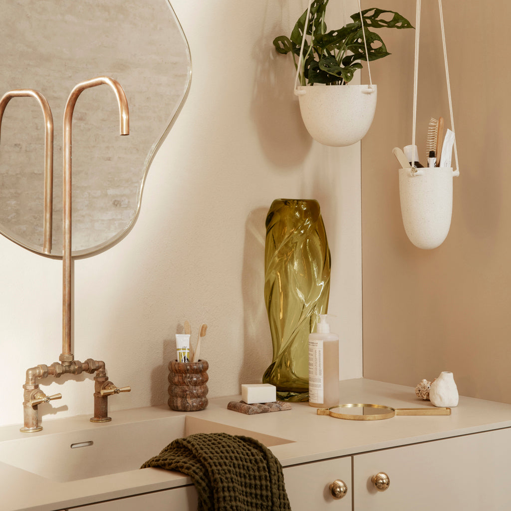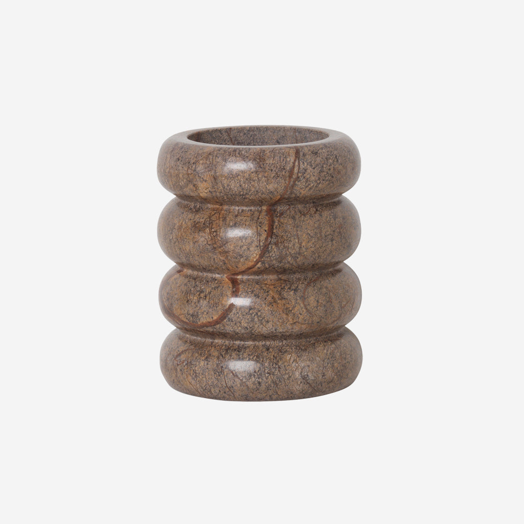 Cut in the stunning Brown Bidasar marble, the Bendum series expresses the meeting of nature and culture in a soft geometric design. For toothbrushes, pencils, or a single flower, the Bendum Cup adds the natural elegance of the unique stone to your home.