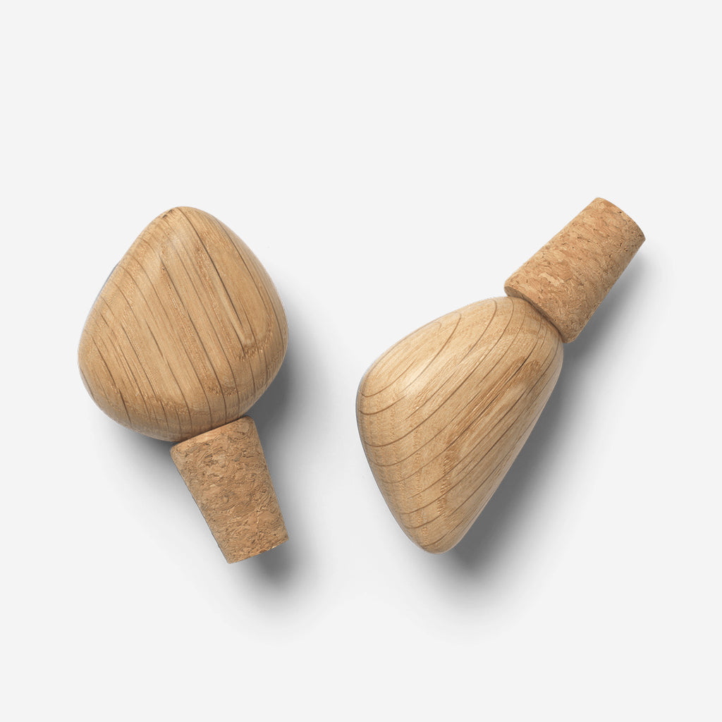 Characterised by their soft curves and sculpted details, the Cairn Wine Stoppers offer a visually striking solution to preserving opened wine in its original bottle. Inspired by cairns, man-made stacks of stones that are often raised for memorial purposes, the artistic wooden shapes have been carved from FSC™-certified oak, while the stoppers themselves are made from cork.