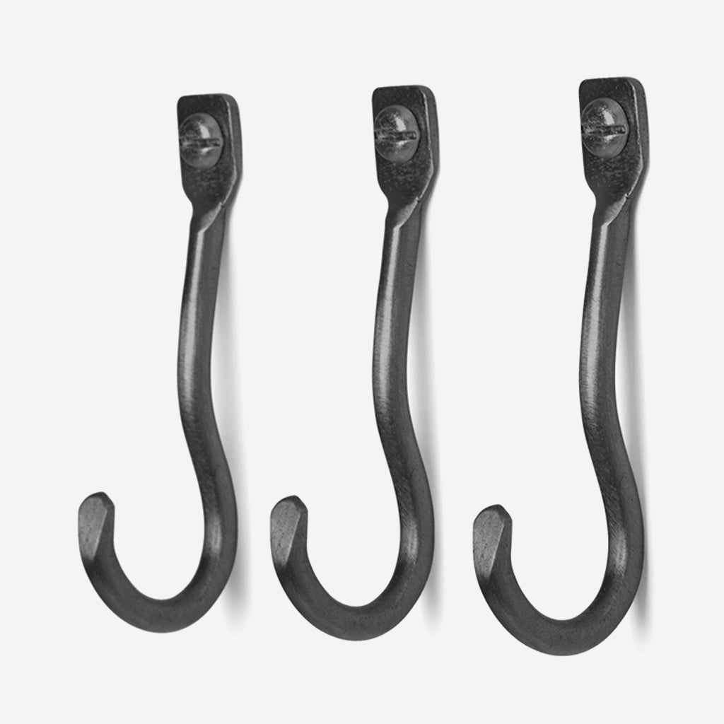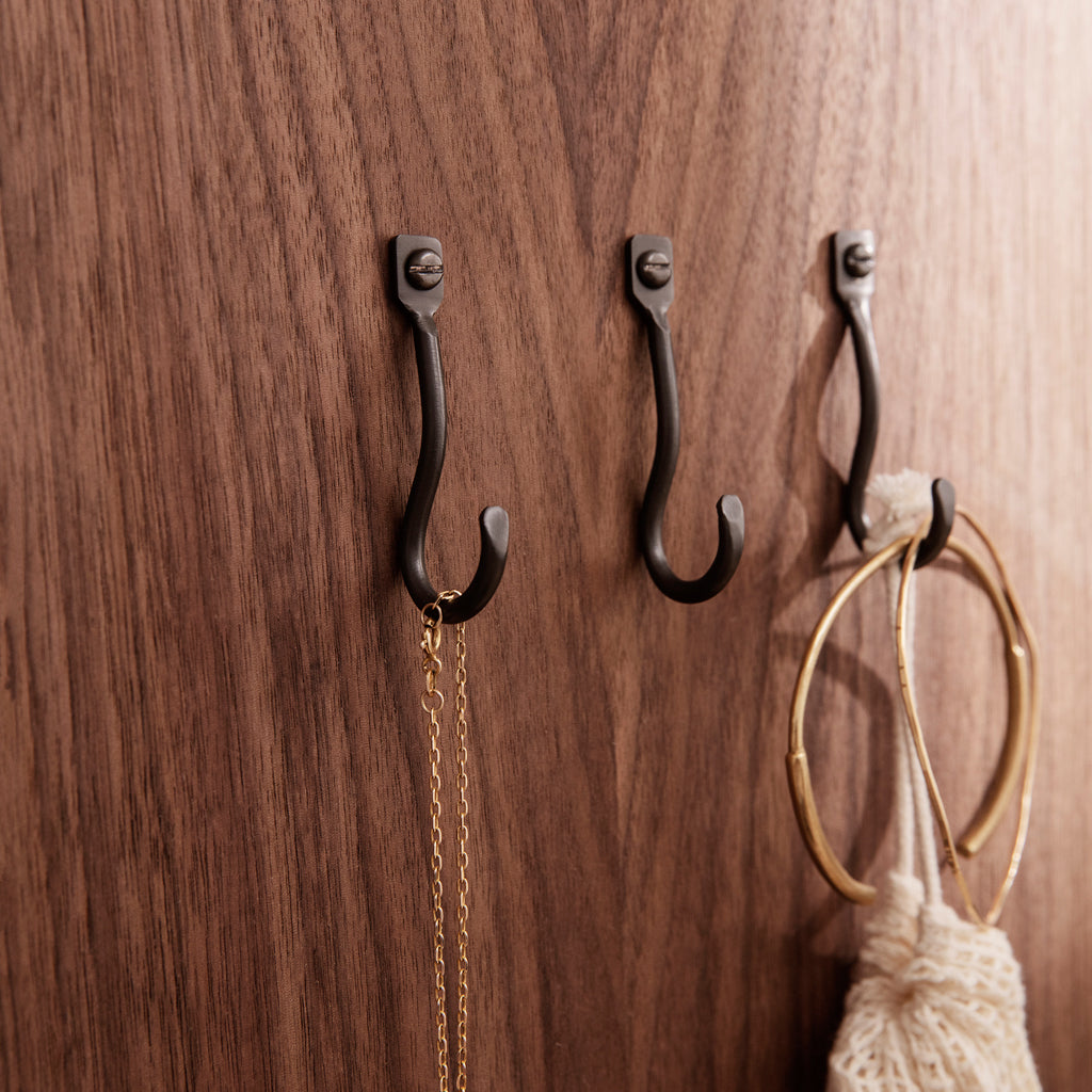 Curvature is a series of organically shaped accessories for the home that have been hand formed in pure, solid blackened brass with a matte finish. The whimsical curves juxtapose the solidity of the material, and make a feminine, functional addition to any bedroom, bathroom, hallway or kitchen. The Curvature Mini Hooks are an ornamental yet elegantly simple hook, perfect for hanging up your everyday essentials. Crafted by hand, no two hooks are 100% identical.