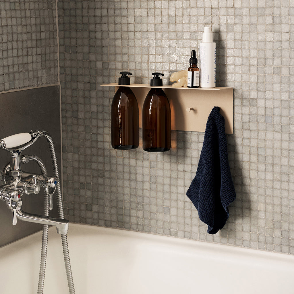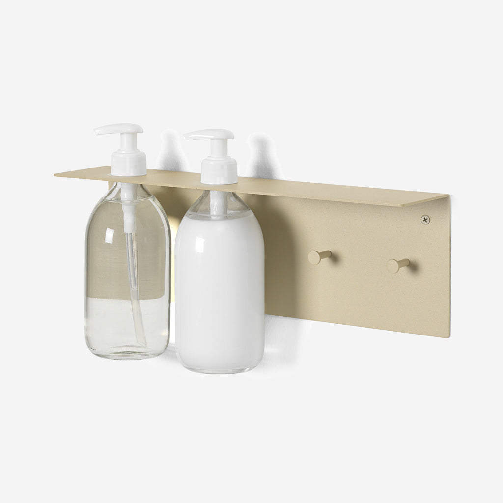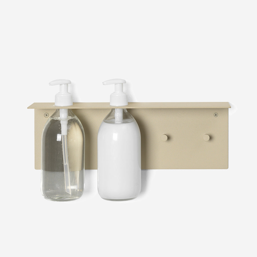 The Dora family is a series of furnishings that are ideal for the bathroom. Made from powder-coated stainless steel, the simple yet functional designs are rust-resistant, so are ideal for use in damp conditions. The Dora Bathroom Shelf features two holes for your favourite pump bottles, allowing you to smartly suspend them from the wall, as well as two hooks from which you can hang brushes or shower sponges. Mount the minimalistic shelf on your bathroom wall to add a modern, functional element to your bathroom space.
