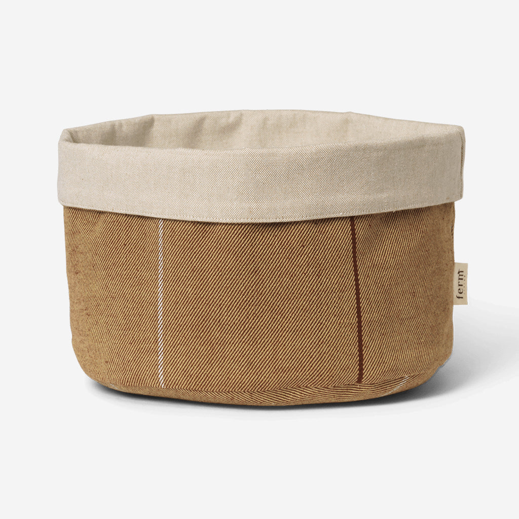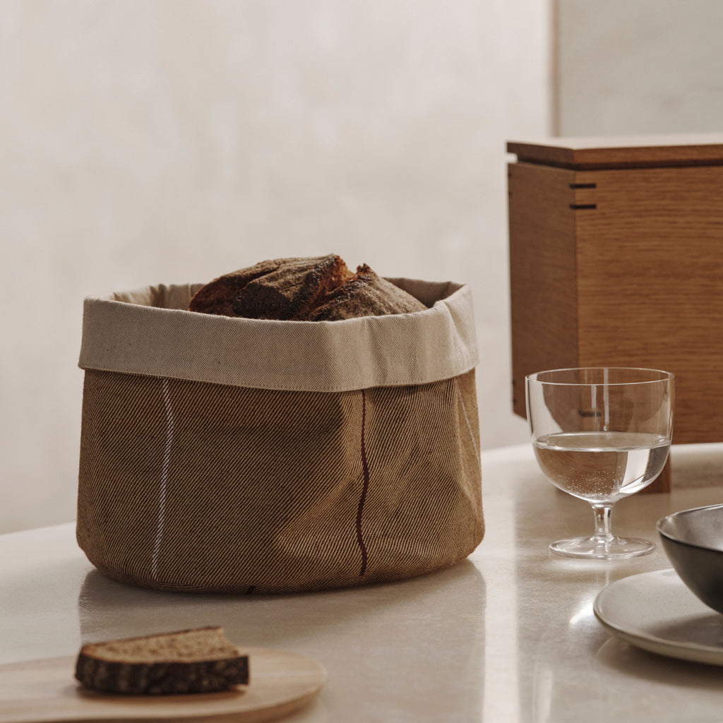 The Ito Family presents a contemporary interpretation of traditional kitchen textiles. The Ito Kitchen Basket is a reversible fabric storage solution that is perfect for any kitchen. Crafted from GOTS-certified organic cotton, it features a delicate stripe design with bold colours intersecting a two-tone twill weave. The reverse side showcases a natural cotton chambray, complementing the vibrant palette. This multifunctional basket can be used to store household essentials such as bread, onions, and other pantry items while adding a touch of modern elegance to your kitchen decor.