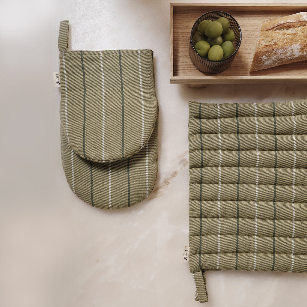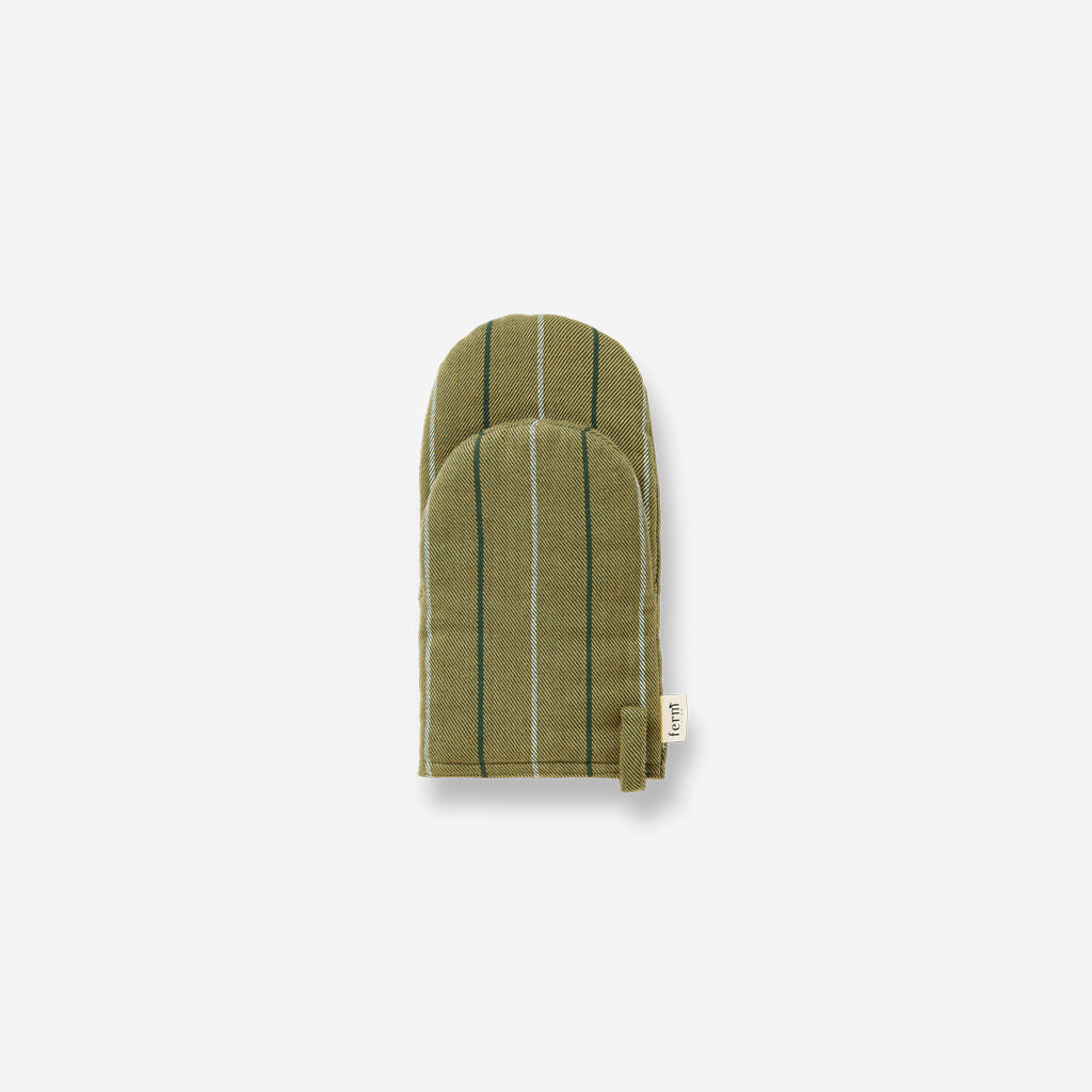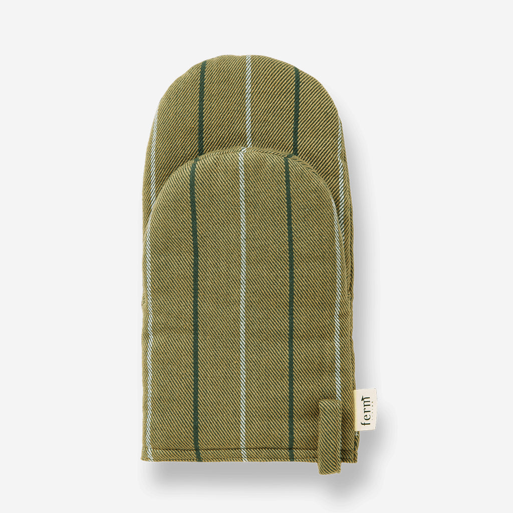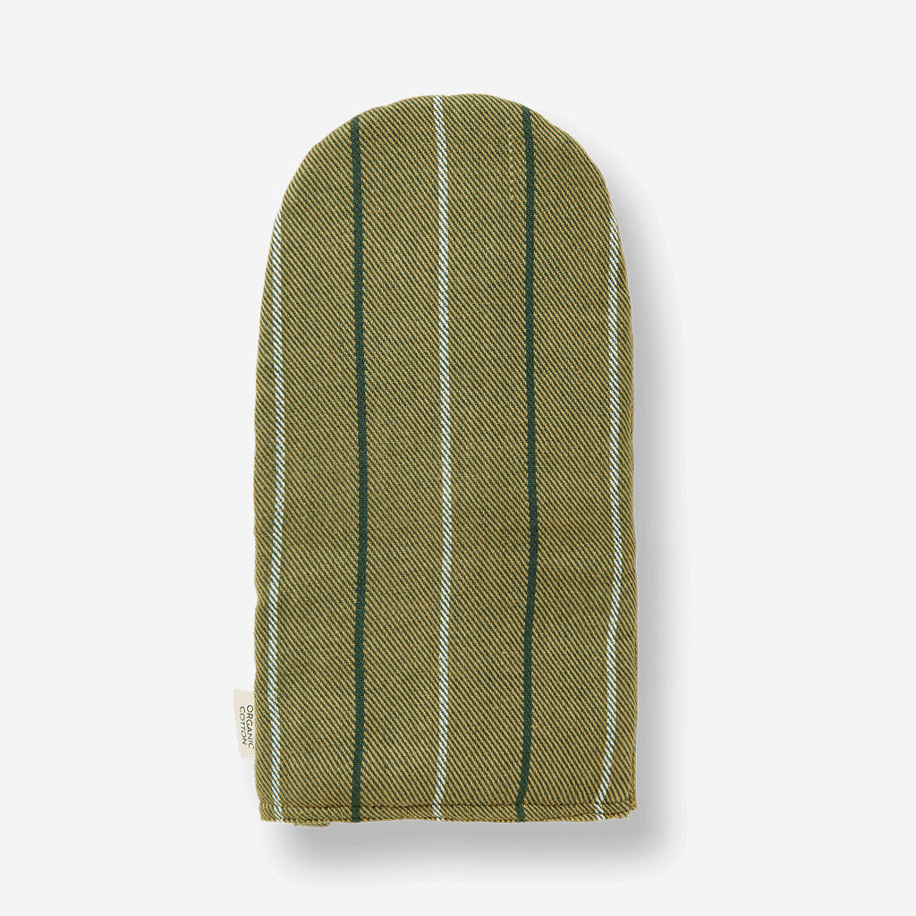 The Ito Family presents a contemporary interpretation of traditional kitchen textiles. Crafted from organic cotton and filled with recycled polyester, this oven mitt features a delicate stripe design intersected by a two-tone twill weave. The versatile design suits left- and right-handed users, while the padded inner lining ensures protection from heat. Perfect for any kitchen, it adds a charming pop of colour to your space and provides everyday functionality.