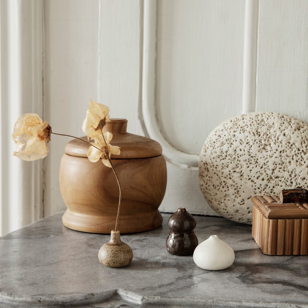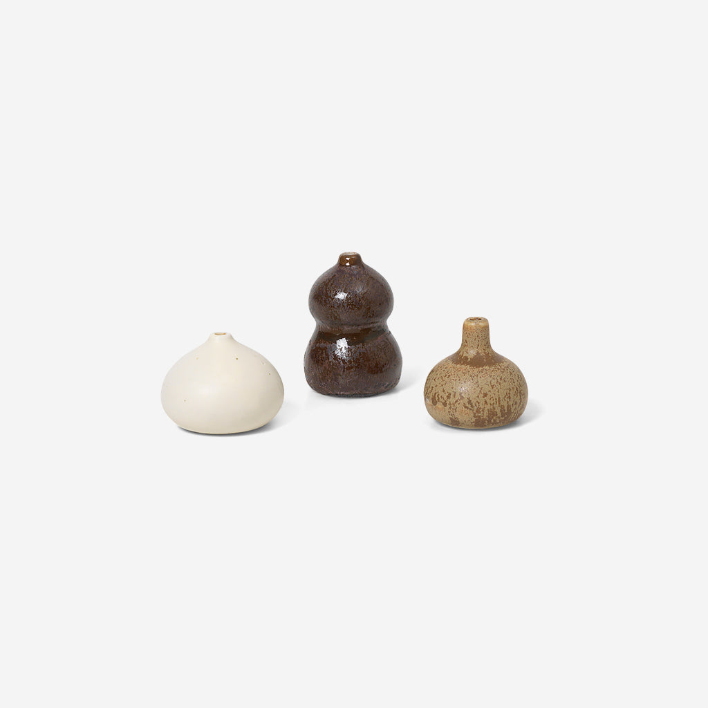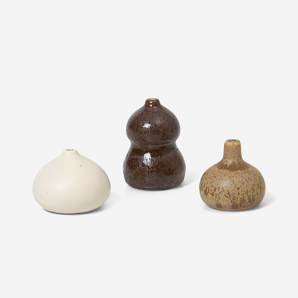 Create a decorative still life with the family of Komo Mini Vases. The small, chubby vases come in a set of three that all have their own reactive glaze, giving each of them a unique expression. Use them on your favourite bookshelf together with other cherished objects, on the table with single stem flowers or place a tray underneath to use them for incense sticks.