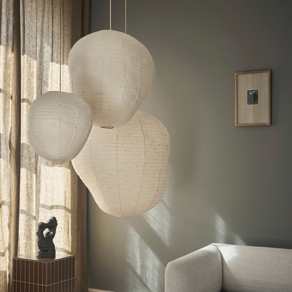 The Kurbis Lampshade presents a charming twist on the classic rice paper lantern. Crafted from characteristically rich Washi paper, Kurbis deviates from the traditional round shape, instead embracing an organic and asymmetric silhouette that gives it a distinctive and unique look. Inspired by the pumpkin and squash family, the rice paper lampshade emanates a soft and gentle light that adds ambiance and charm to any room.